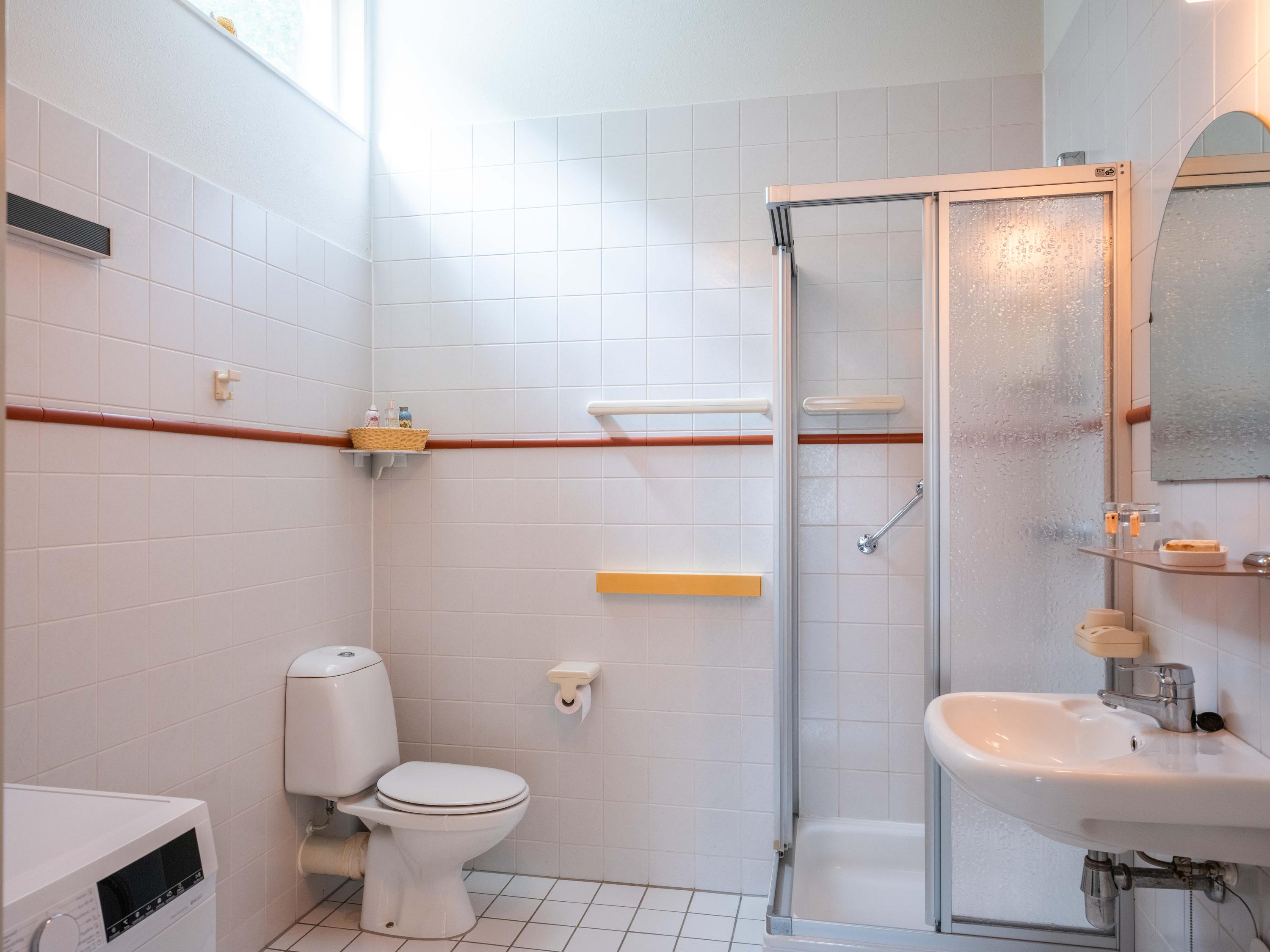 On the ground floor, you will also find a spacious room on the garden side, which can be used as an office, but is also ideal as a bedroom. The bathroom on the ground floor has a bathtub with shower, double sink, and toilet.