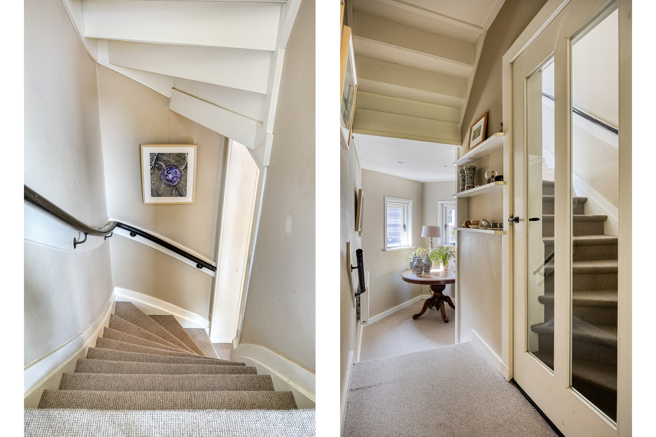The generous living room with bay window, wood-burning stove, original built-in cabinets and characteristic beamed ceiling exudes atmosphere and authenticity. The living room, kitchen and TV room all feature an original fireplace. The deep cellar is also accessible from the hallway, ideal for wine storage.