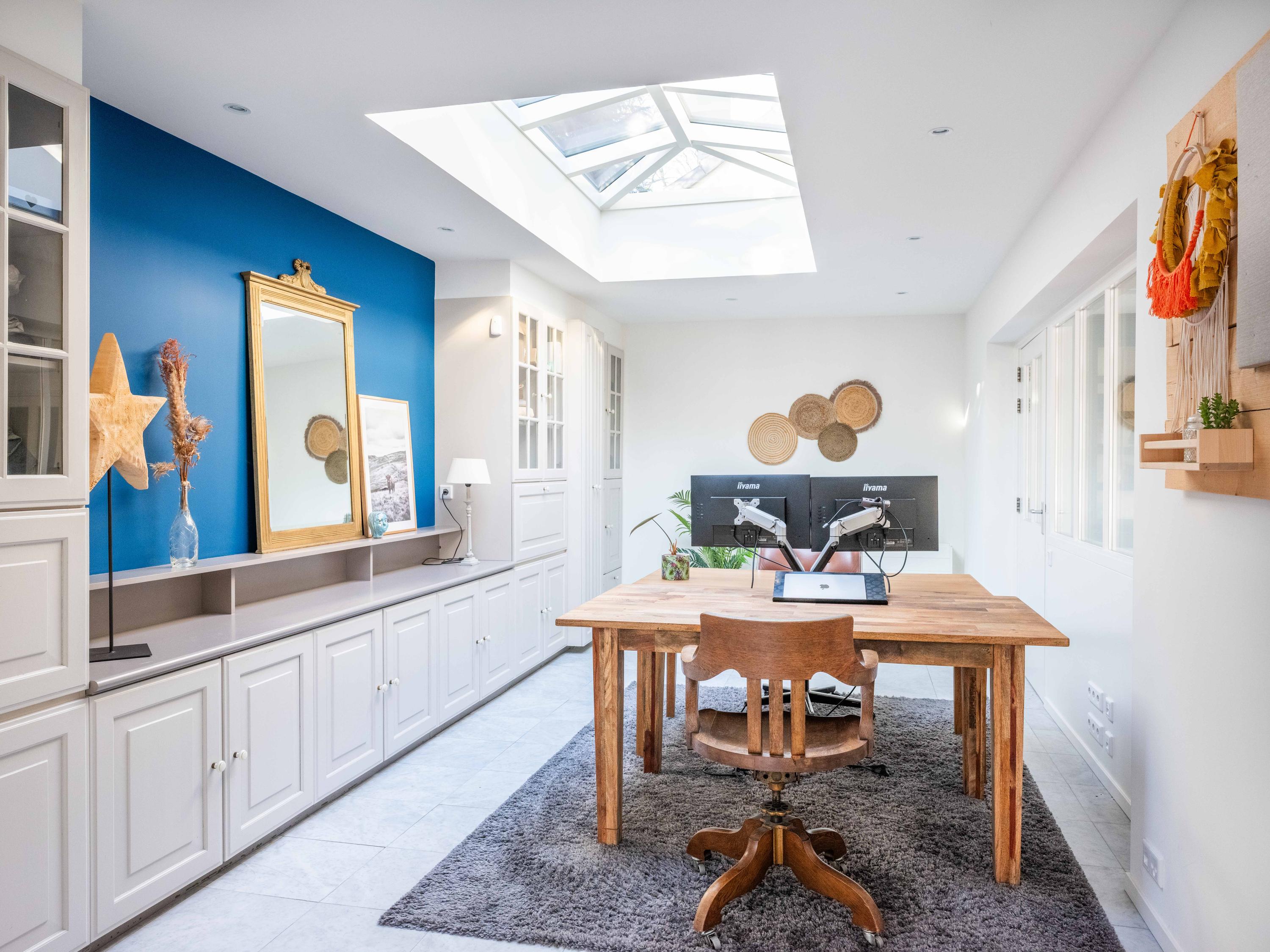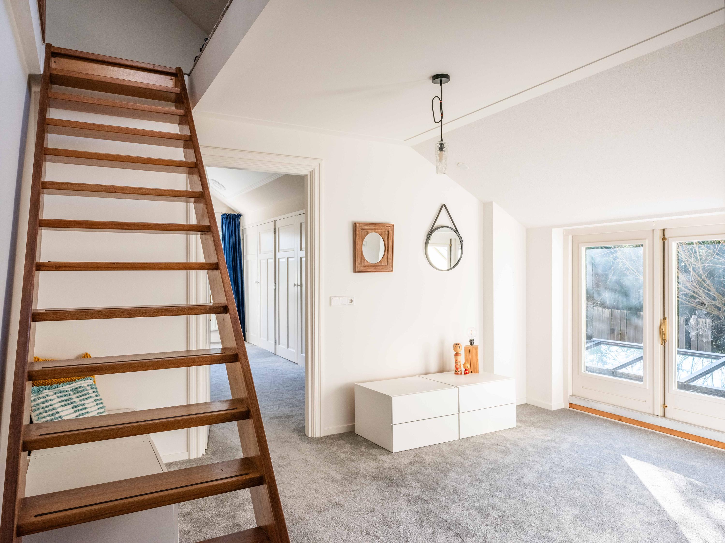 We find the very spacious, bright living room on the other side of the hall, with a cosy fireplace and sliding doors to a sunny terrace. Furthermore, on the ground floor, adjacent to the living room, we find an enclosed office/workspace with an adjoining laundry room with washing machine and dryer connections neatly concealed in a closet. From this room there is a sliding door giving access to the garden and terrace.