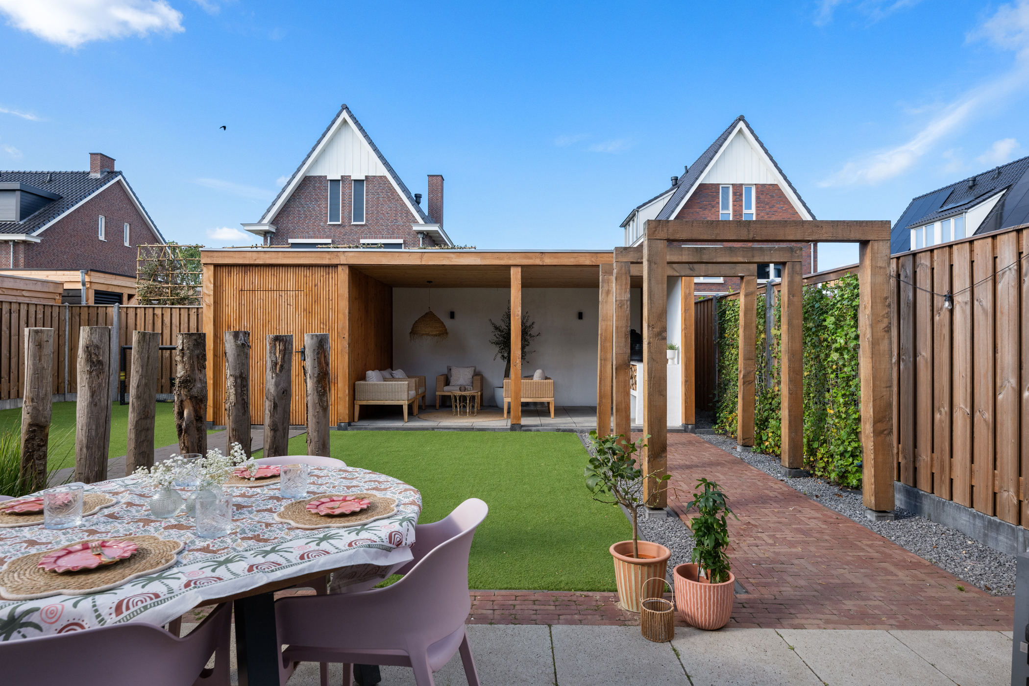 At the back is a charming covered area with storage: the perfect place to spend long evenings outdoors and enjoy the real outdoor life all year round.