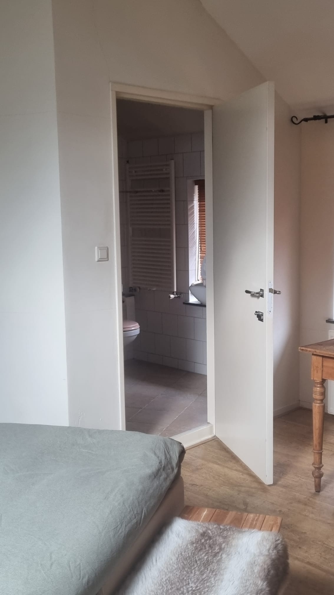 On the ground floor, the entrance opens into a spacious living room with air conditioning and a fireplace, complemented by wide doors leading directly to the garden and sunny patio. Adjacent to the kitchen equipped with built-in appliances lies a utility room and indoor storage. The massief oak flooring throughout the main level introduces warmth, while an extra versatile room opens onto the garden, providing possibilities for home office or creative pursuits.