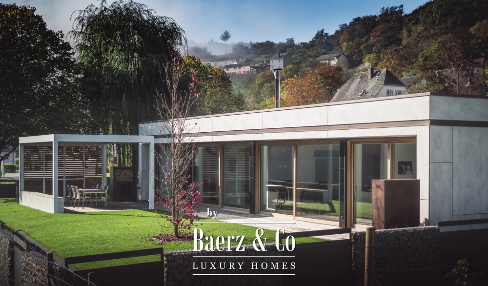 This bungalow Bivels Luxembourg offers a measured approach to riverside living. Arranged across 138 m² and set within a 600 m² plot, the property comprises three bedrooms and six rooms, providing a calm and refined environment. Large sliding windows welcome light and open to river and countryside views that form the rhythm of daily life.