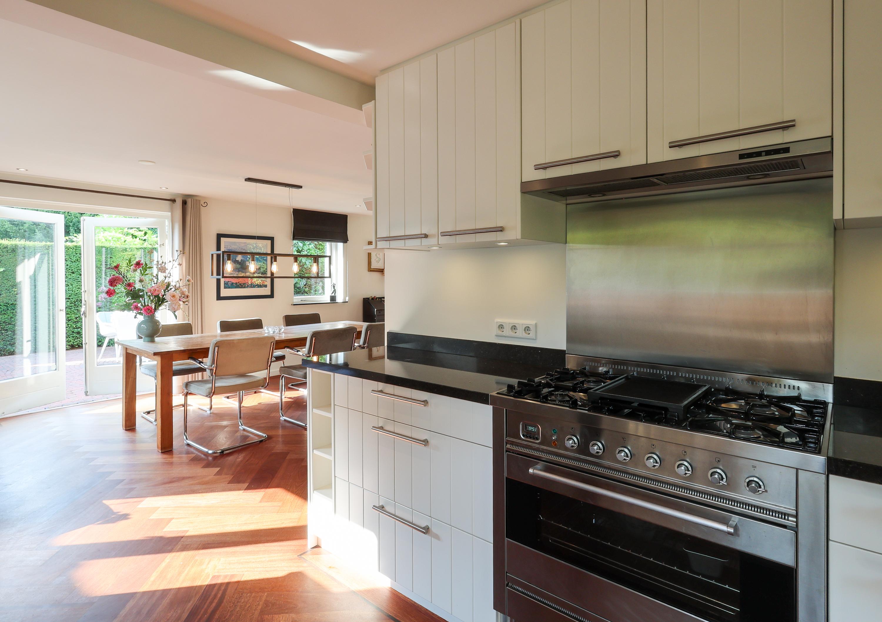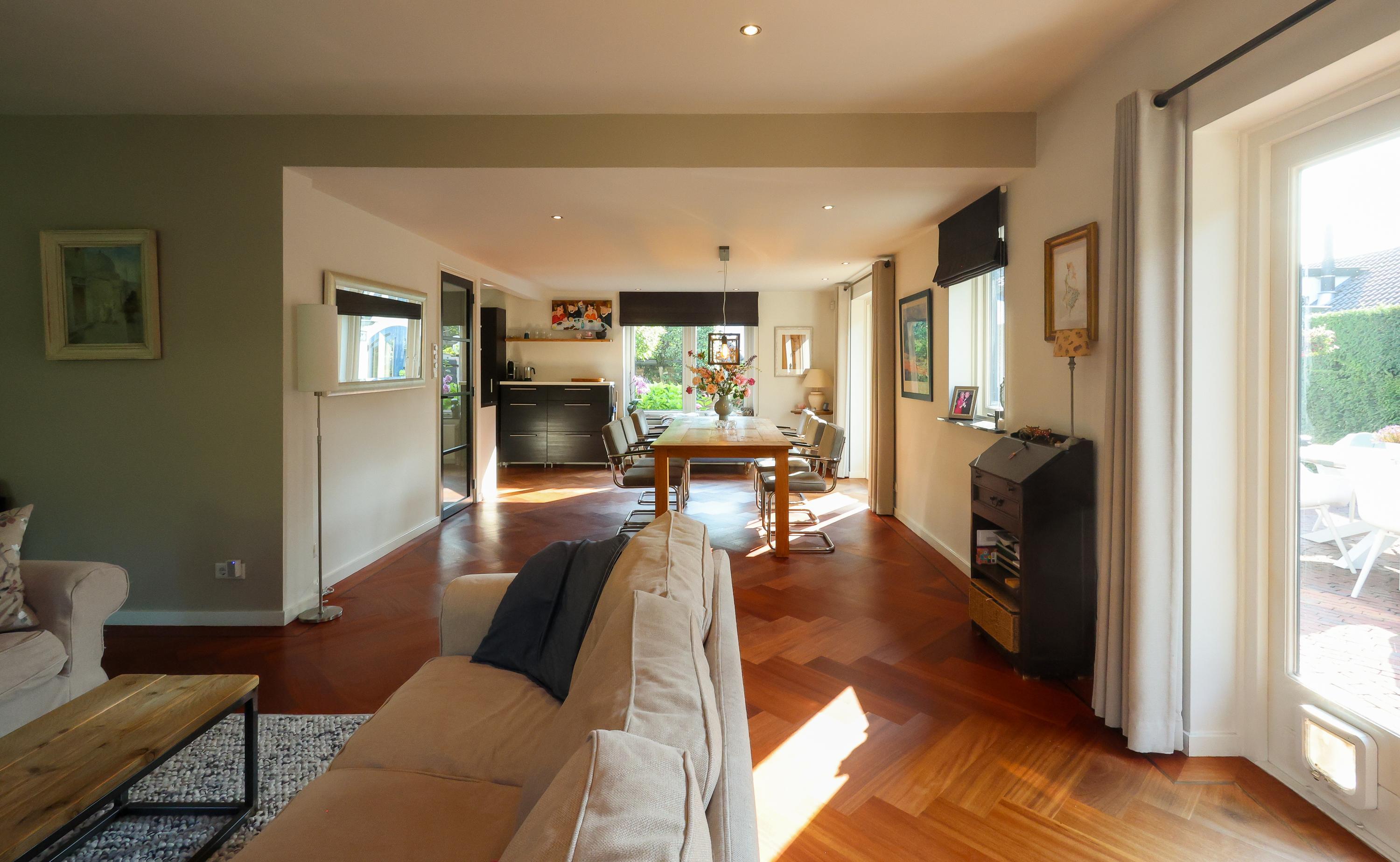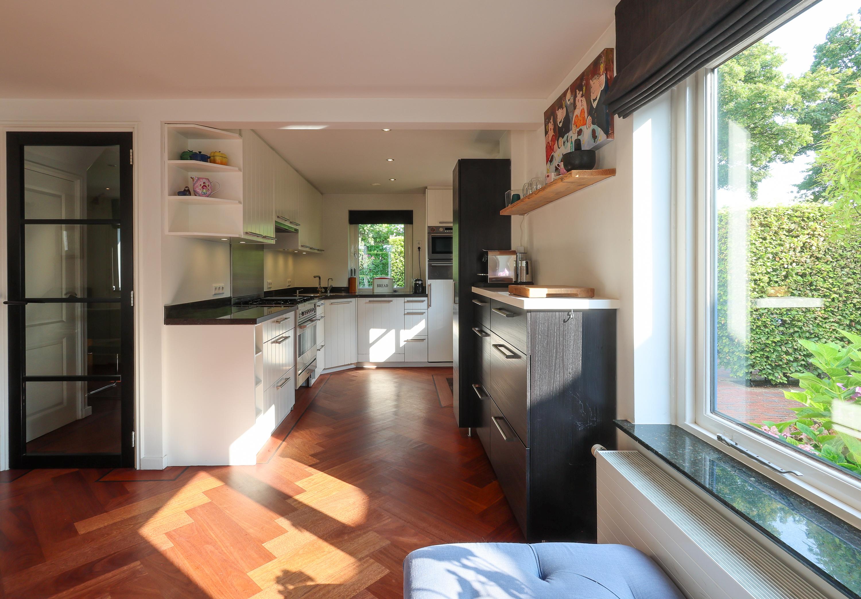 Inside, you are welcomed into a hallway with a guest toilet (although, as is customary in Blaricum, you'll likely enter through the back door). The bright L-shaped living room spans the entire rear of the house and features a parquet floor and gas fireplace perfect for long evenings or sunny afternoons with the French doors open to the garden. The open-plan kitchen is modern and functional, equipped with built-in appliances and a back door leading to the inner garden. A full-height basement offers additional storage space and room for a washer and dryer.