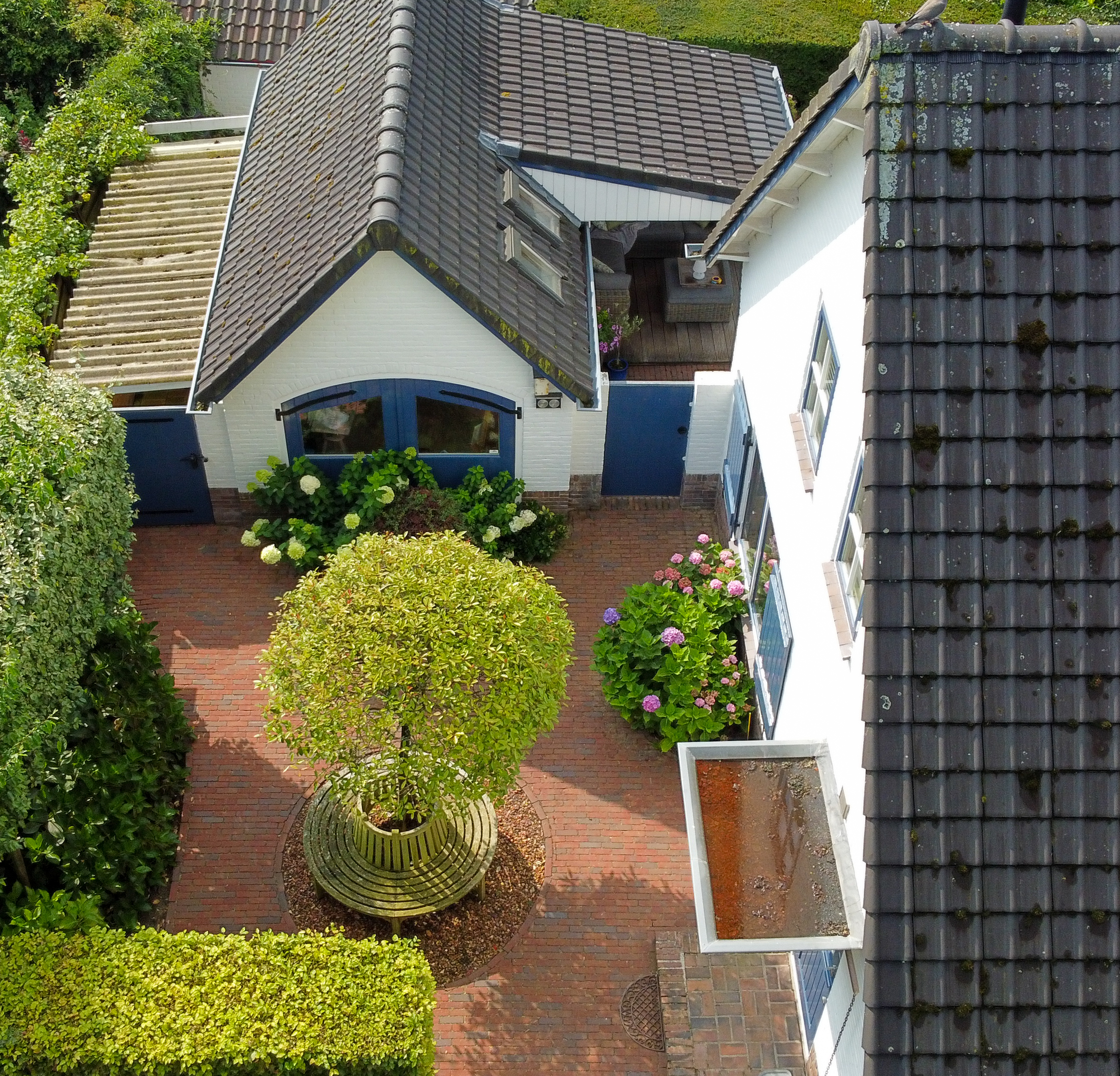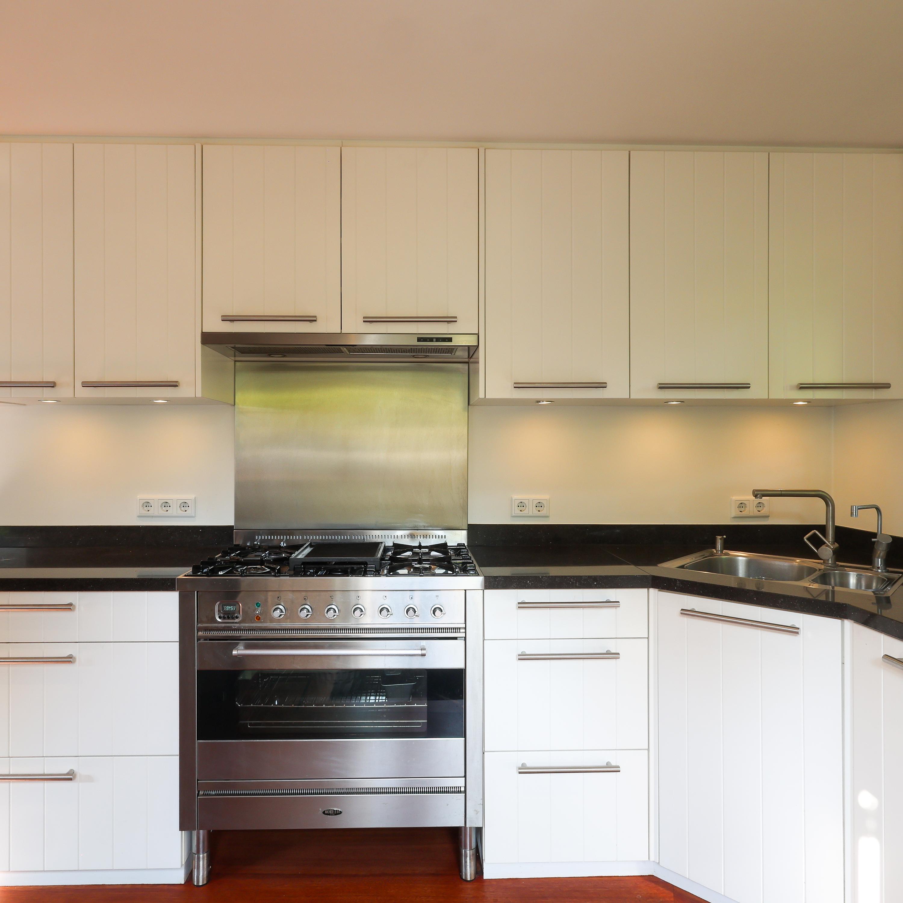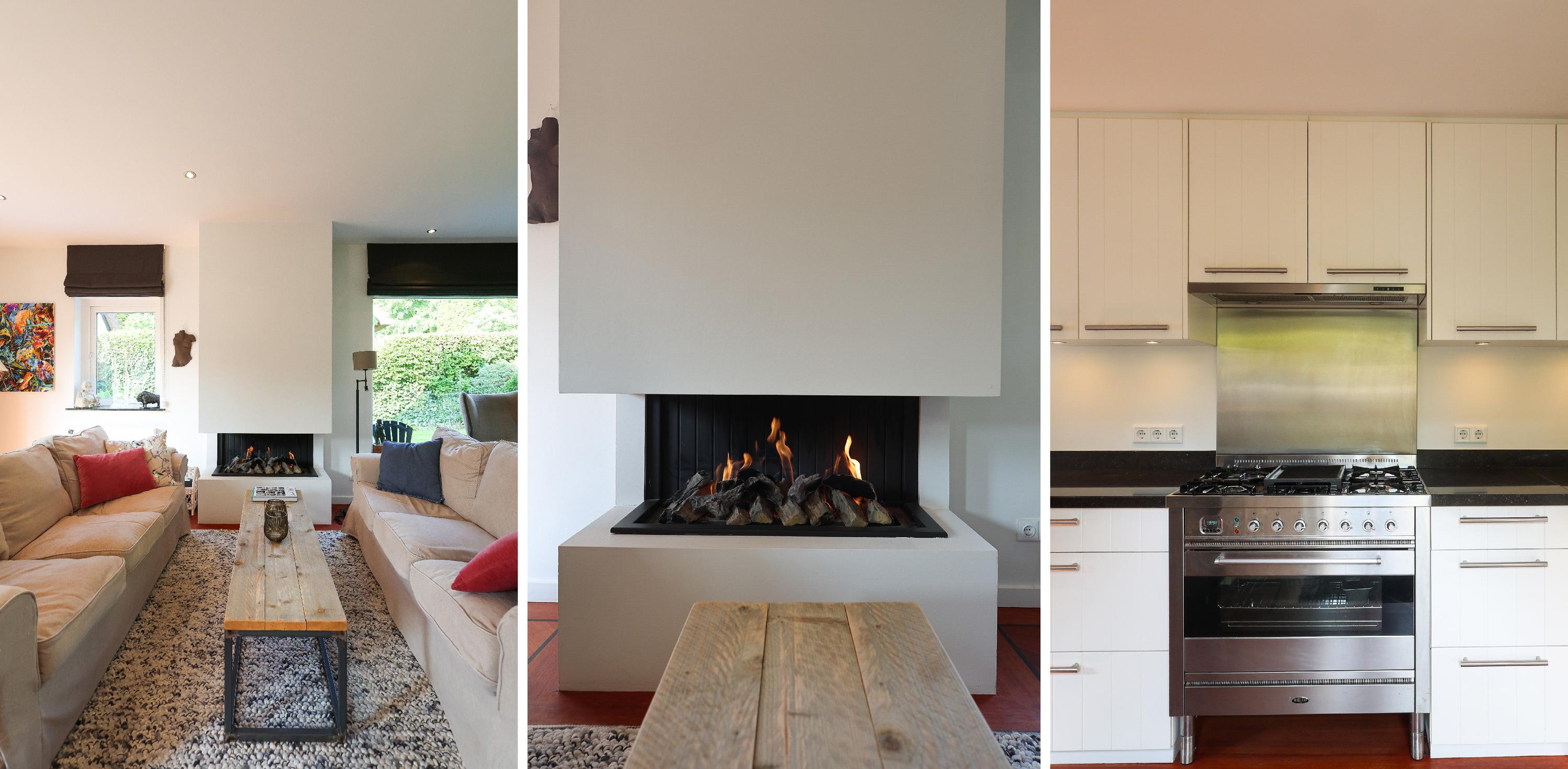 Inside, you are welcomed into a hallway with a guest toilet (although, as is customary in Blaricum, you'll likely enter through the back door). The bright L-shaped living room spans the entire rear of the house and features a parquet floor and gas fireplace perfect for long evenings or sunny afternoons with the French doors open to the garden. The open-plan kitchen is modern and functional, equipped with built-in appliances and a back door leading to the inner garden. A full-height basement offers additional storage space and room for a washer and dryer.