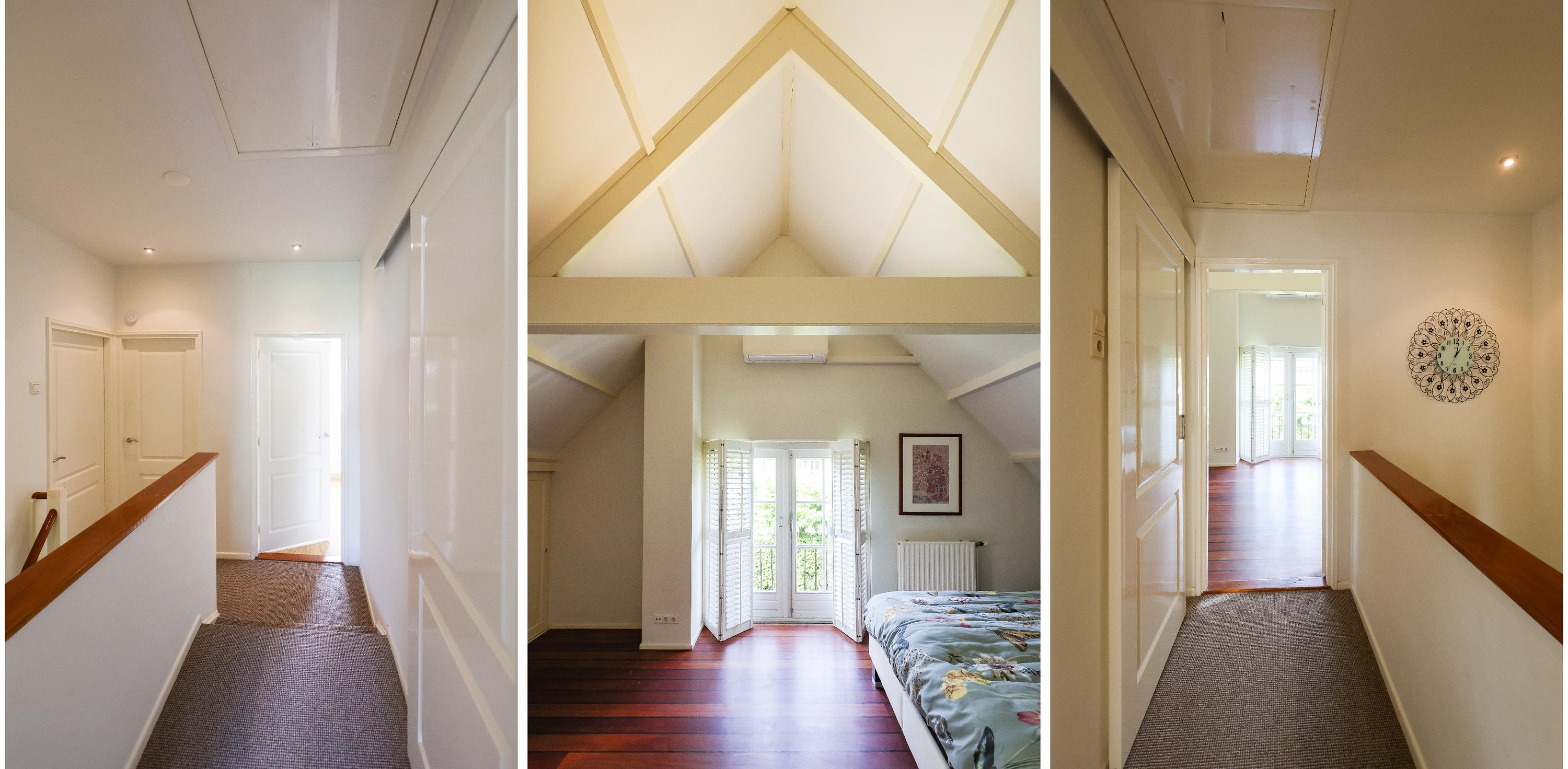 Upstairs, you’ll find a spacious master bedroom with vaulted ceiling, built-in wardrobes, and French doors opening onto the balcony. There are two additional bedrooms, one currently used as a walk-in closet, a study and a modern bathroom featuring underfloor heating, a walk-in shower/steam cabin, second toilet, and vanity unit with ample storage.