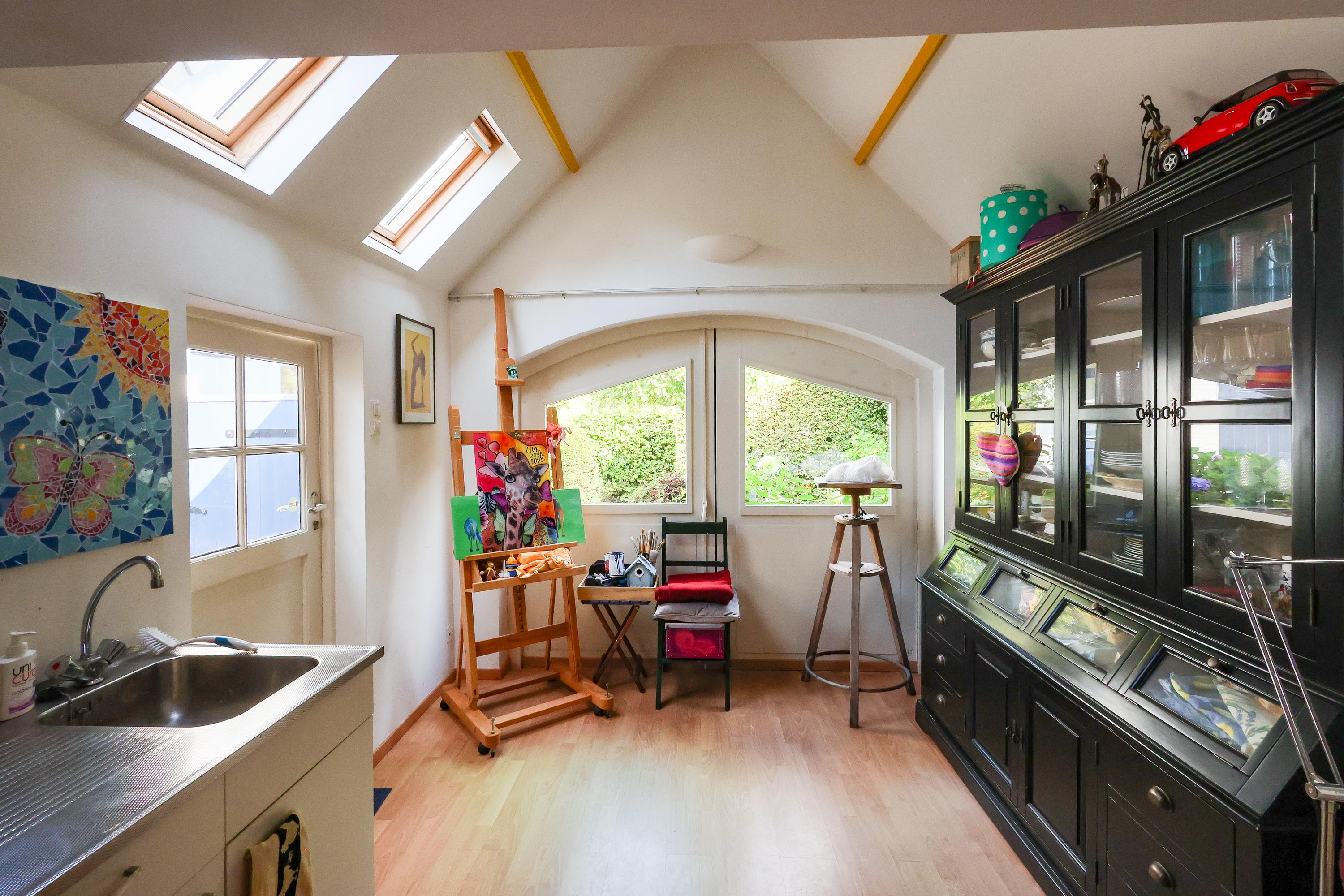 The detached studio of approx. 16 m² — formerly a garage — has been converted into a bright, heated space with water and electricity. An ideal spot for peaceful work or creative pursuits. There is also potential to extend the ground floor towards the studio.