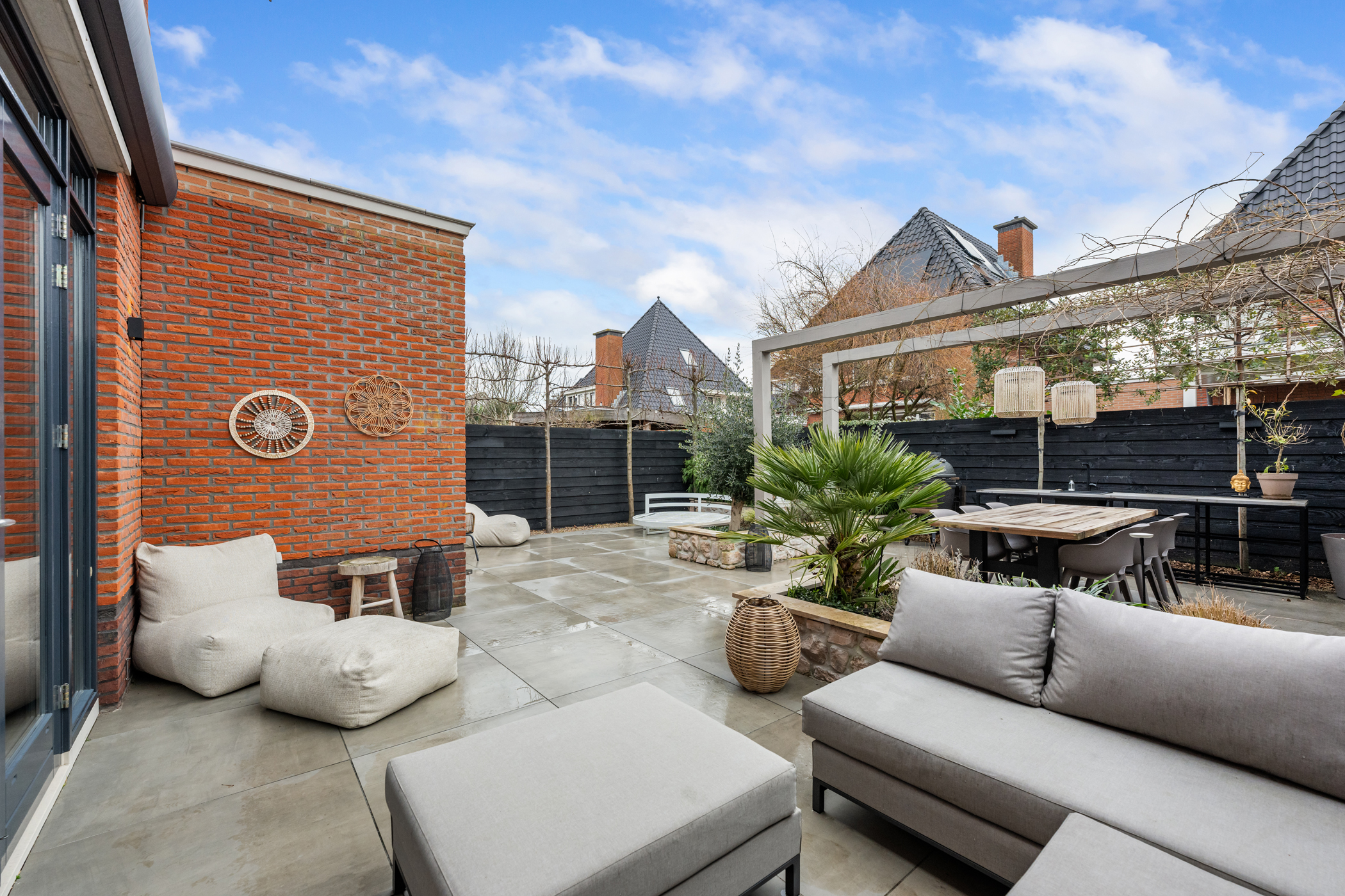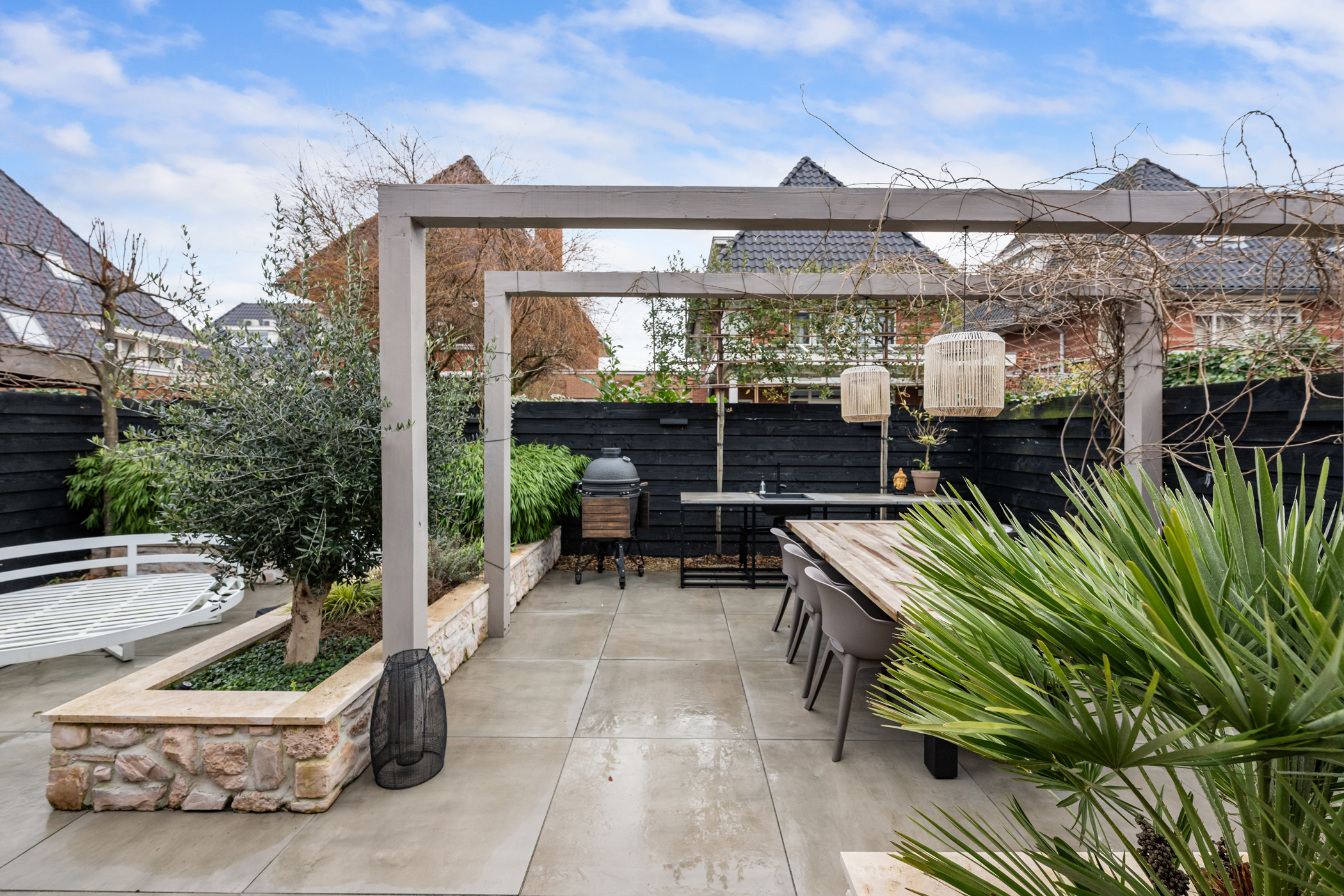 The backyard can be accessed from both the living room and the garage and has been stylishly and professionally landscaped. The Mediterranean atmosphere and subtle Ibiza influences give the garden a relaxed yet elegant feel.