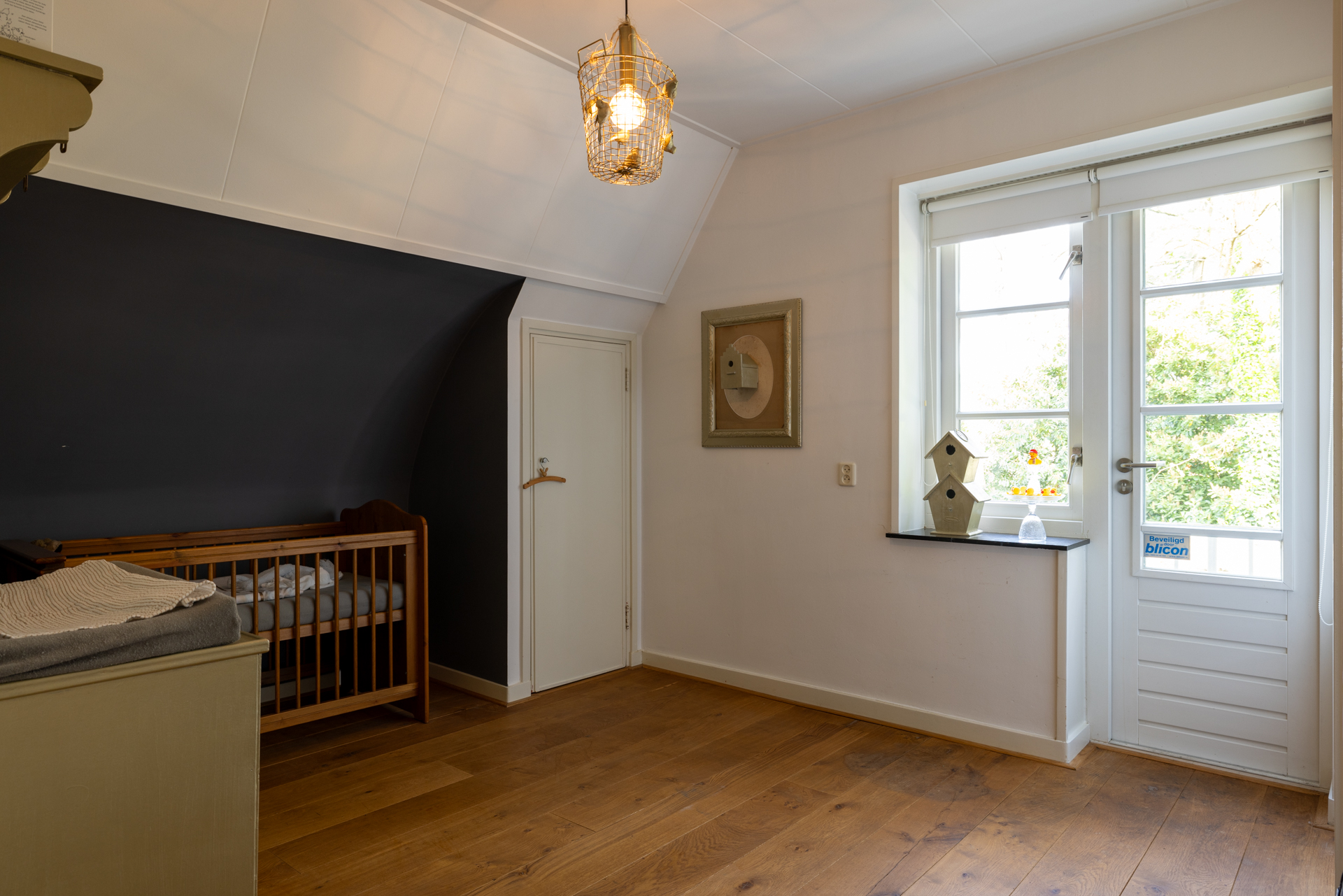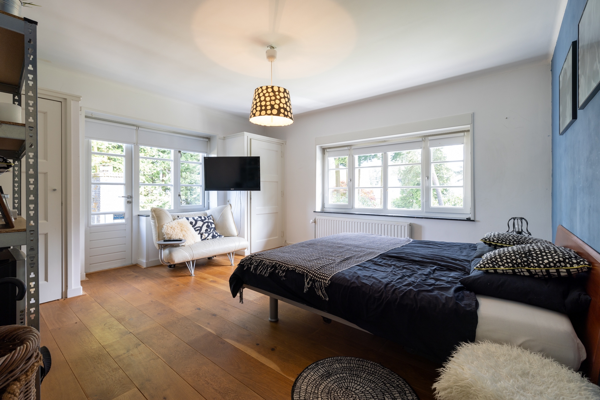 The living room was expanded in 2005. The extension connects nicely to the thatched roof, making the garden doors extra high and offering a fantastic view of the garden. With the windows all around, the living room has a beautiful light. From the living room you have access to the second office / fitness room and through a beautiful sliding door to the kitchen.