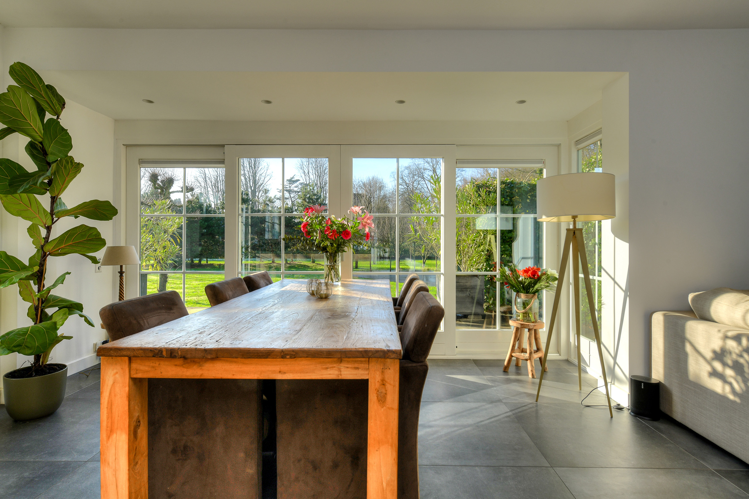 Located on the right side of the house, the living room overlooks the Liesbos forest. The sitting area is at the front, where a stylish gas fireplace has been installed.