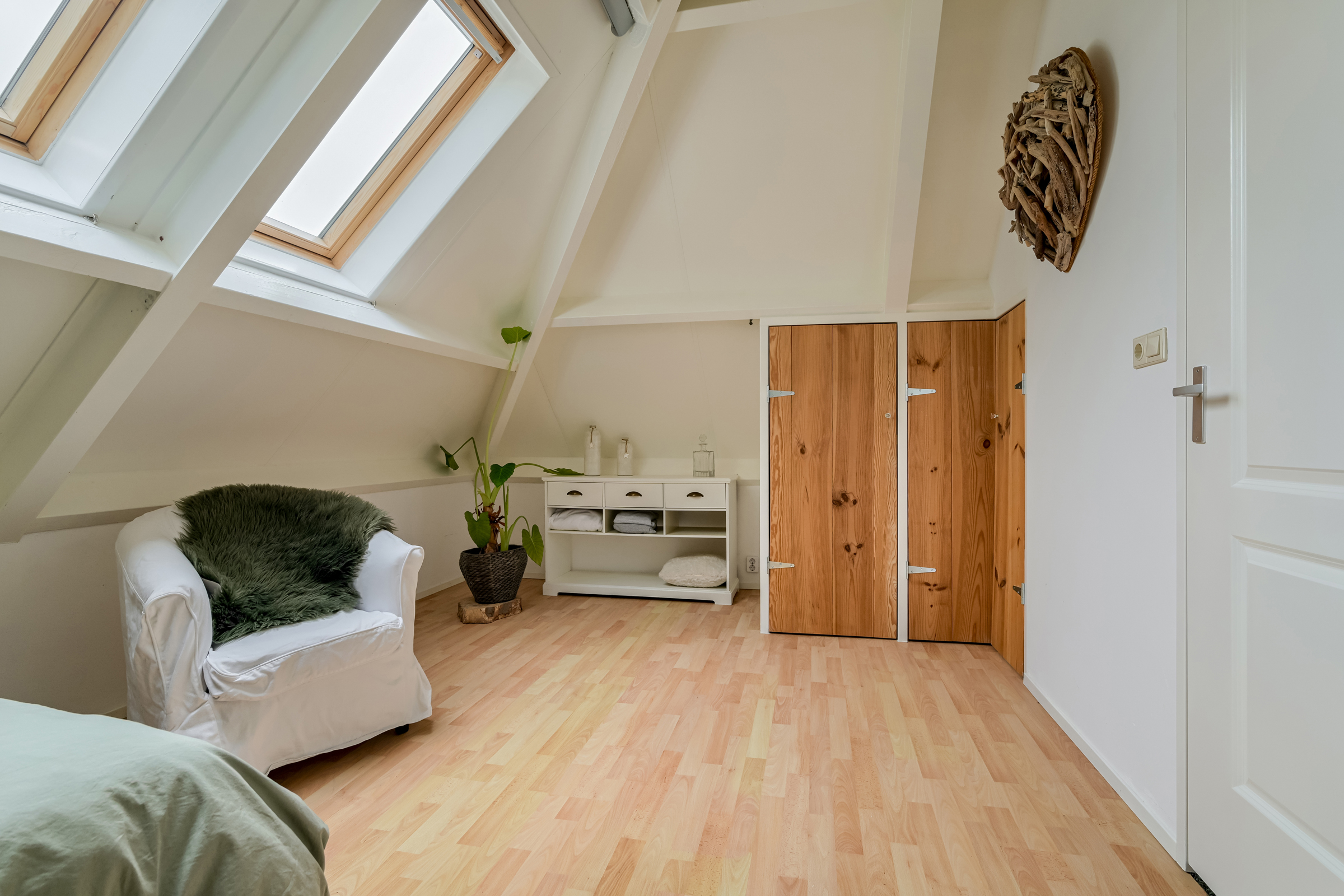 Side bedroom with two Velux roof windows and two built-in wardrobes. This room also provides access to a storage space housing the high-efficiency central heating boiler (circa 2018) and mechanical ventilation unit.