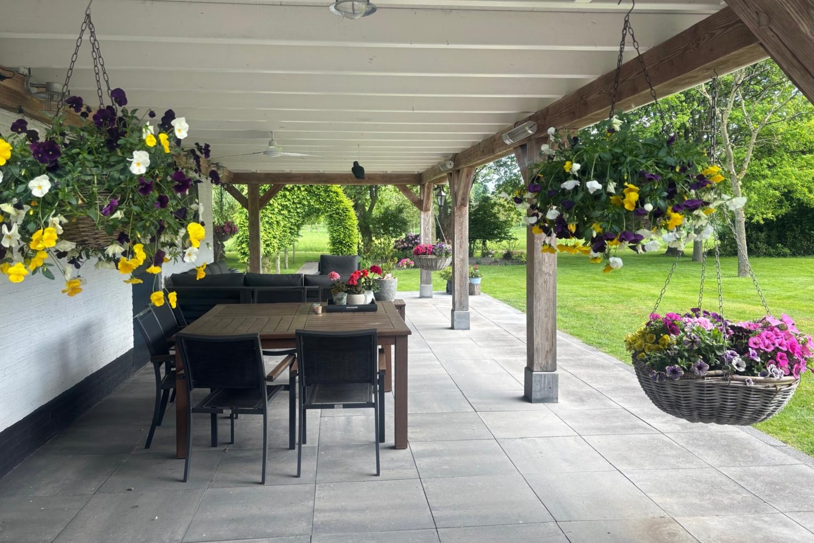 The spacious garden, with adjacent pastureland, offers complete privacy. Behind the house and next to the outbuilding, a stunning veranda has been created—an ideal spot to enjoy the magnificent garden.