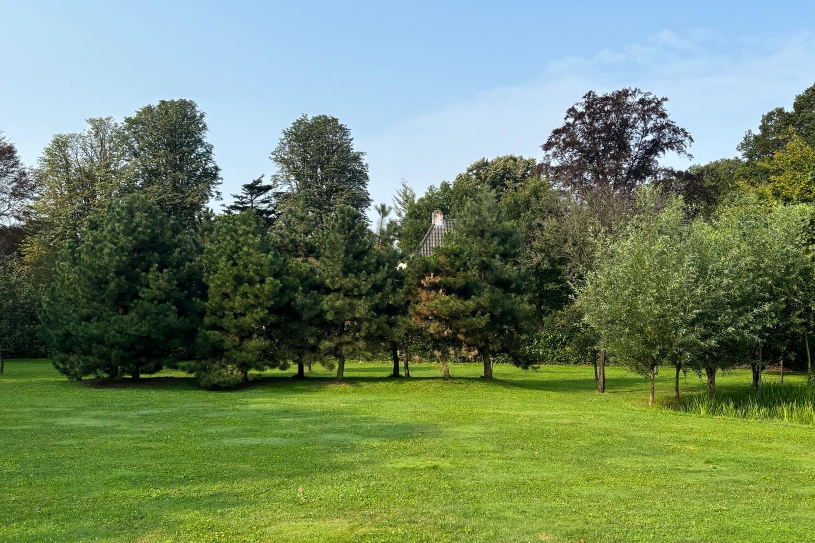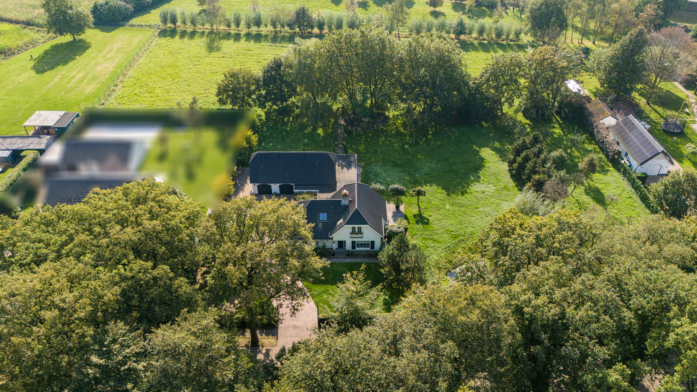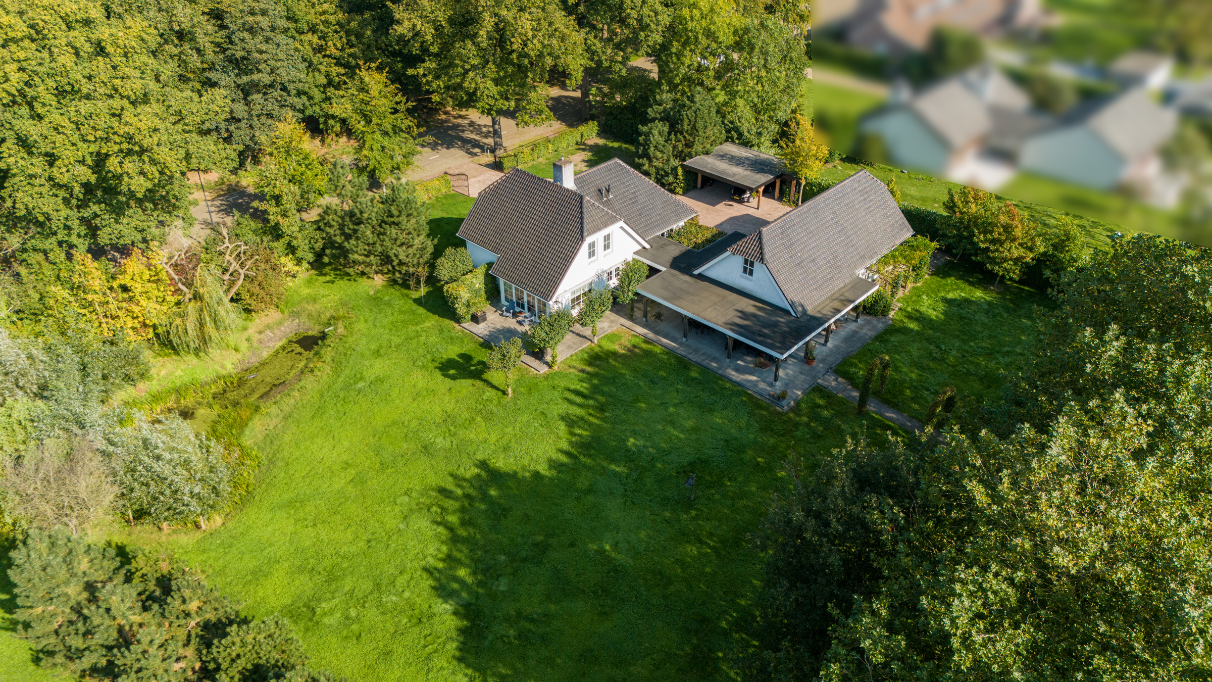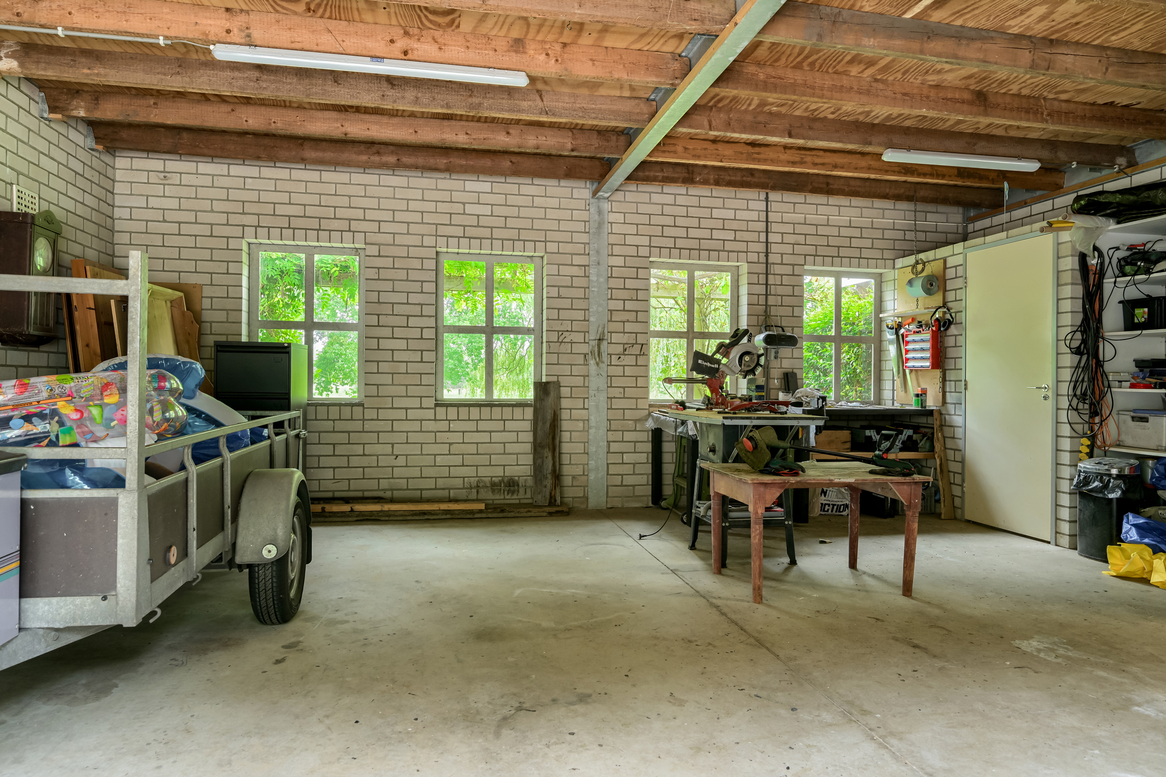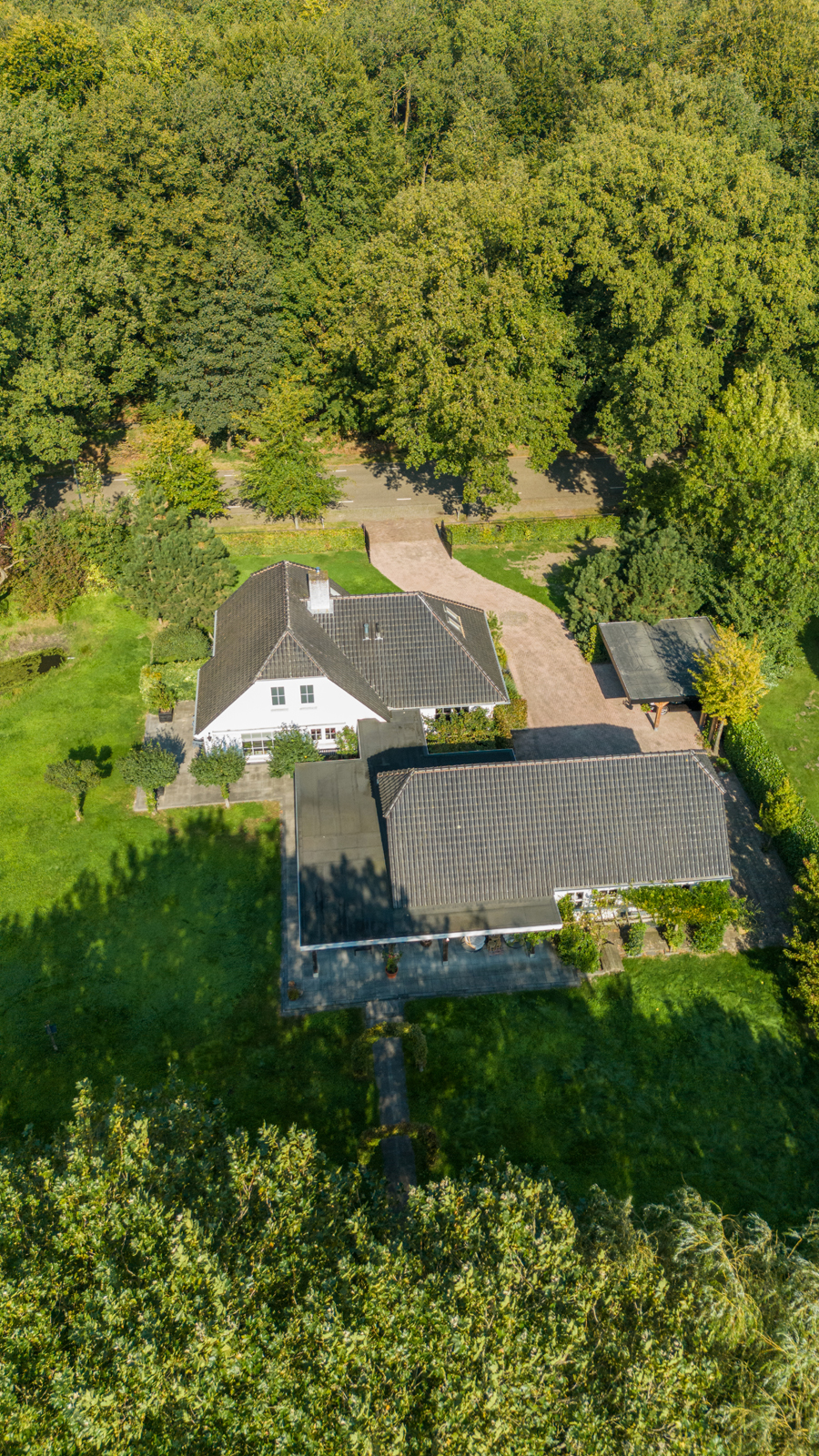 The beautiful, fully enclosed garden surrounds the home, offering maximum privacy and blending seamlessly into the natural surroundings. Several terraces have been laid out around the house with clean-lined concrete tiles. A veranda is situated between the house and the outbuilding and continues alongside and behind the outbuilding, offering wonderful views of the garden. Part of the veranda is equipped with patio heating. The garden includes a large lawn, a fruit orchard, and various trees and hedges. A lovely pond is located next to the house. The driveway, finished with decorative paving, leads to both the carport (space for two vehicles) and the large barn.
