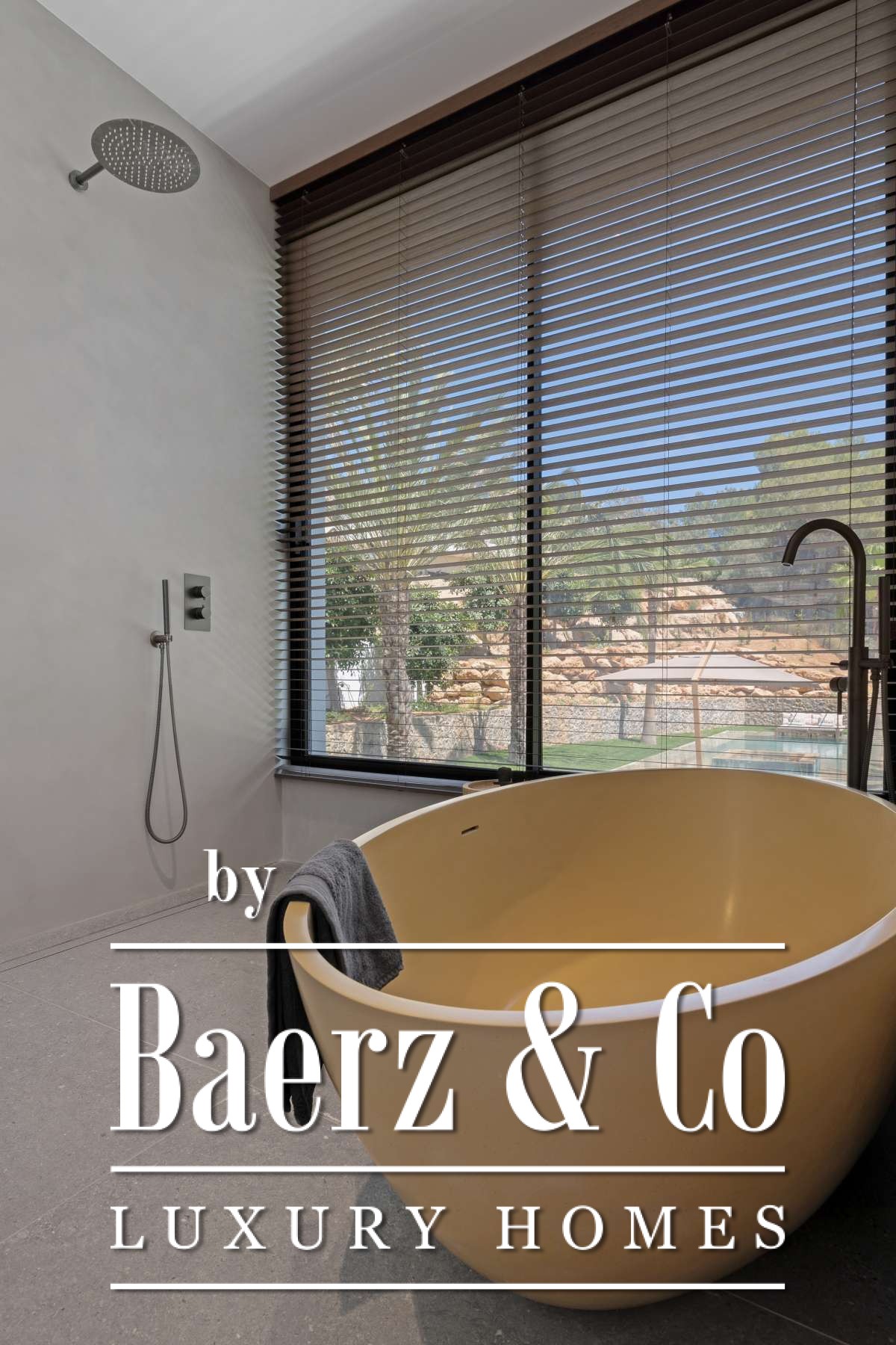 Outdoor living defines Modern villa Can Furnet. The main pool, styled with an integrated jacuzzi and bordered by palms, sets a spa-like tone. Multiple sun lounges, a Bali bed, and integrated seating create zones for relaxation. Ascend to the rooftop terrace to experience panoramic vistas and a second infinity pool, ideal for private entertaining or quiet evenings against the backdrop of Dalt Vila’s skyline. Parking, a secure, fenced perimeter, immaculate finishes, and a fully furnished handover provide immediate ease for those seeking an exclusive lifestyle villa in Ibiza’s vibrant heart.