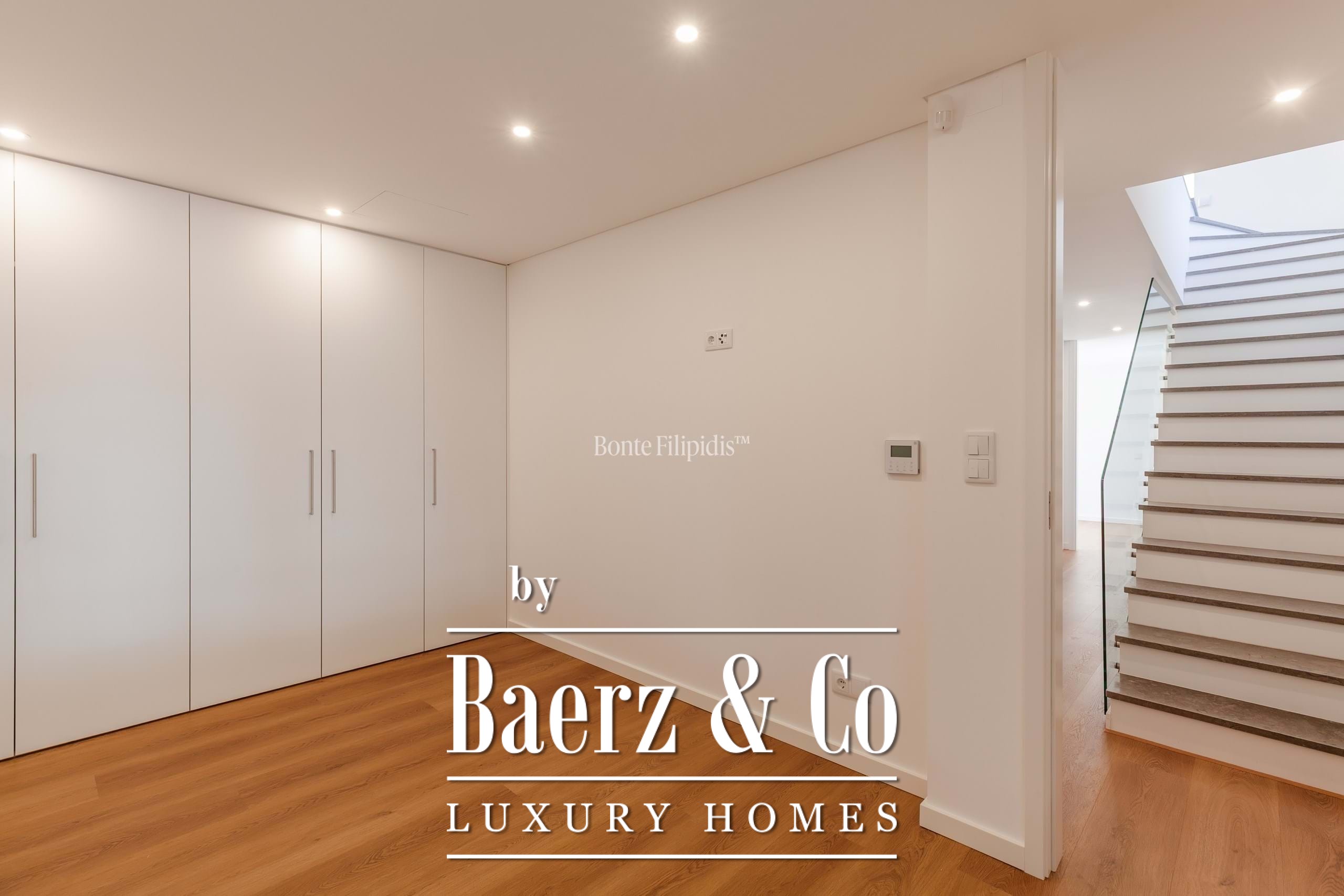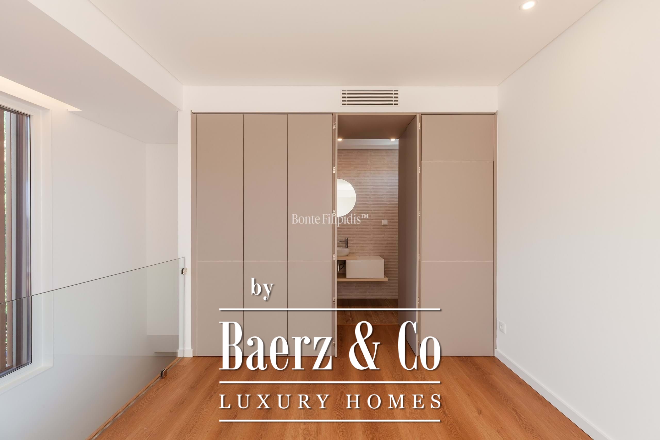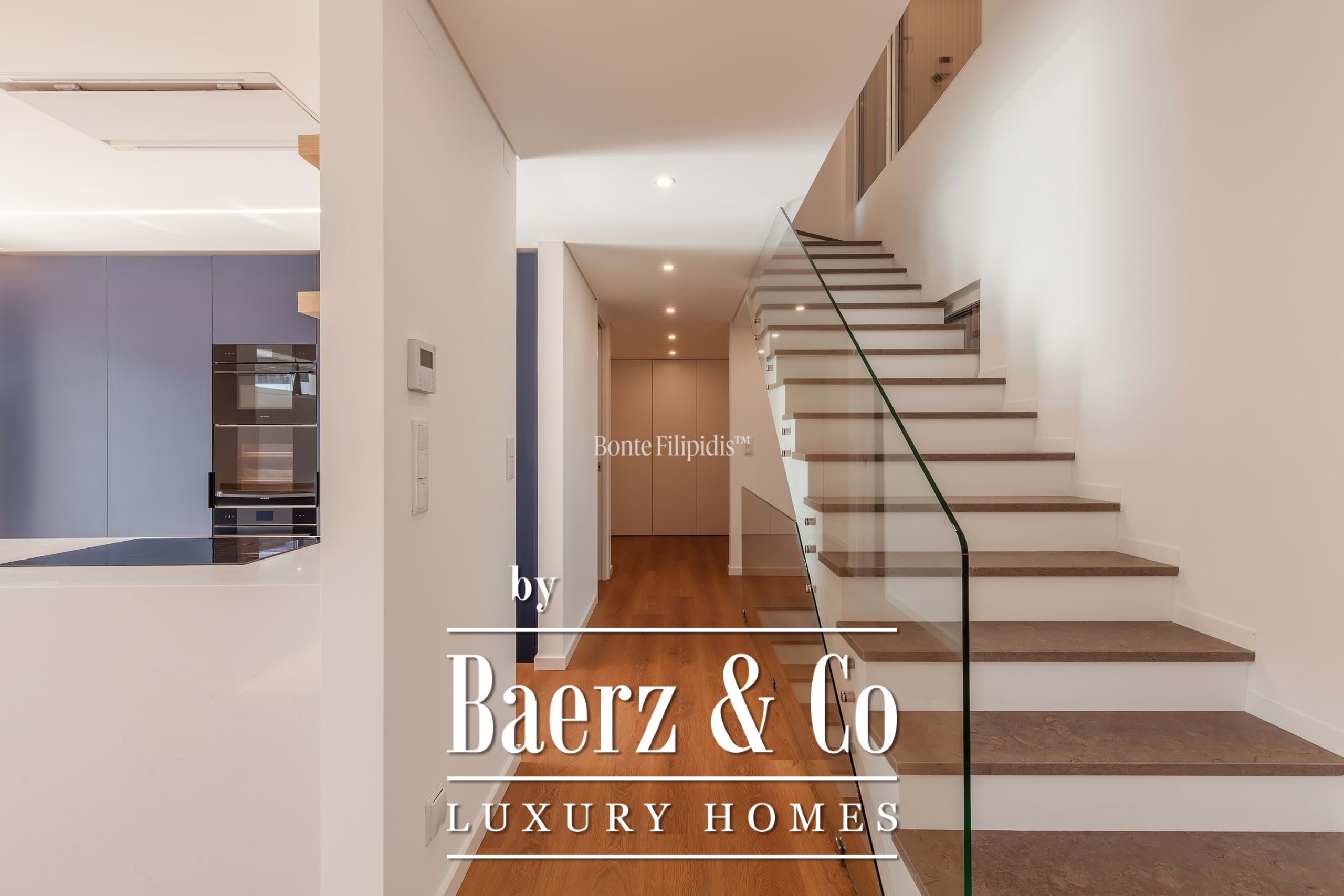 This townhouse Carcavelos e Parede draws on contemporary architecture to create a quietly distinguished living environment, spanning 217 m² across three well-considered floors. The open-plan kitchen, equipped with high-end appliances, connects seamlessly with the living room, inviting natural light while linking interiors to outdoor spaces and the landscaped terrace. An additional suite on the entrance level lends versatility and privacy, suitable for guests or adaptable living.