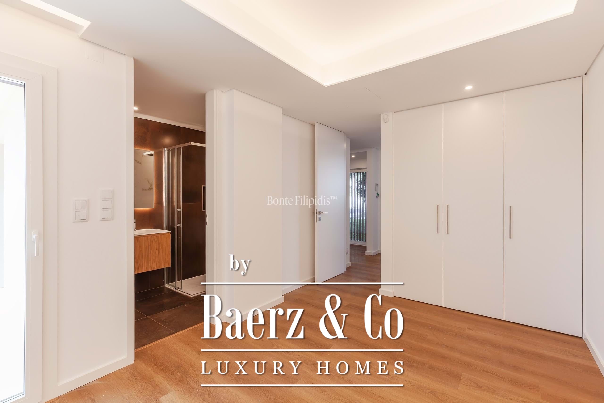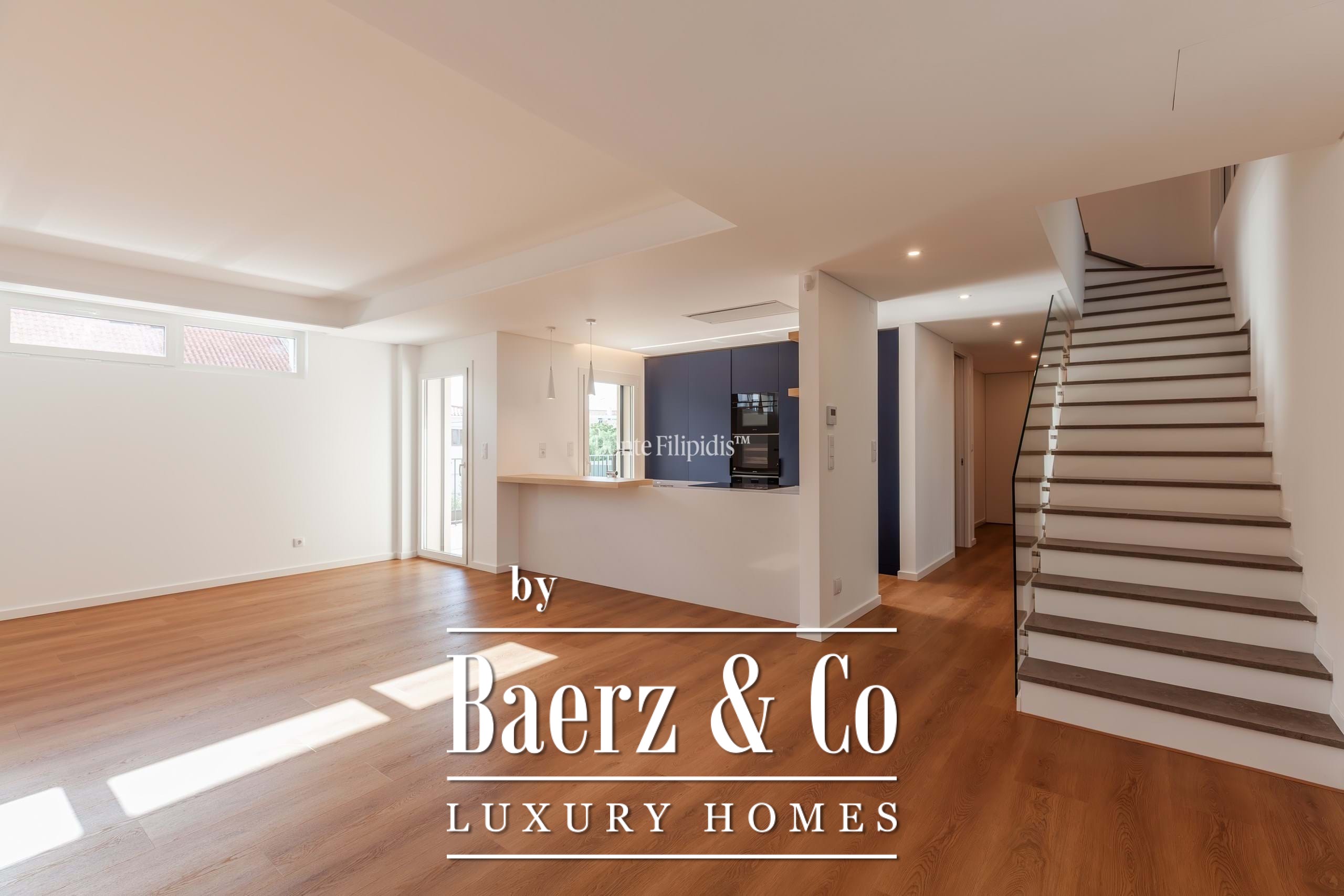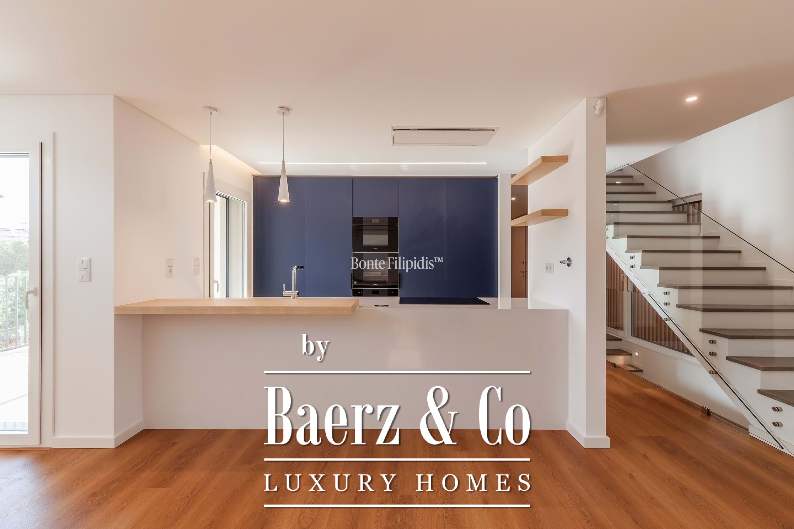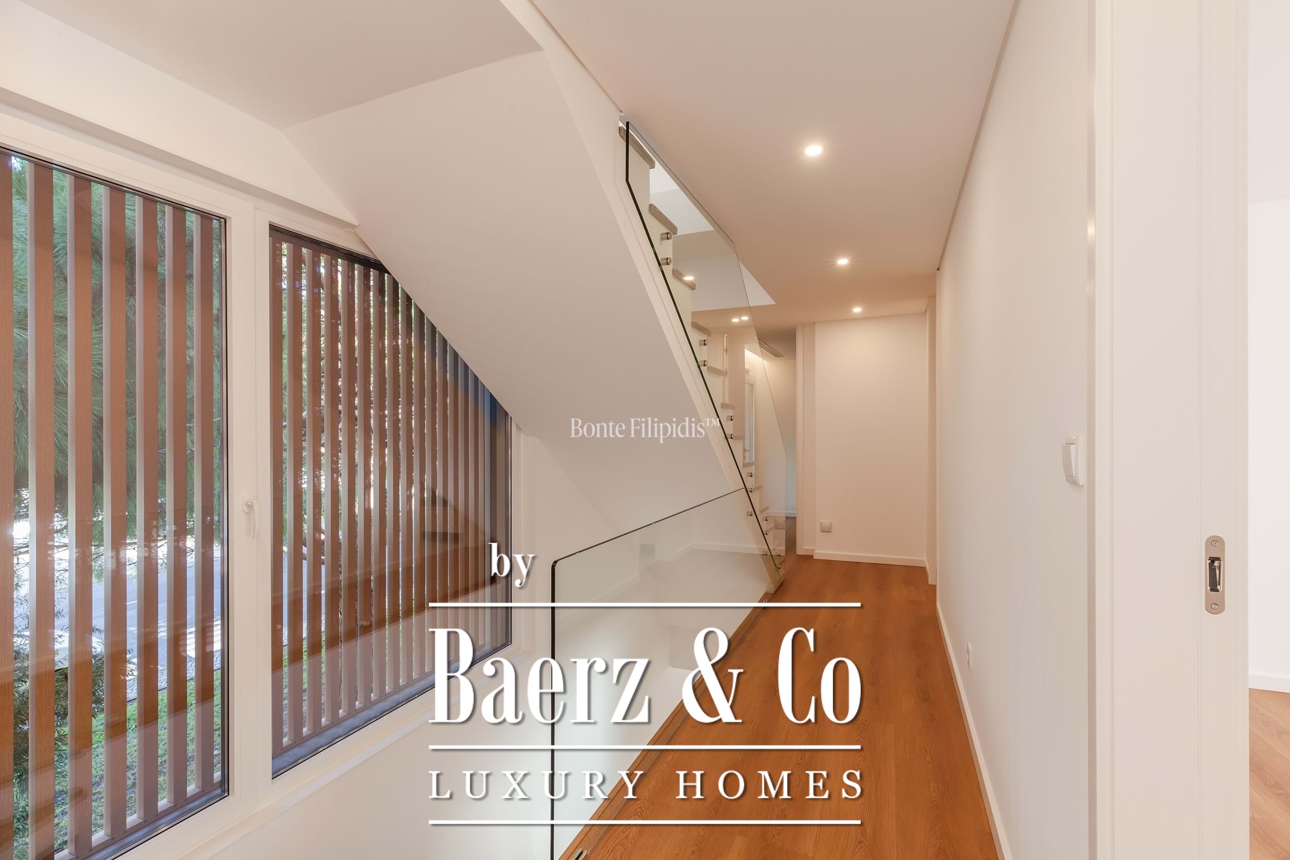 This townhouse Carcavelos e Parede draws on contemporary architecture to create a quietly distinguished living environment, spanning 217 m² across three well-considered floors. The open-plan kitchen, equipped with high-end appliances, connects seamlessly with the living room, inviting natural light while linking interiors to outdoor spaces and the landscaped terrace. An additional suite on the entrance level lends versatility and privacy, suitable for guests or adaptable living.