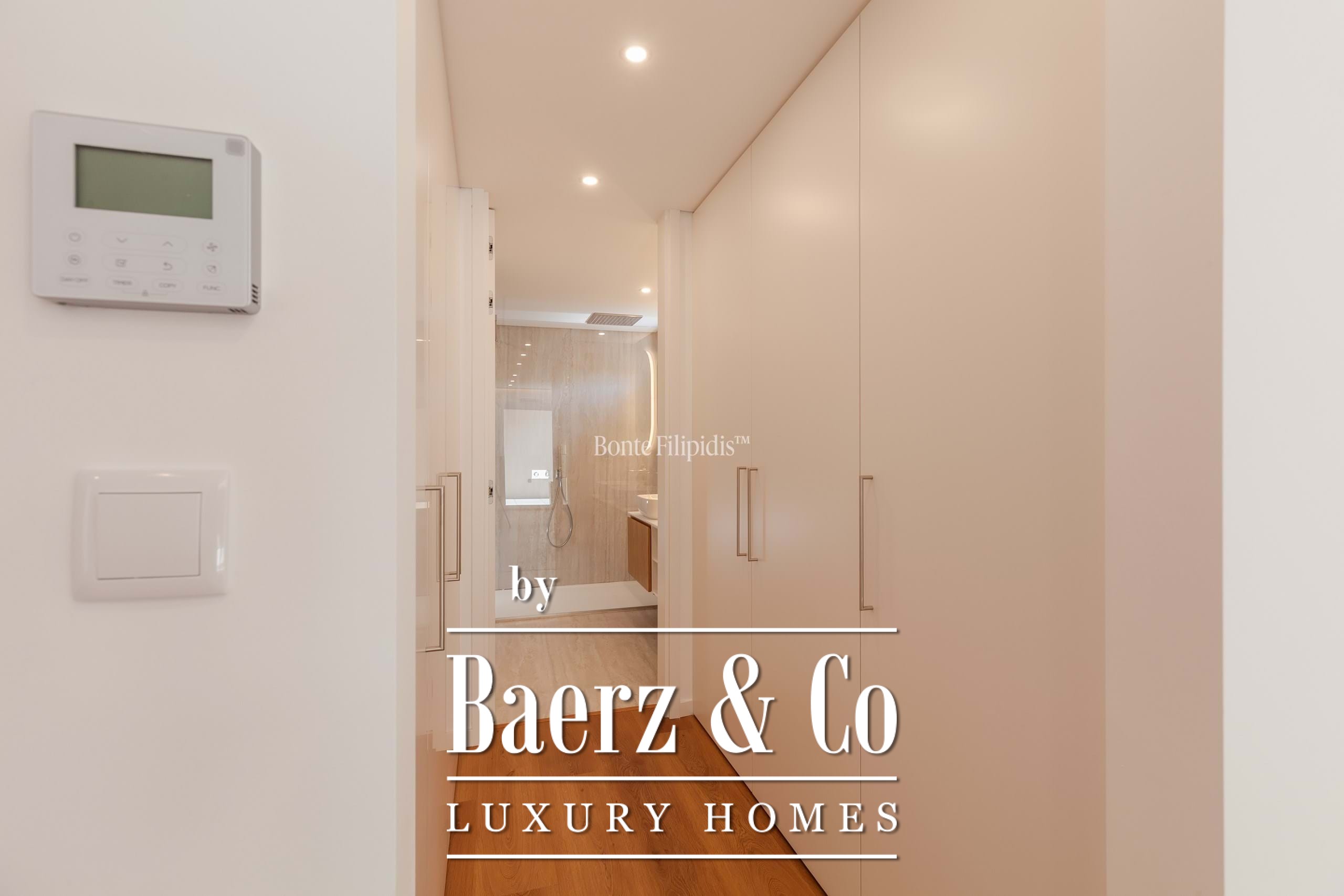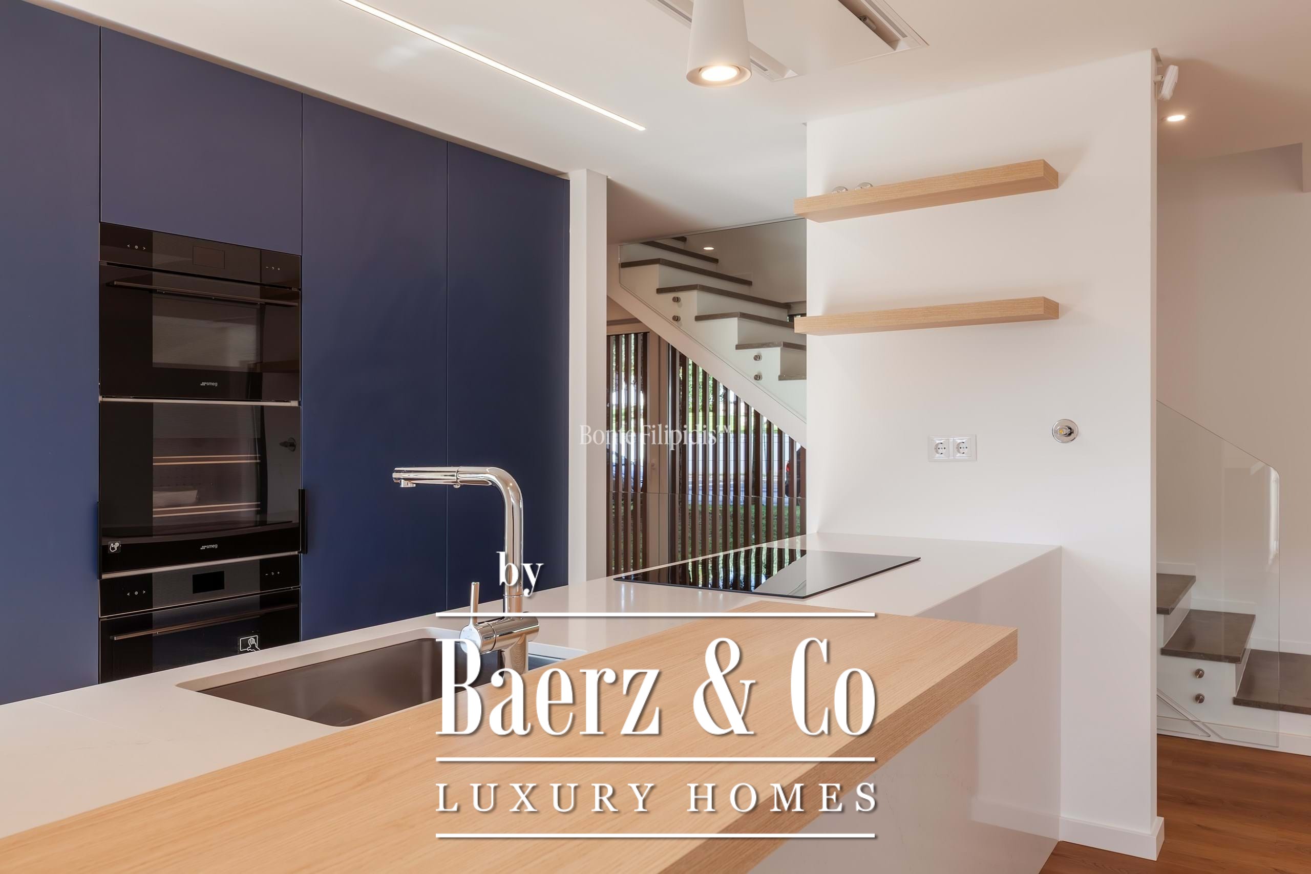 Upstairs, the primary suite features a walk-in closet, while two further bedrooms and a shared bathroom support family life. The top-floor multipurpose room, with its own full bathroom and access to a generous terrace, becomes the ideal vantage point for sunsets, leisure, and reflection under the coastal sky. Each bathroom benefits from electric underfloor heating, and sustainability is integrated through solar panels and pre-installed electric vehicle charging.