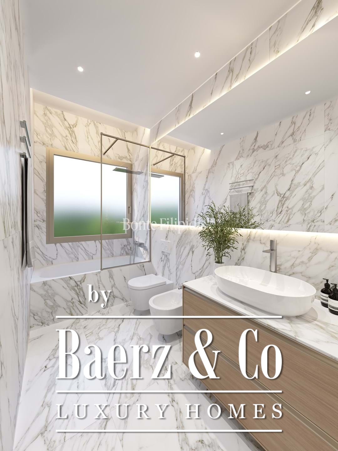 The private quarters comprise two bedrooms, including a suite with a walk-in closet. Three marble-clad bathrooms underscore the focus on comfort and refined materials. Custom carpentry, herringbone wood flooring, and integrated lighting quietly signal craft and distinction throughout.