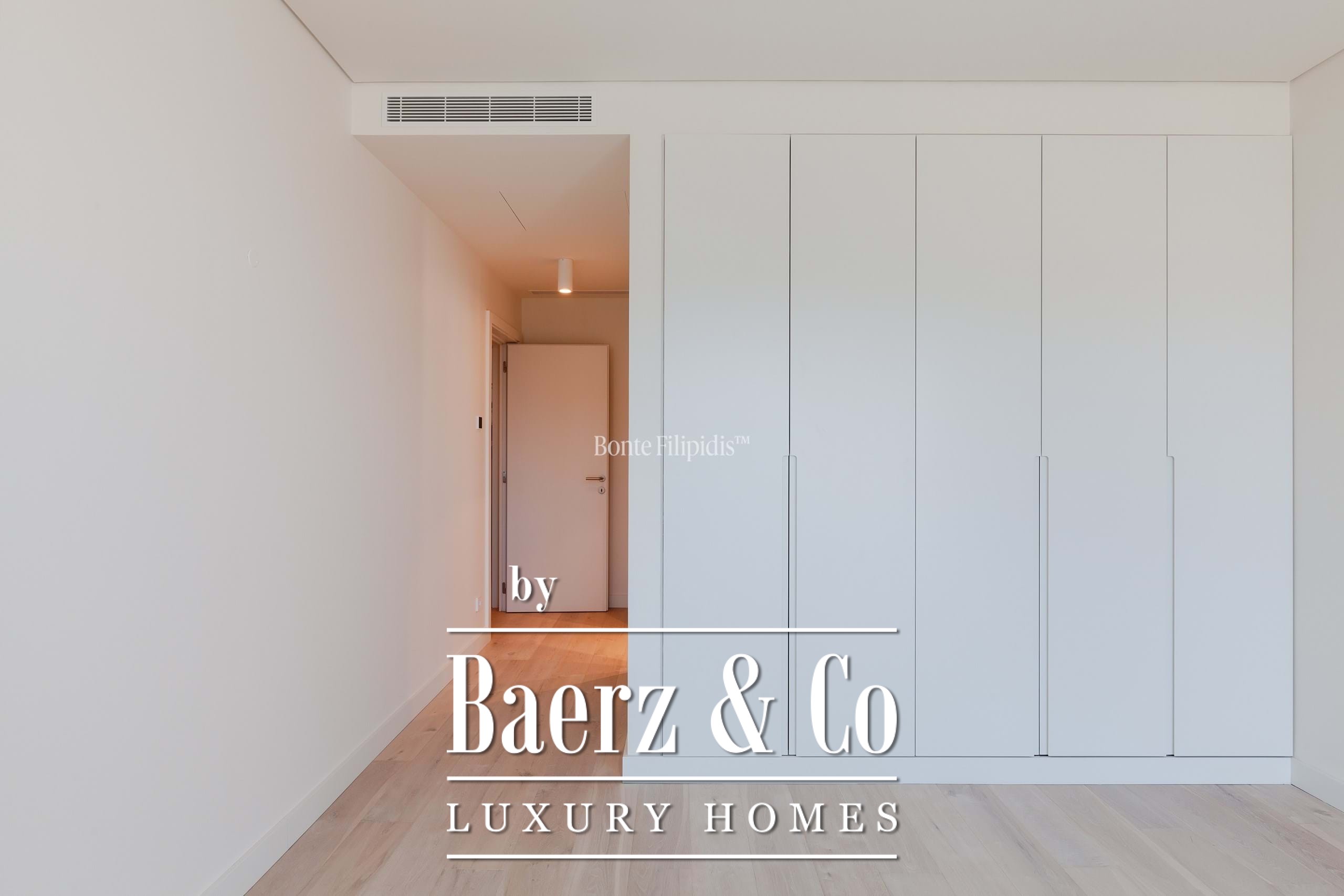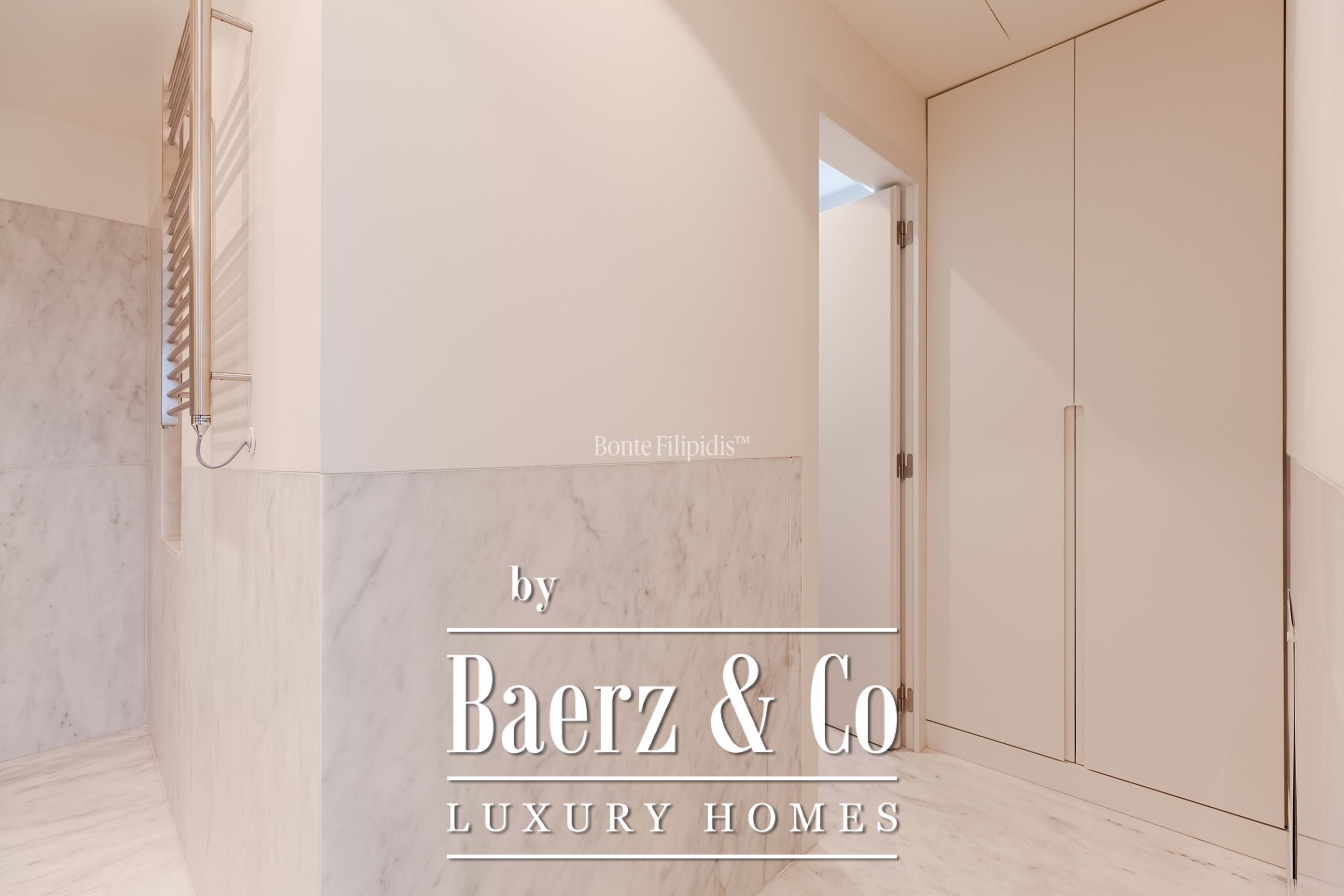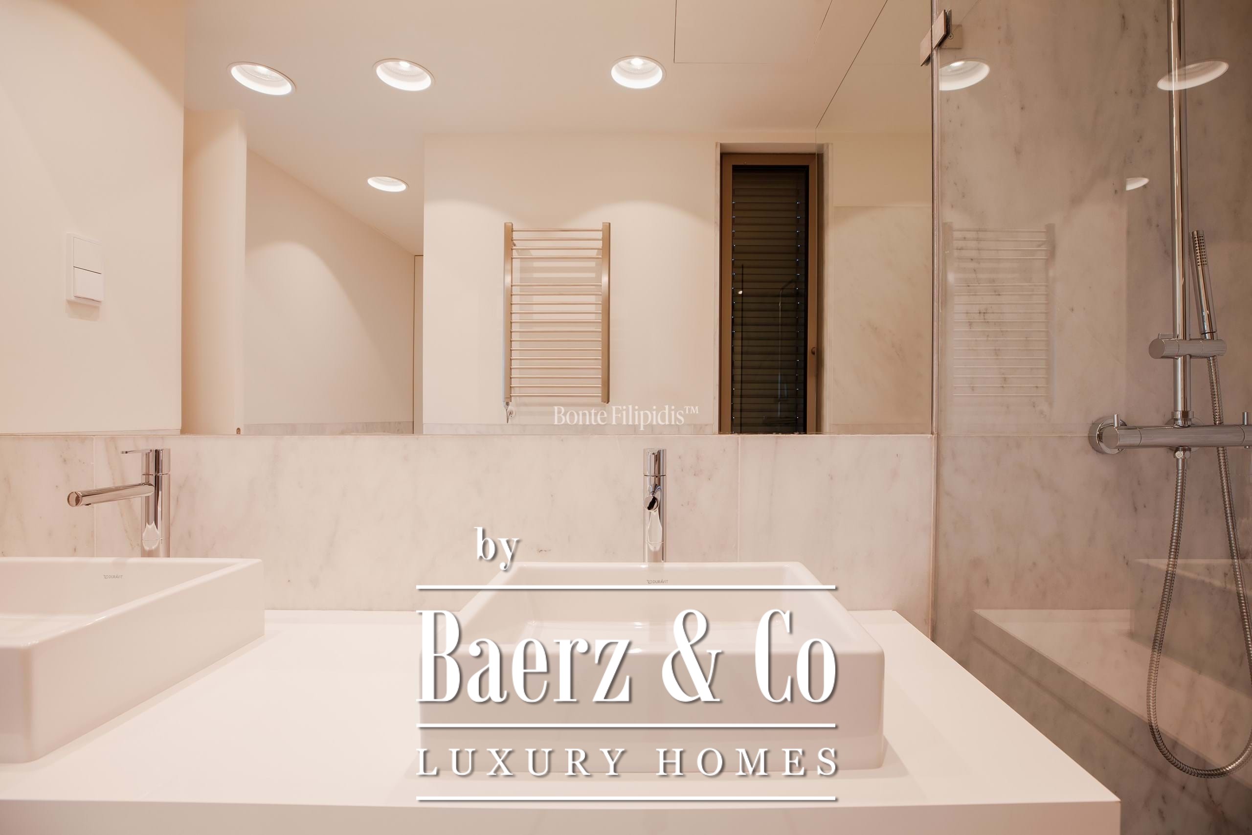 The upper floor hosts the primary suite, with a walk-in closet and access to a terrace with sea views. The property is equipped with air conditioning and underfloor heating for added comfort.