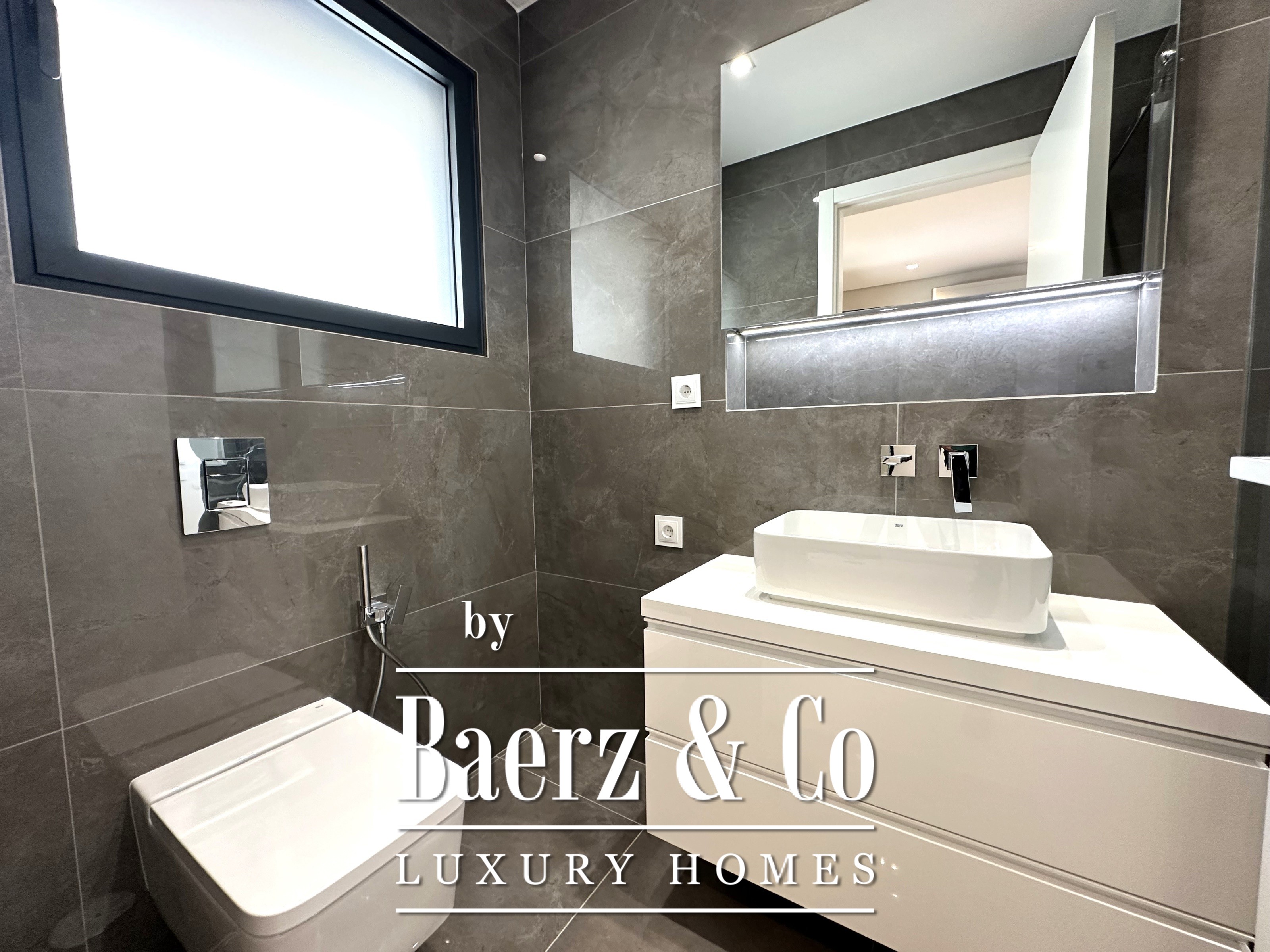 The lower level features three further suites, sized at 27 m², 13.43 m², and 12 m², each finished to a high standard. The absence of built-in wardrobes opens possibilities for fully custom interiors. An expansive terrace of 106 m² crowns the residence, offering views and space for outdoor leisure, supported by a 27 m² technical area. Additional amenities include a private garage of 72 m², an 8 m² laundry room, and further technical storage.