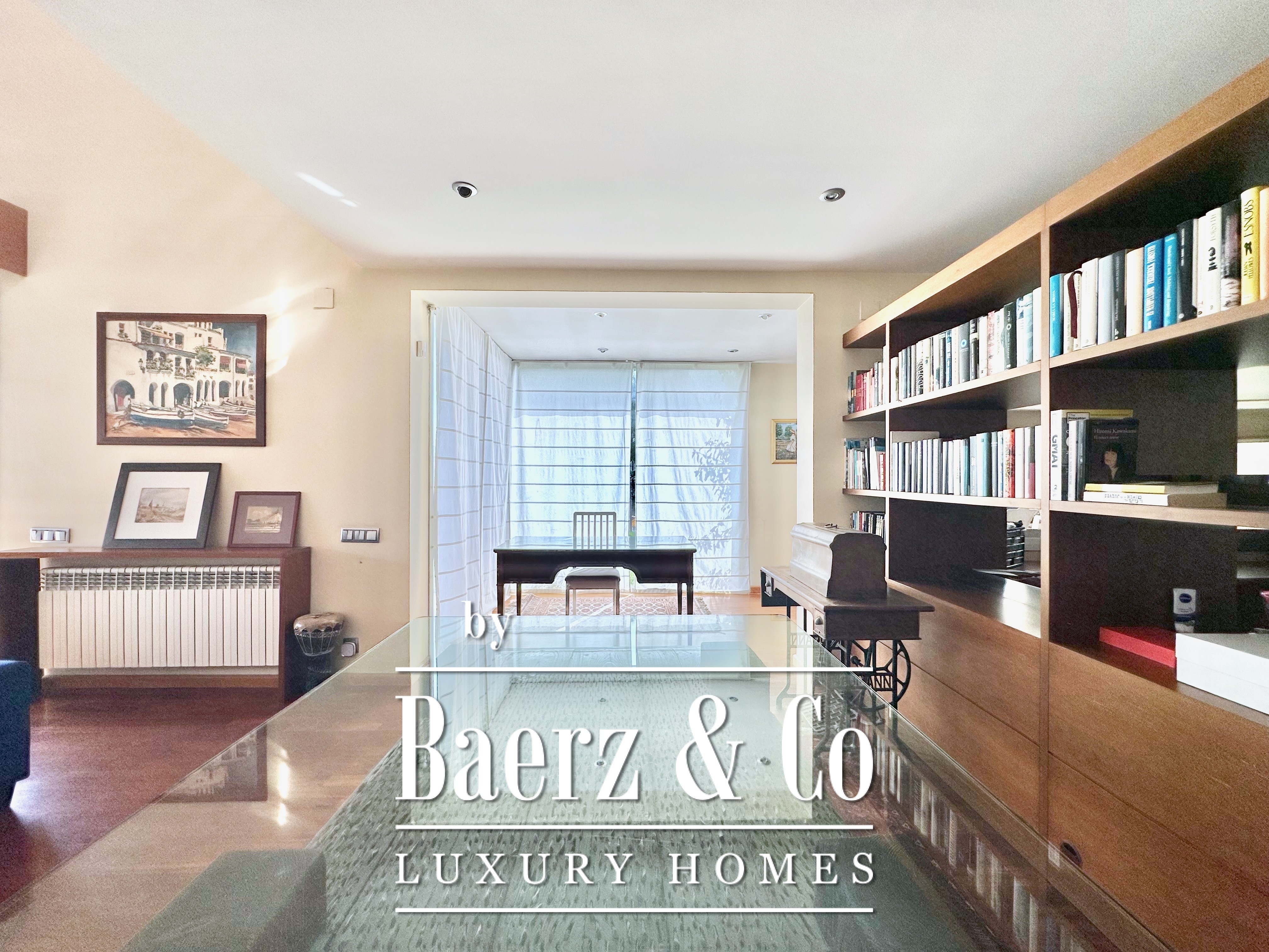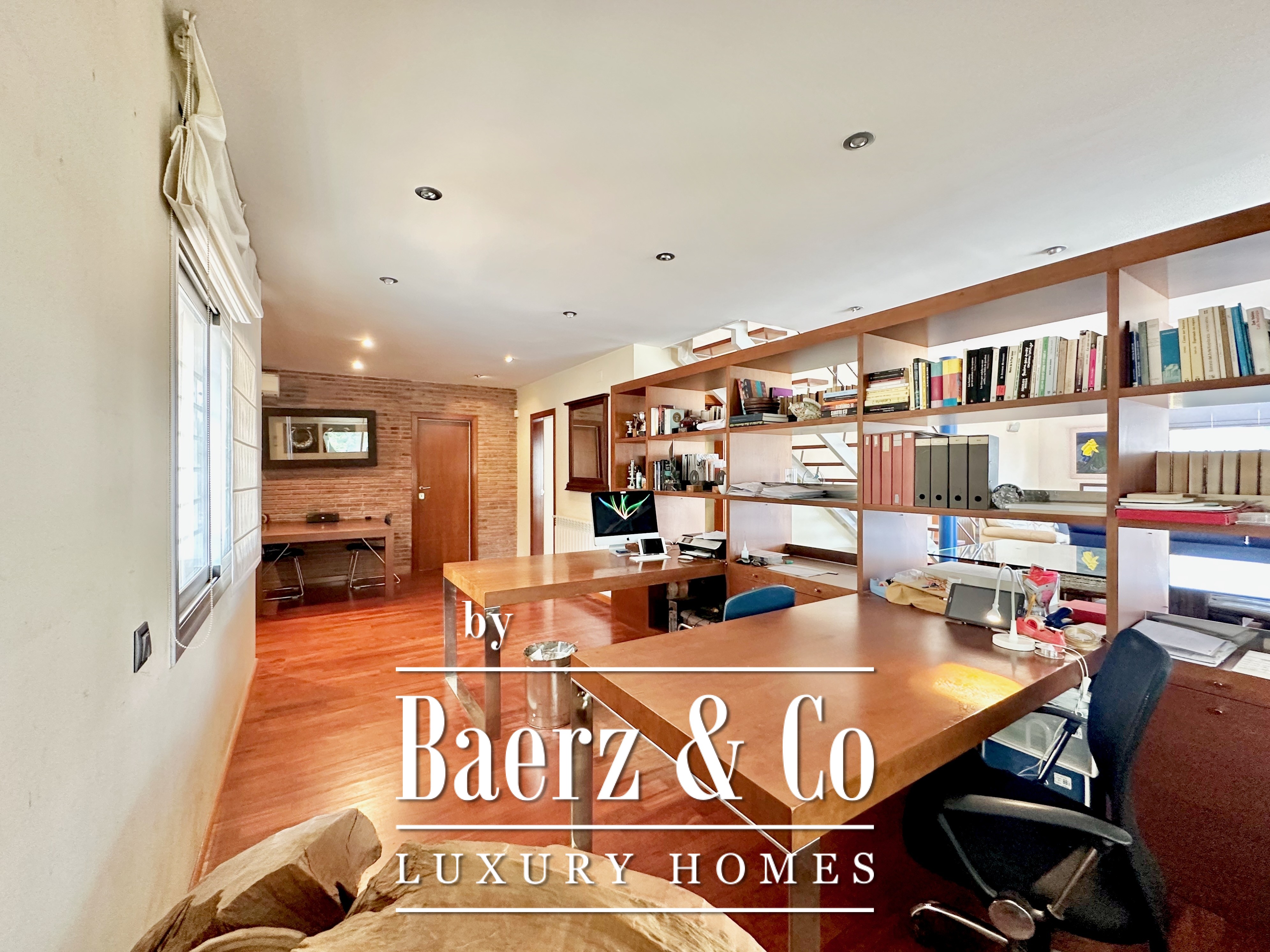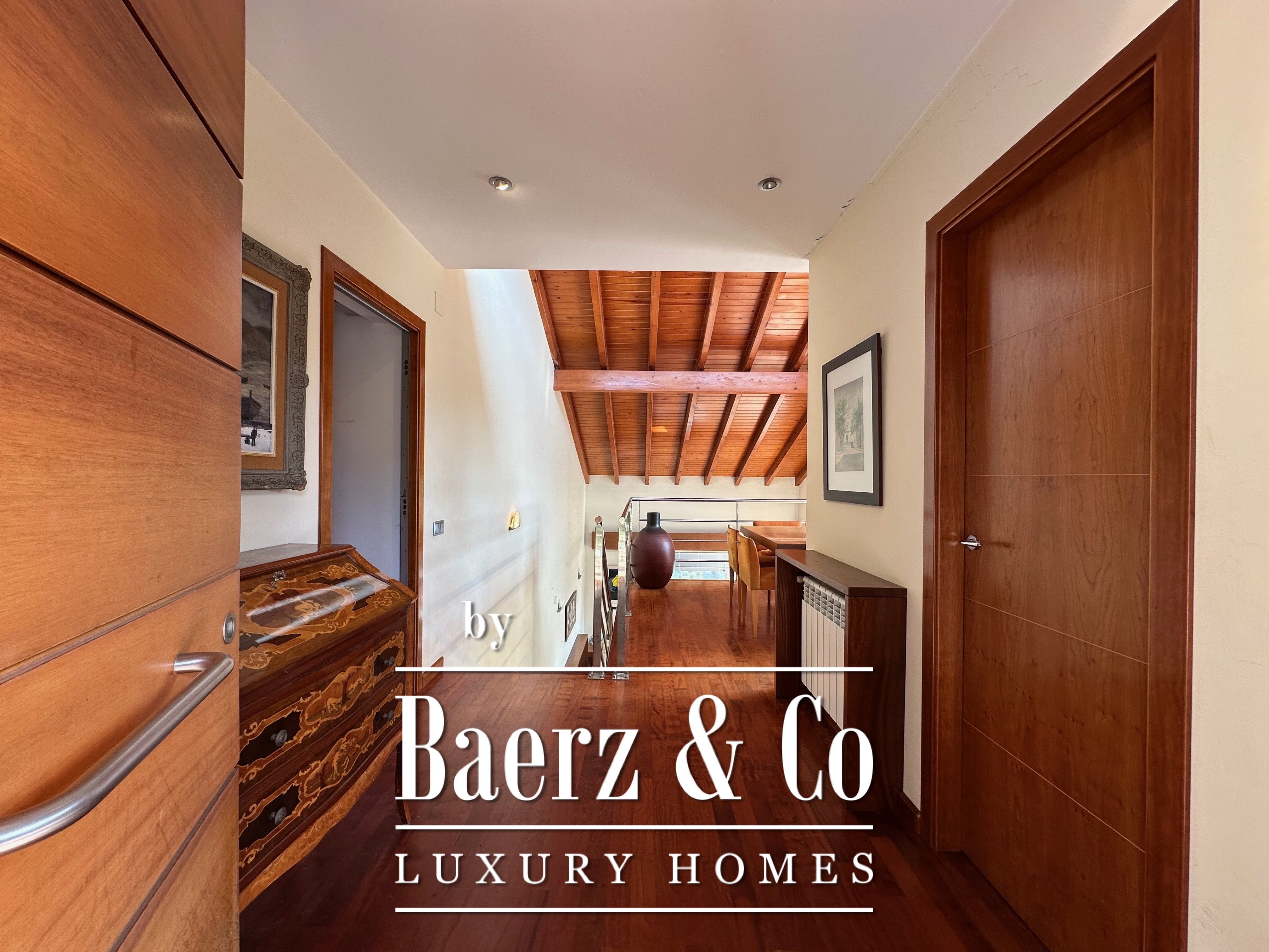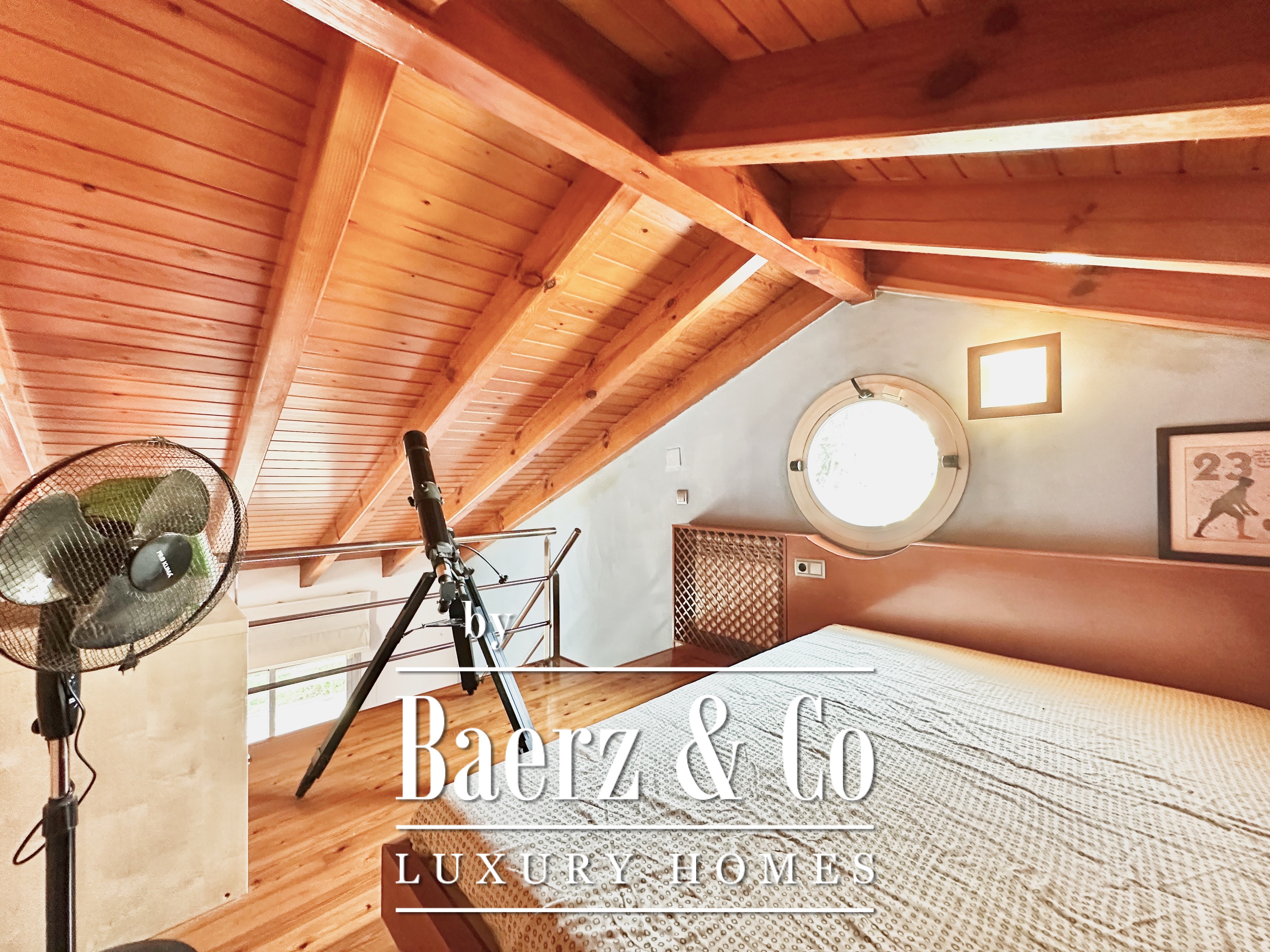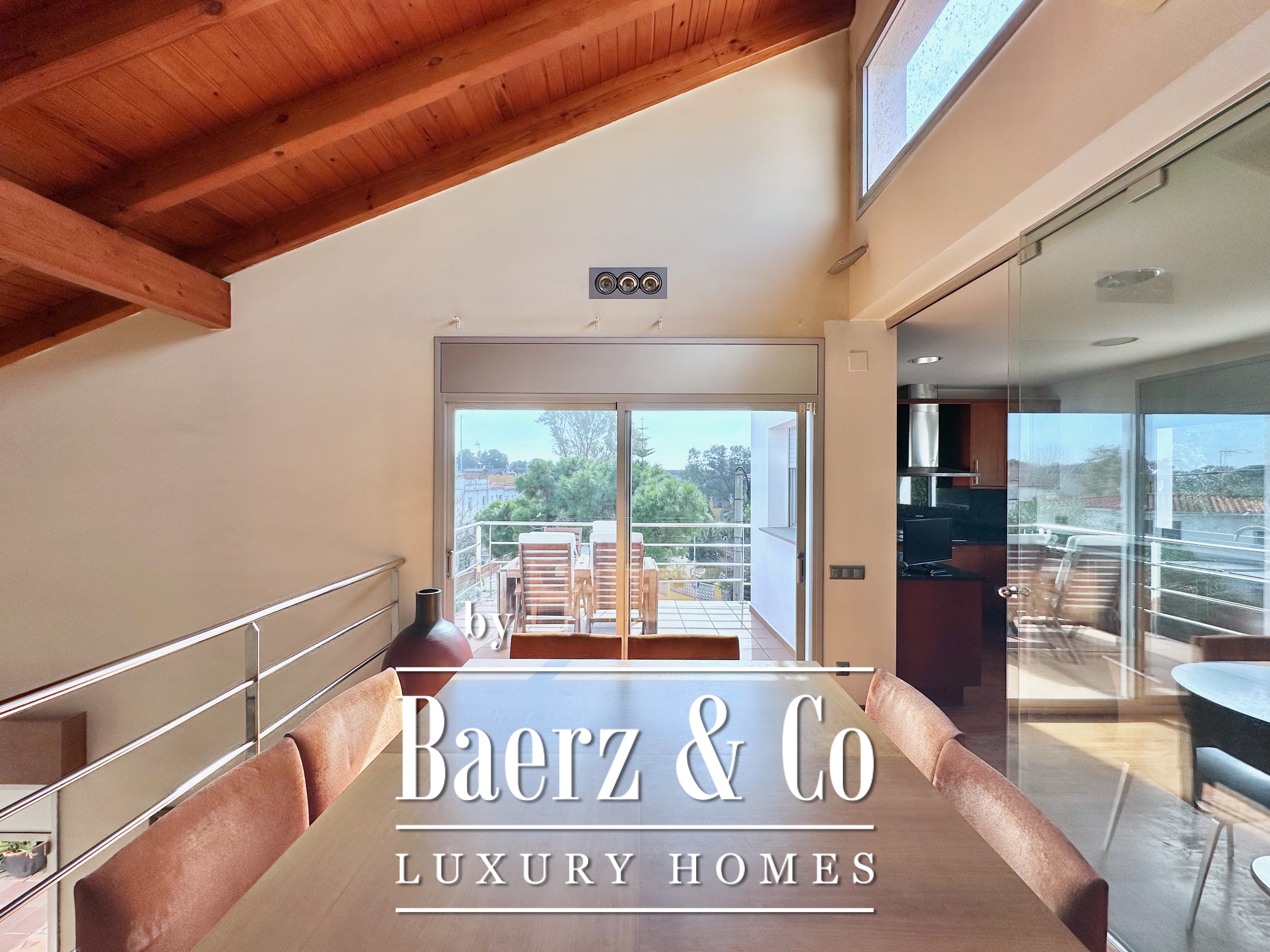 The private quarters include five bedrooms and two bathrooms. Two double rooms merge into a flexible, expansive suite above 20 m², easily returned to the original layout. An attic loft offers potential for work or leisure with direct access to a 20 m² terrace showcasing panoramic mountain views. The main suite features a dressing area and an elegant five-piece bathroom, balancing comfort with quiet sophistication. This detached house for sale in Castelldefels subtly integrates every element for a considered lifestyle in one of Spain’s respected coastal localities.