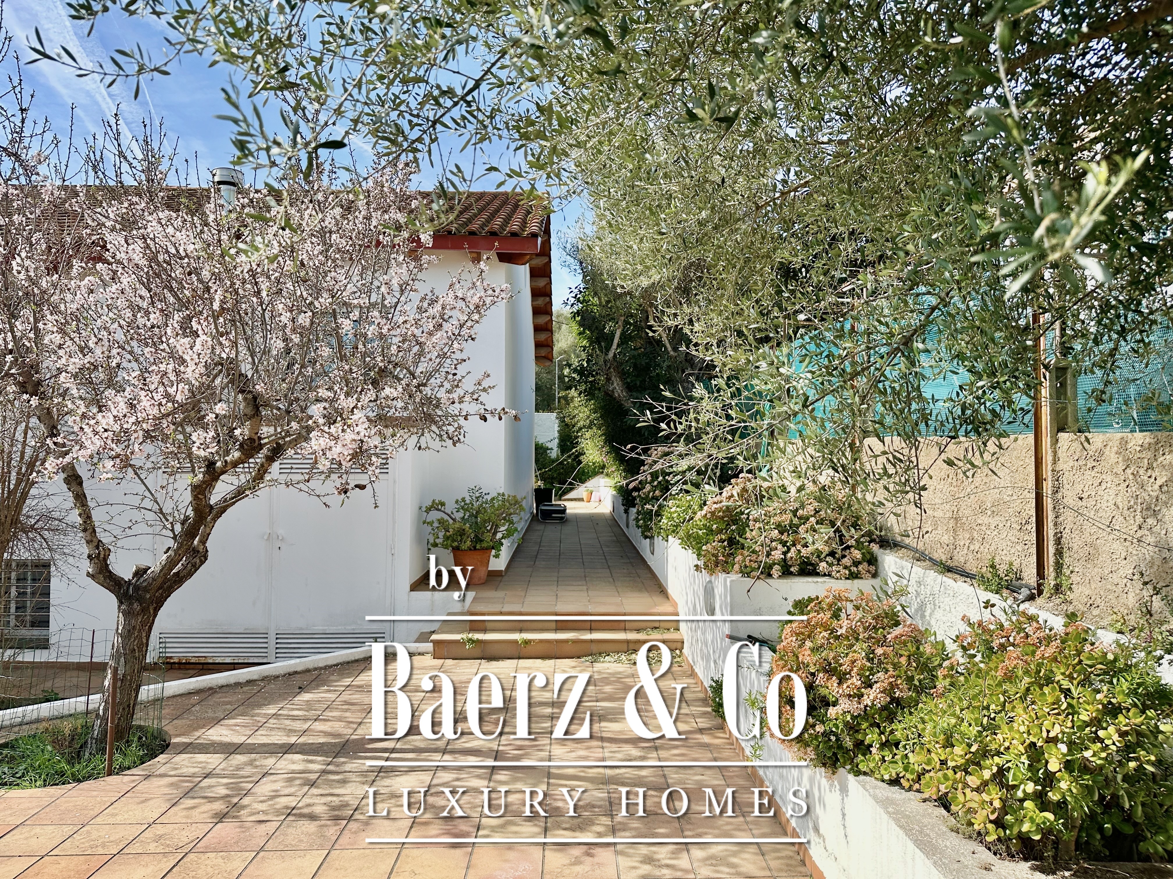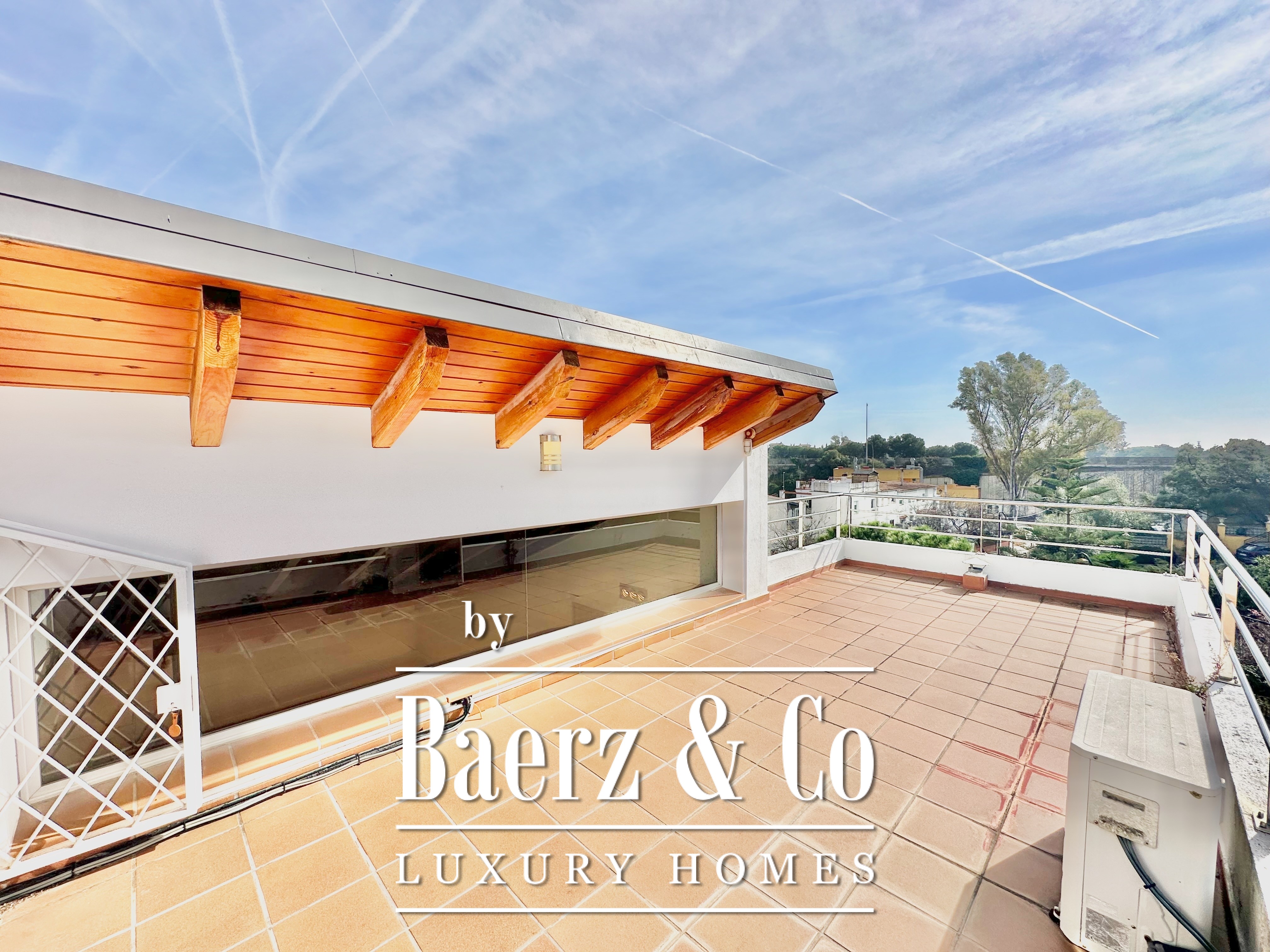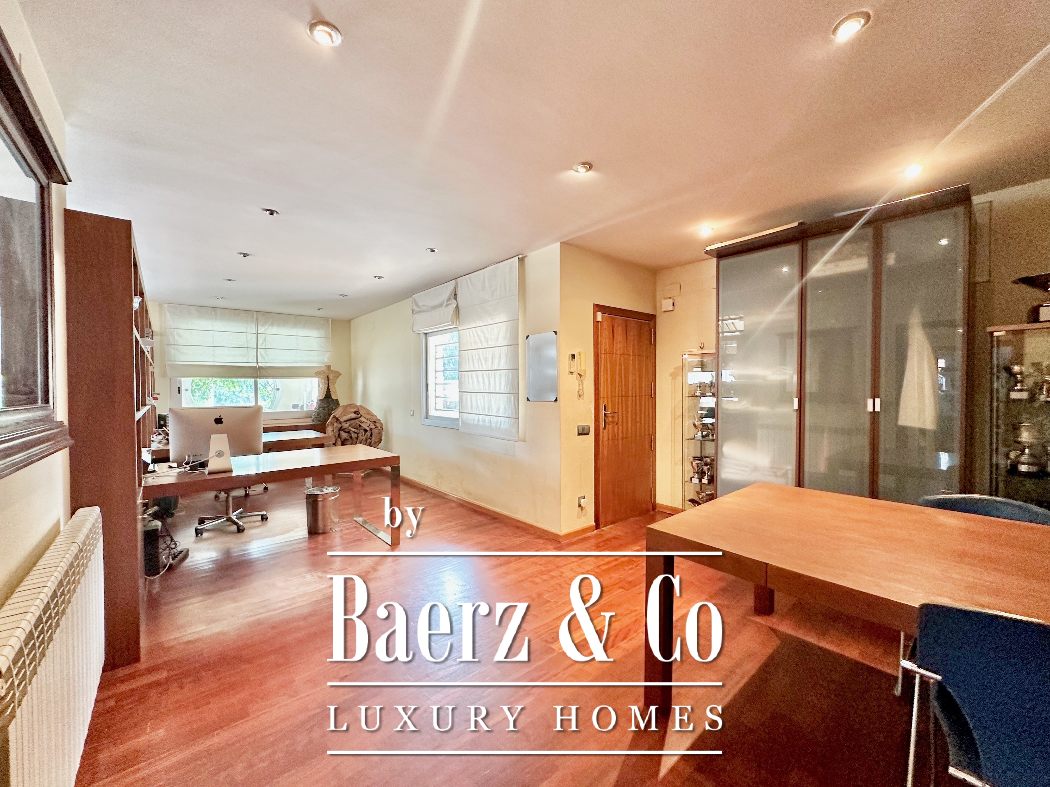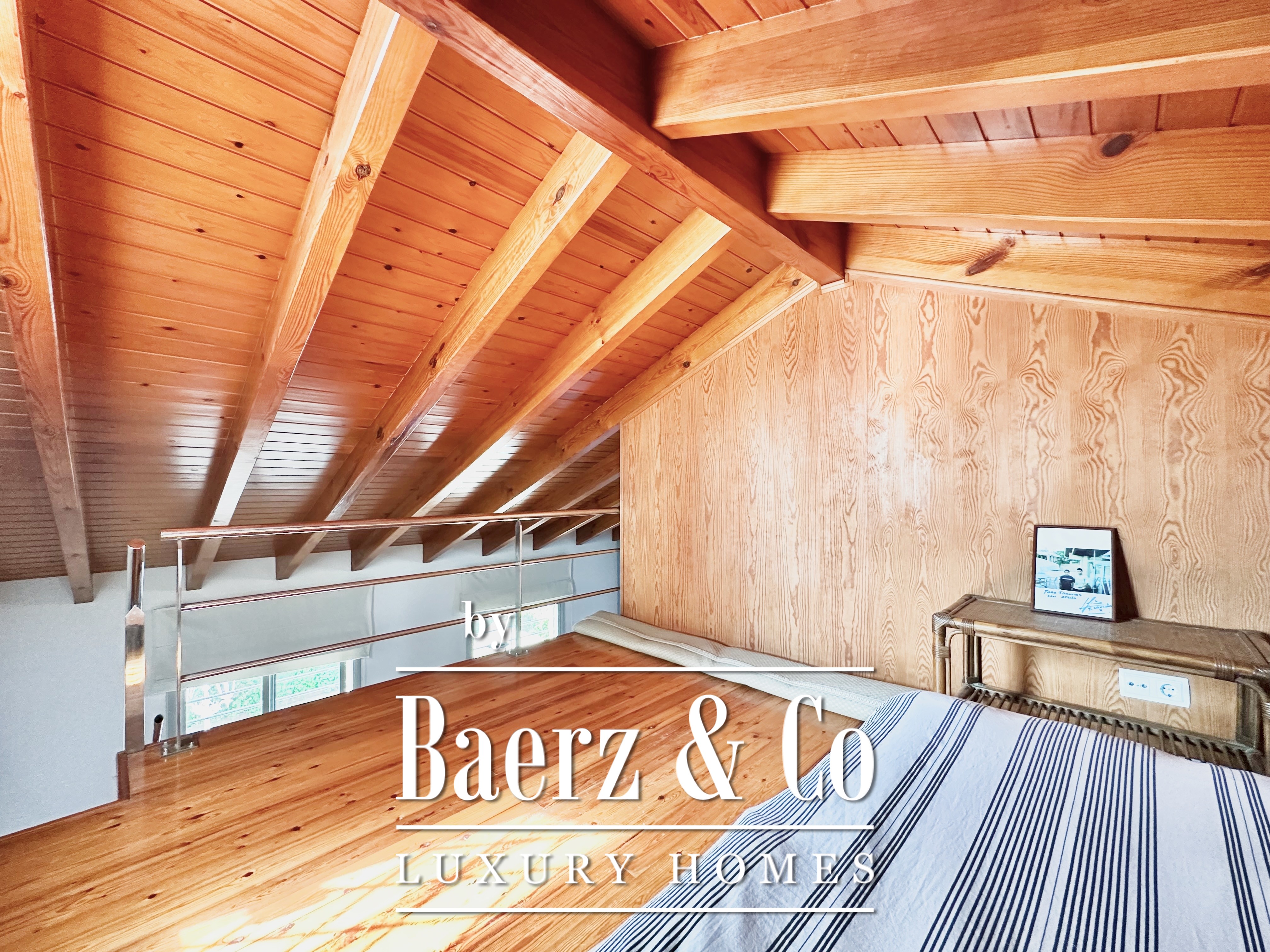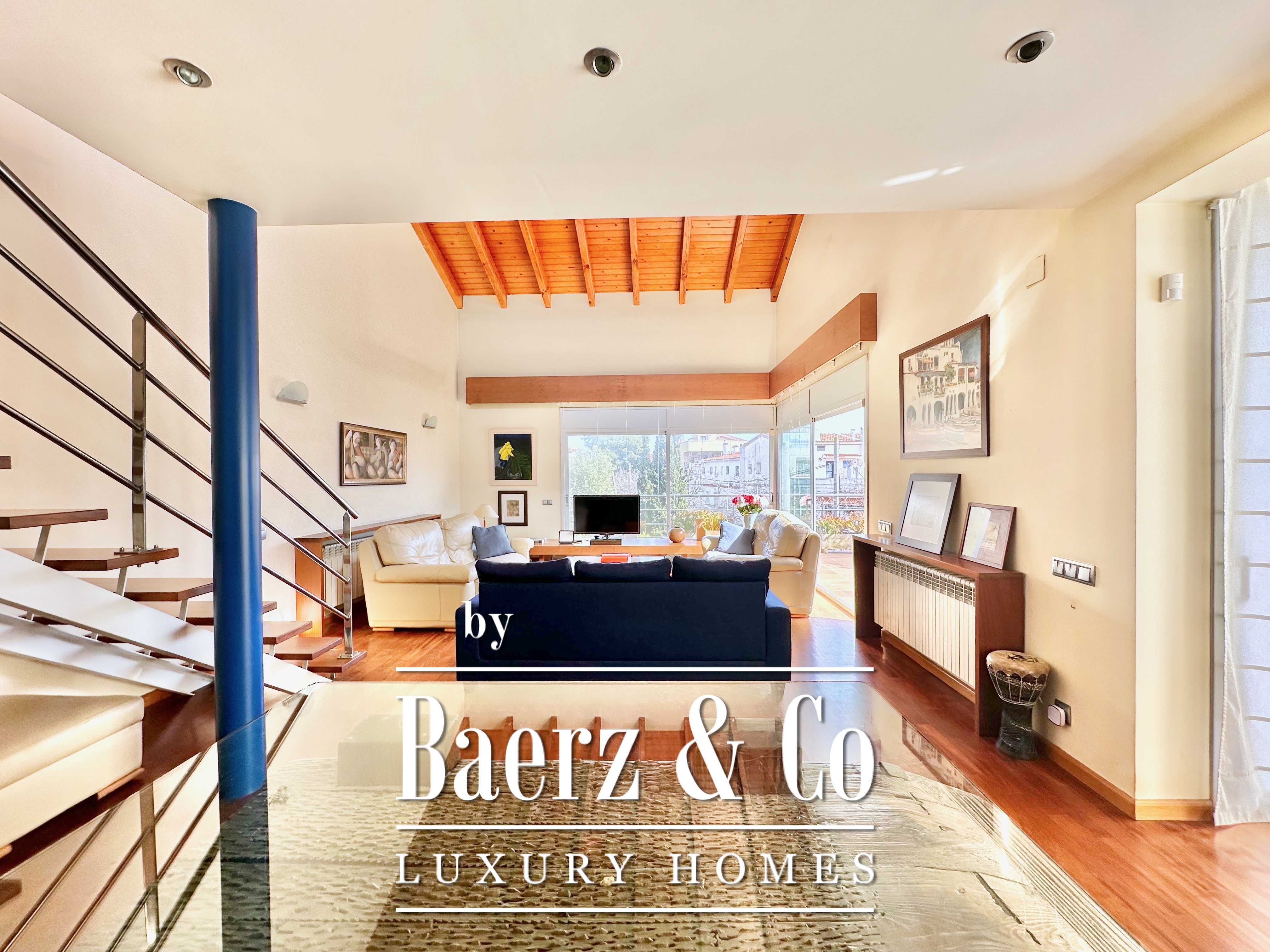 The private quarters include five bedrooms and two bathrooms. Two double rooms merge into a flexible, expansive suite above 20 m², easily returned to the original layout. An attic loft offers potential for work or leisure with direct access to a 20 m² terrace showcasing panoramic mountain views. The main suite features a dressing area and an elegant five-piece bathroom, balancing comfort with quiet sophistication. This detached house for sale in Castelldefels subtly integrates every element for a considered lifestyle in one of Spain’s respected coastal localities.