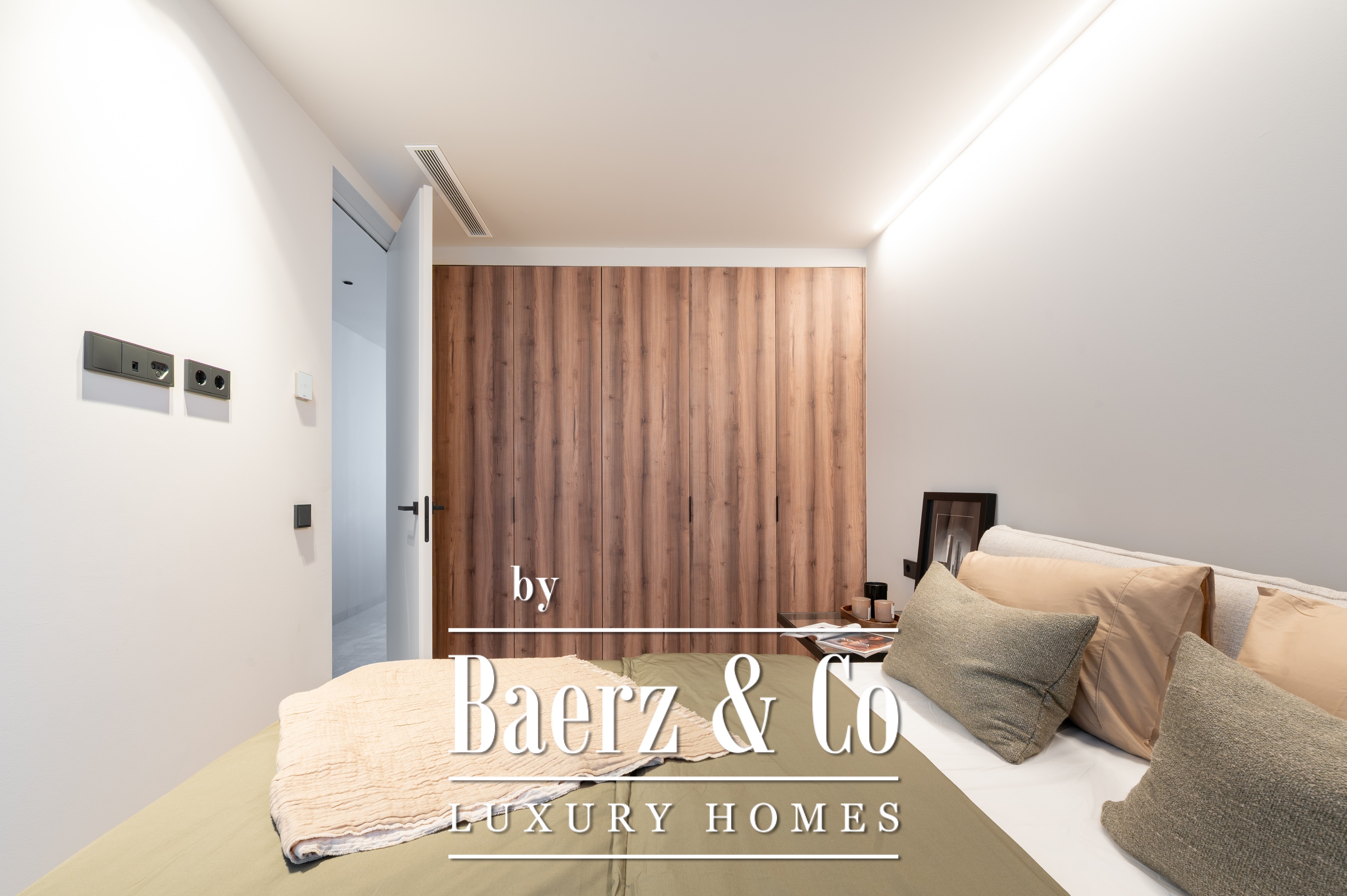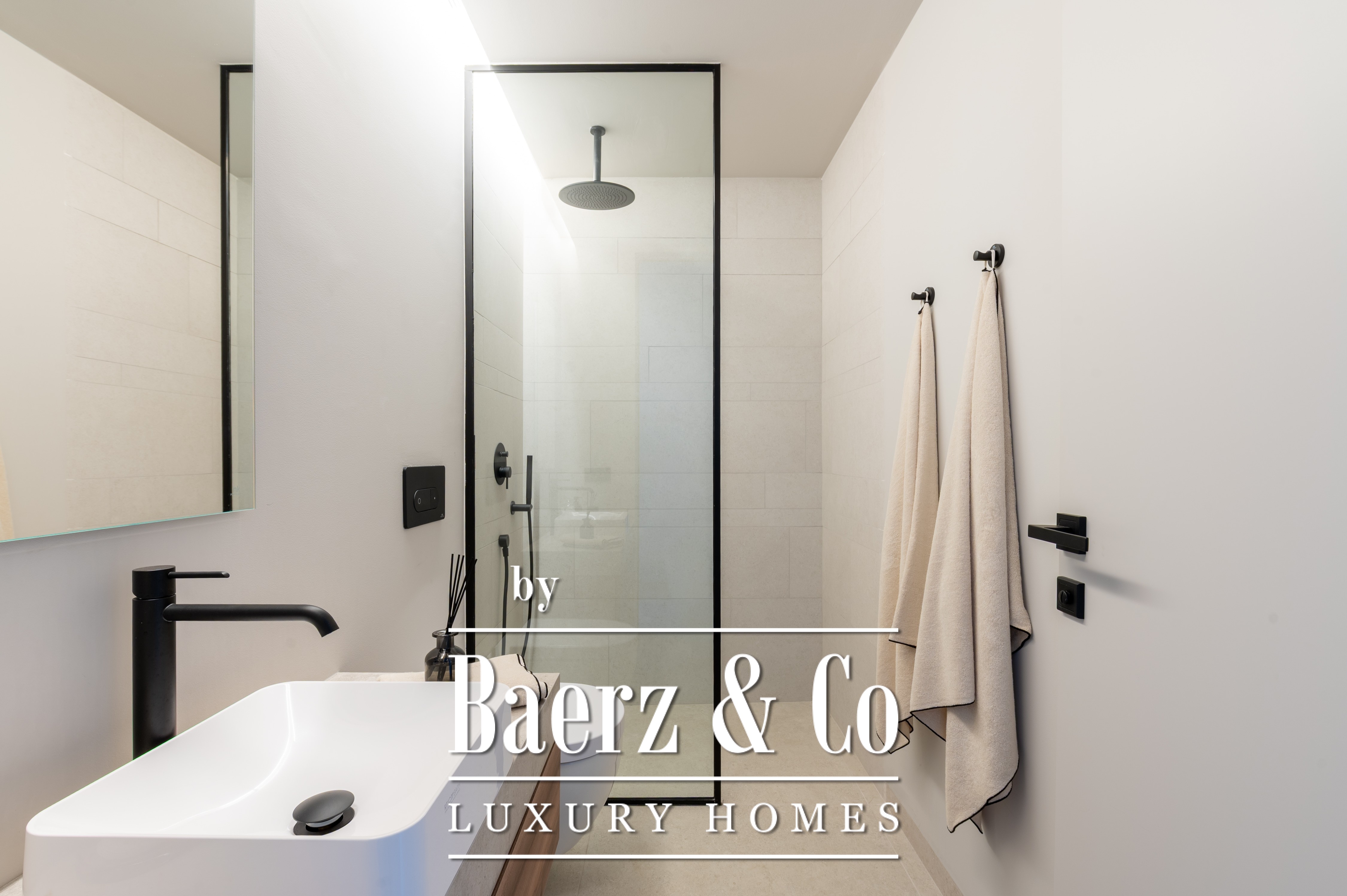 The equipped kitchen showcases top brand appliances, complemented by energy-efficient climate systems and sustainable charging points for vehicles and bicycles. A private garage accommodates two cars and a spacious storage room provides day-to-day ease.