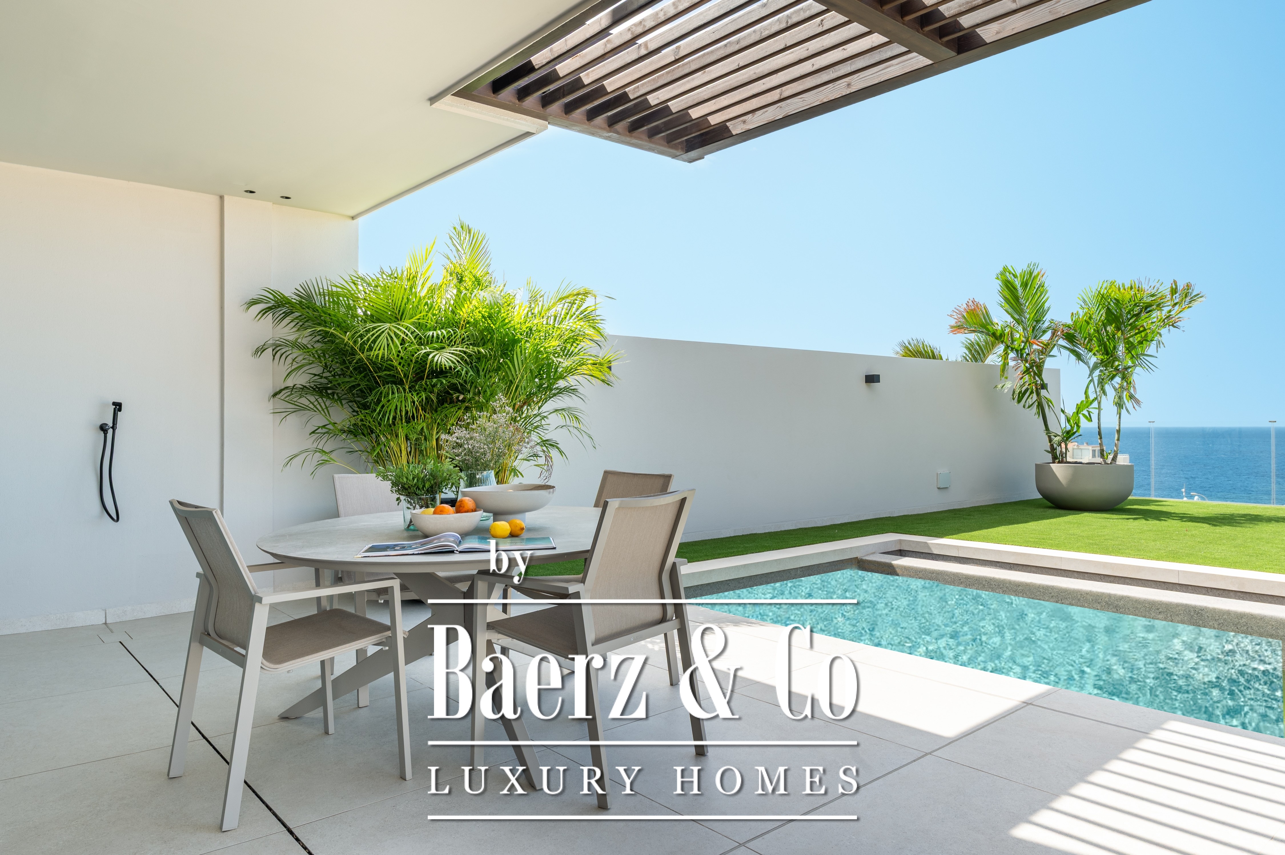 With a living area of 241 m² and a plot size of 340 m², the space breathes with ocean vistas from expansive terraces and generous interior proportions. Each of the three bedrooms features a fitted wardrobe, while four bathrooms ensure privacy and comfort. The private heated swimming pool, set against panoramic sea views, offers a tranquil place to unwind, and the terrace extends the home outward for effortless gatherings or private reflection.