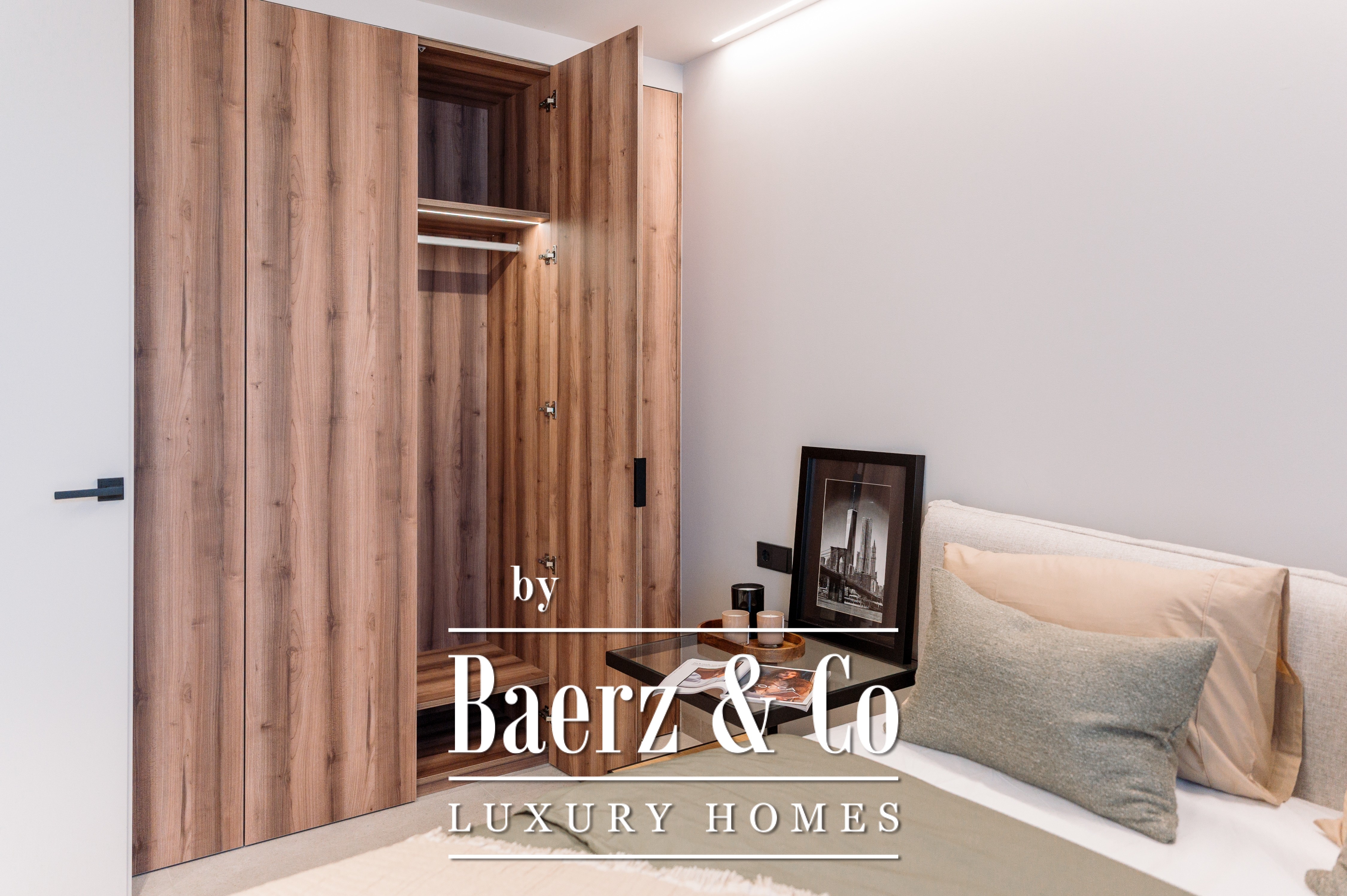The interior spans 114 m², featuring two bedrooms and two bathrooms, thoughtfully designed for ease and privacy. A private heated swimming pool extends the living experience outdoors, while energy-efficient systems and heat pumps deliver both comfort and sustainability. The kitchen, outfitted with top-brand appliances, stands ready for both daily routines and impromptu gatherings, complemented by three fitted wardrobes for refined storage.