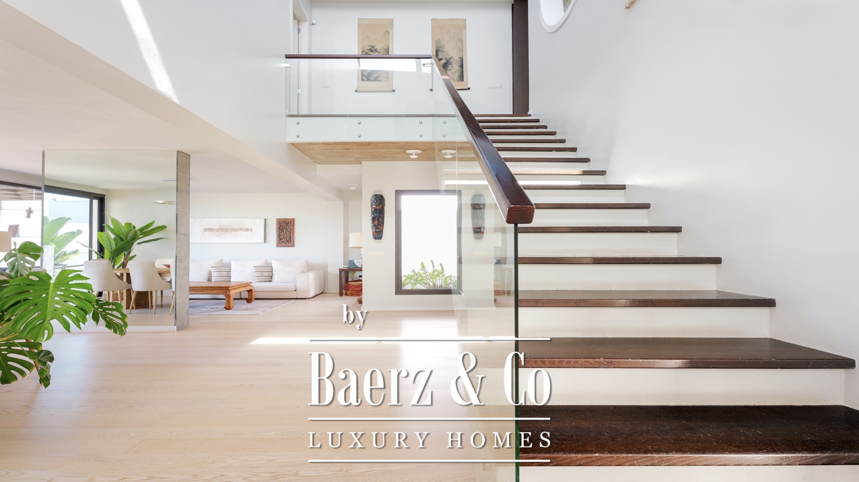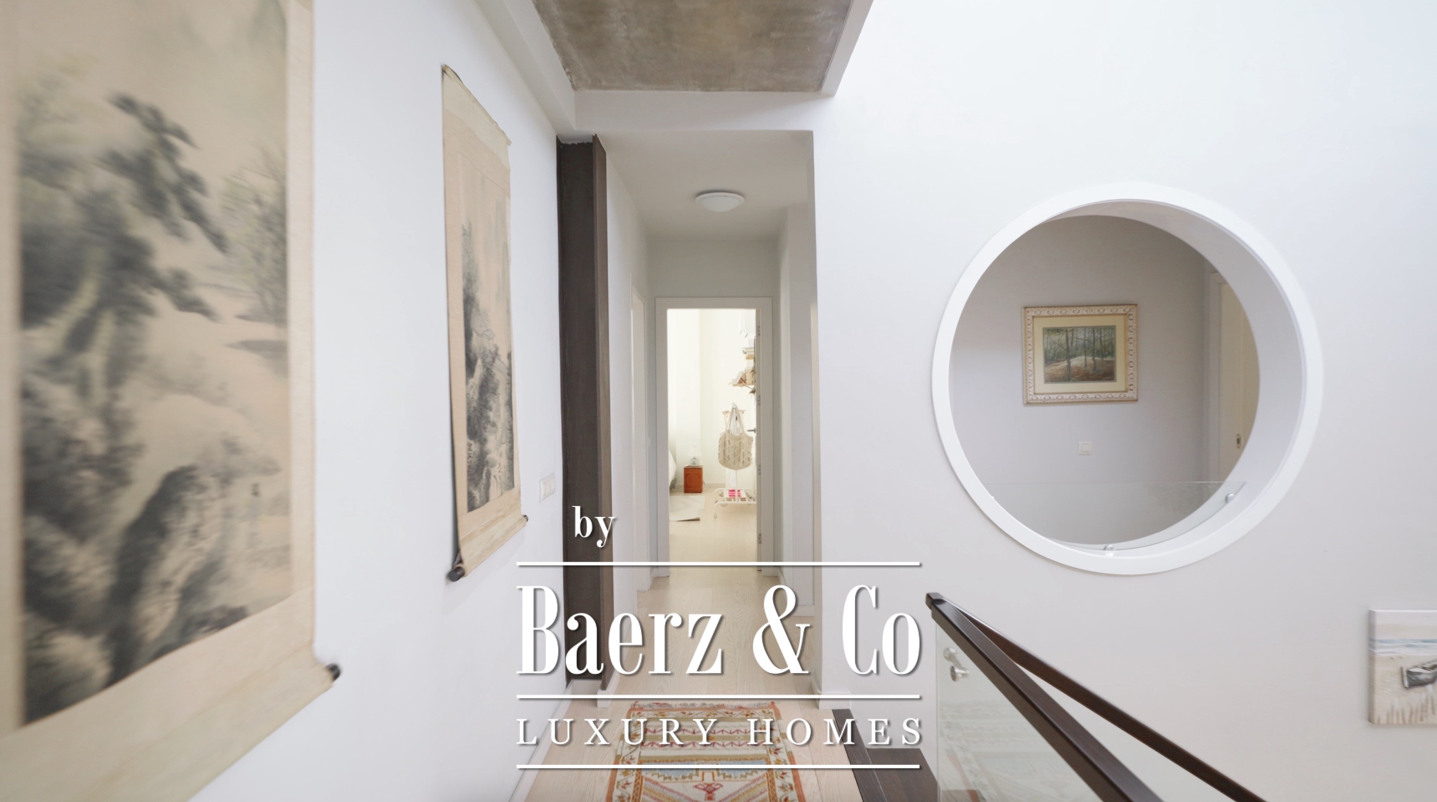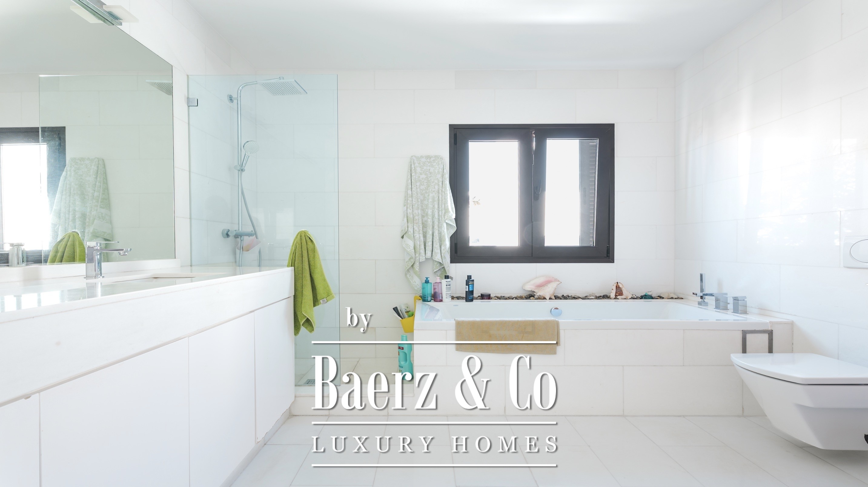 The main level welcomes with a sweeping living room, office, and guest facilities, each space capturing the quality of light and landscape. A fully equipped kitchen extends onto a broad terrace and patio, ideal for quiet gatherings or family moments. Upstairs, four bedrooms benefit from en-suite bathrooms, fitted wardrobes, and their own perspectives on the sea, with the principal suite enjoying a dressing room, large bathroom, and private balcony.