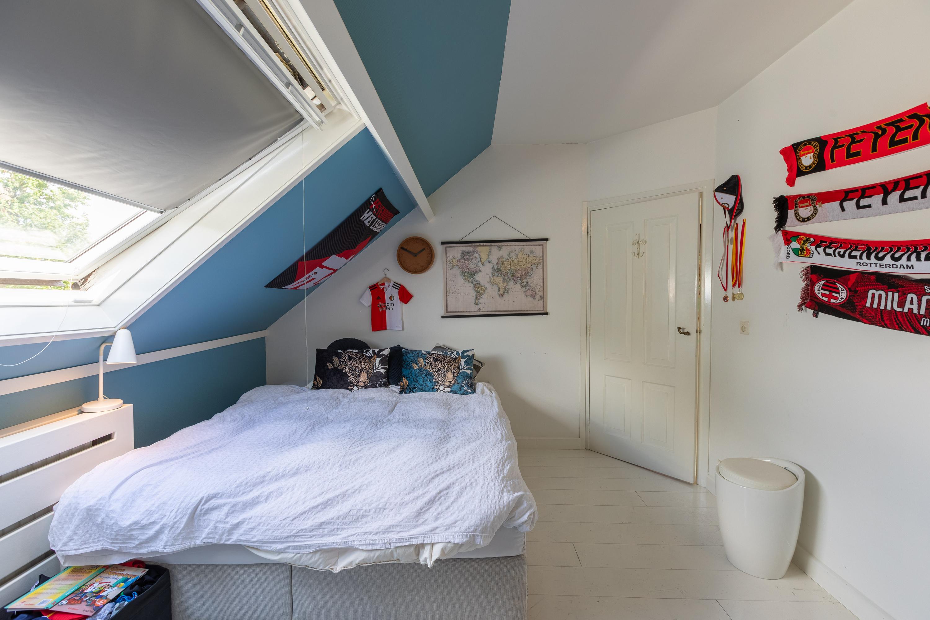 A spacious landing above the kitchen provides access to the master bedroom (approx. 65 m²) with air conditioning and characteristic wooden beams, a luxurious en-suite bathroom with freestanding bath, walk-in shower, toilet, and double sink, plus a walk-in closet with dormer window and views of the greenery of Midden-Delfland.