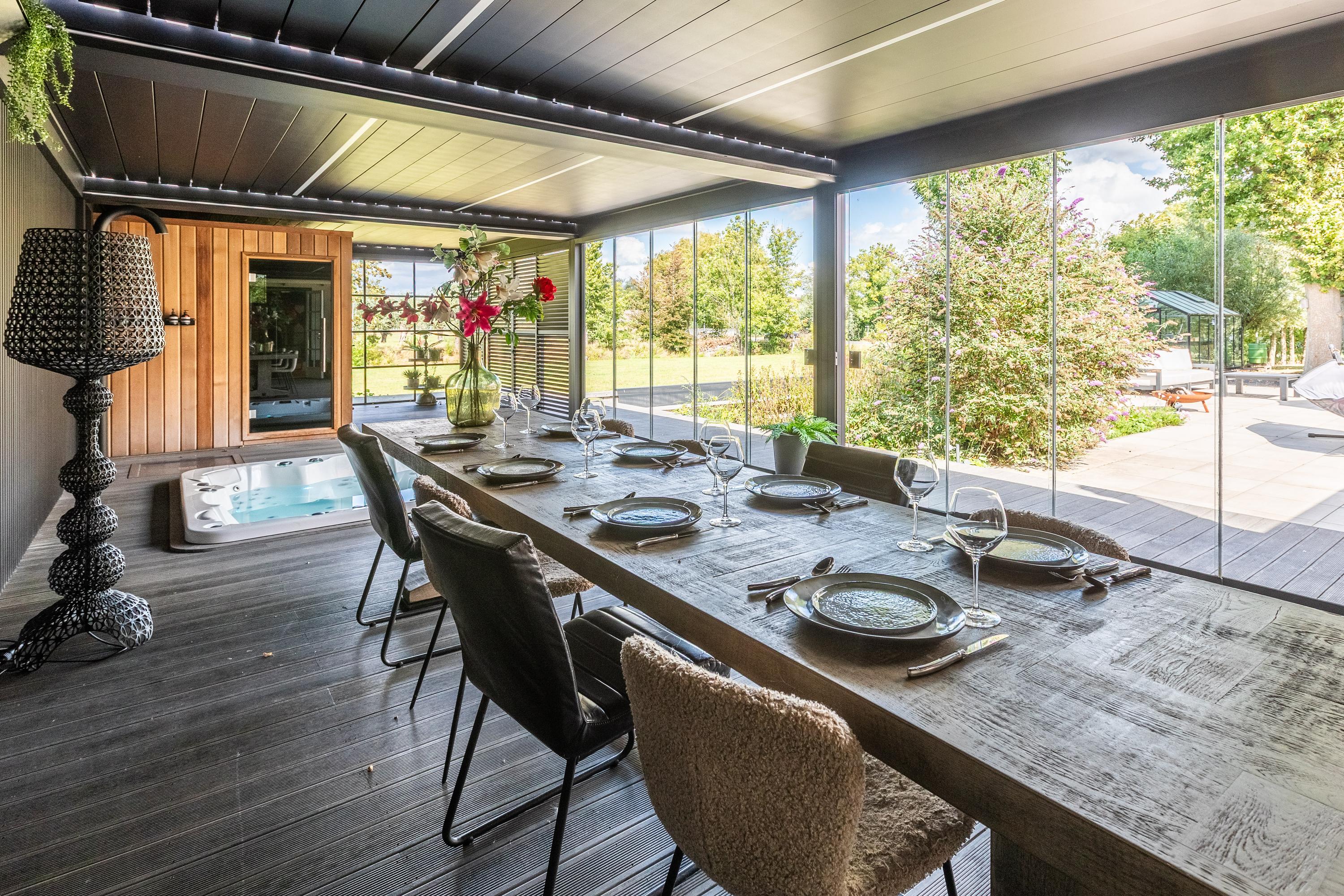 In addition, the ground floor features a second modern kitchen adjacent to the terrace and a multifunctional space of approximately 85 m² in the former stable, equipped with a bar, pantry, toilet, and access to the garages and storage space. On the other side of this space, you enter the spacious extension with wellness facilities, fully equipped with a jacuzzi, Finnish sauna, infrared sauna, and enough space for a large dining table or lounge set—a wonderful place to relax and enjoy each other's company.