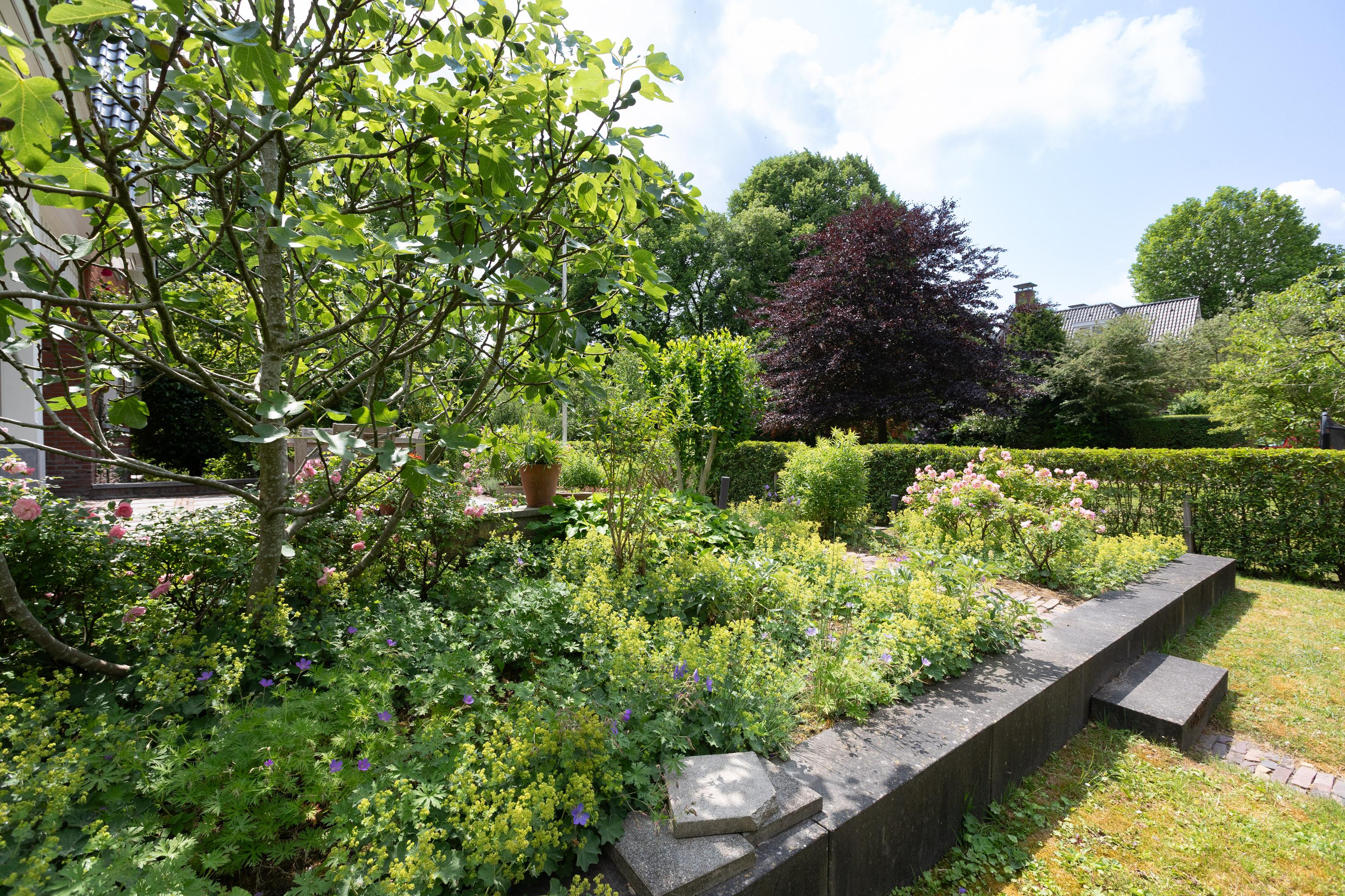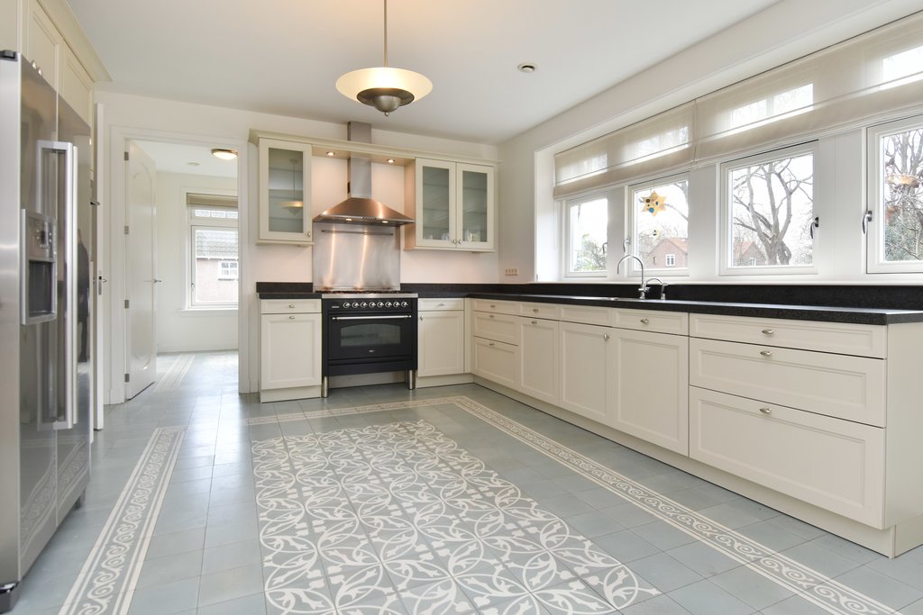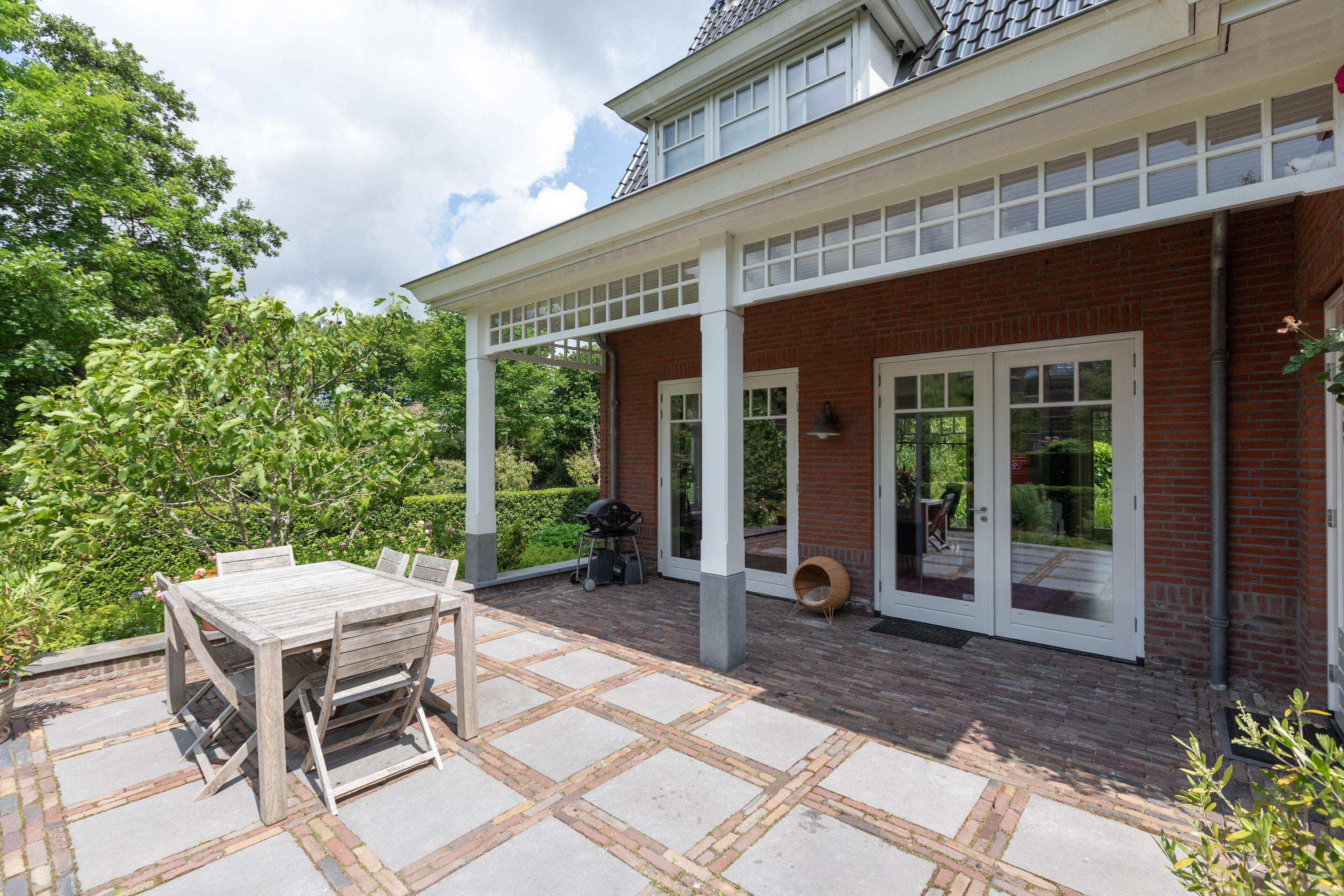 Entrance with wardrobe and meter cupboard. Spacious hallway with access to the study (3.80 x 3.40 m). Guest toilet. Living room with elegant herringbone parquet flooring and fireplace. Multiple French doors provide access to the surrounding garden. Large open-plan Siematic kitchen (4.18 x 5.30 m) equipped with an American-style fridge/freezer, 6-burner gas hob with oven, extractor hood, dishwasher, and a separate combi microwave/oven. Utility room with washing machine and dryer connections. Sunny, generous terrace (6.05 x 6.22 m).