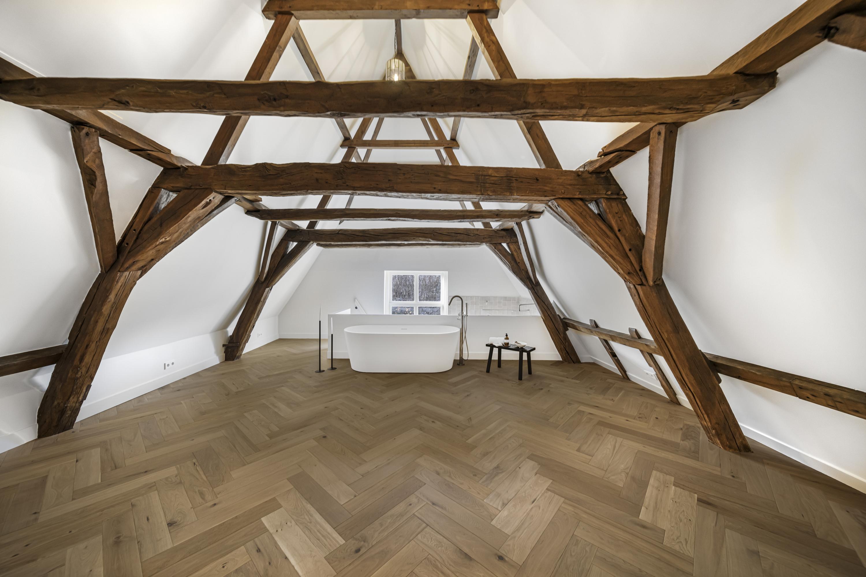 Newly installed herringbone parquet flooring on the ground and upper floors