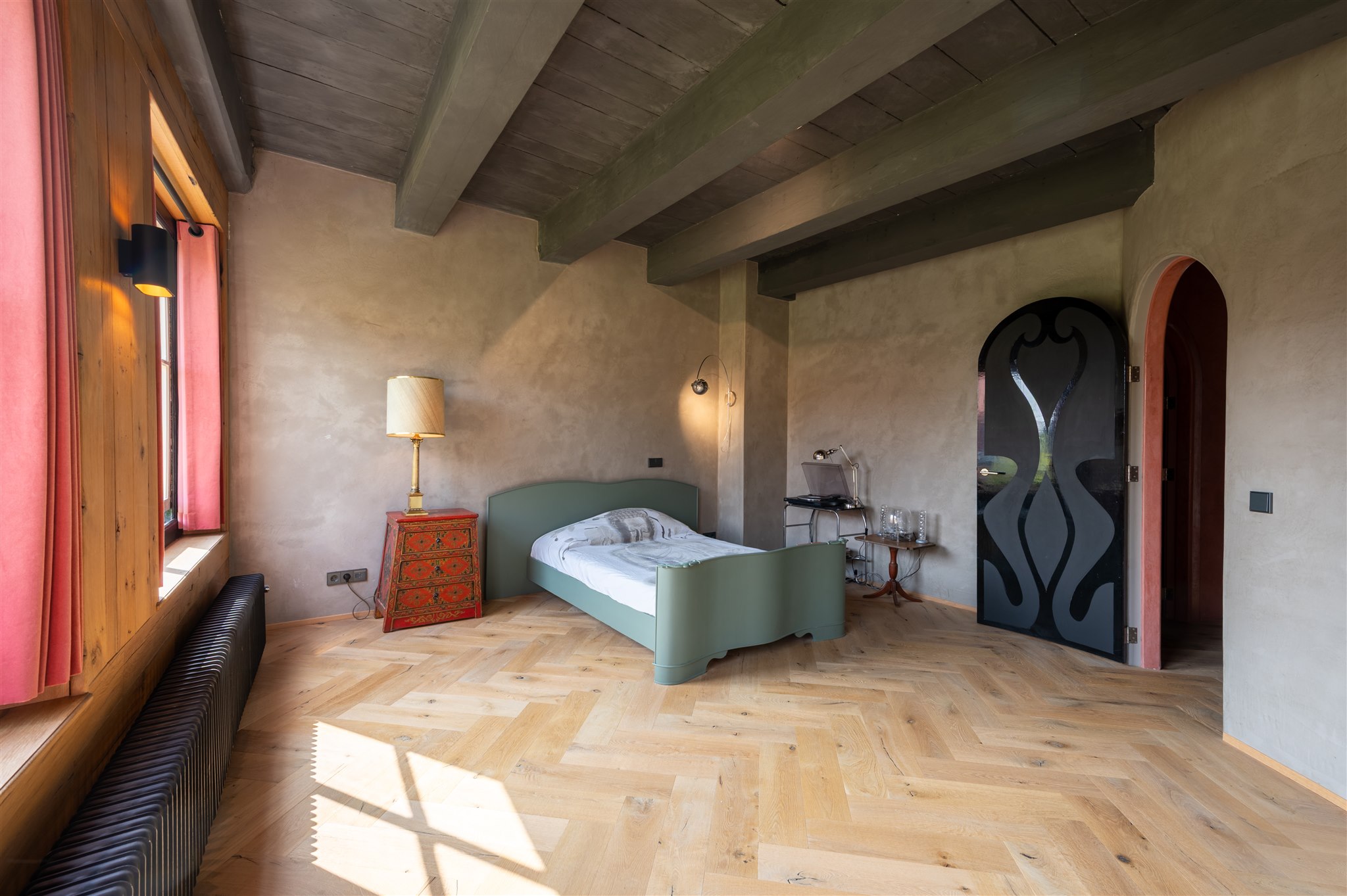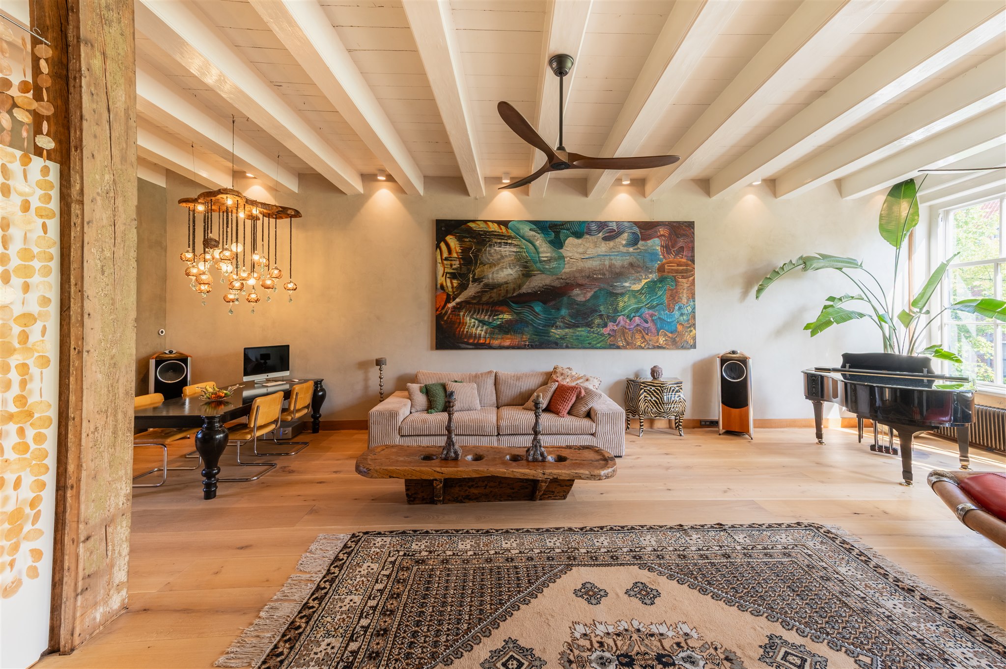 At the front: the grand living room with soaring four-metre ceilings, oak flooring, and a splendid view over the canal and the historic Armamentarium.