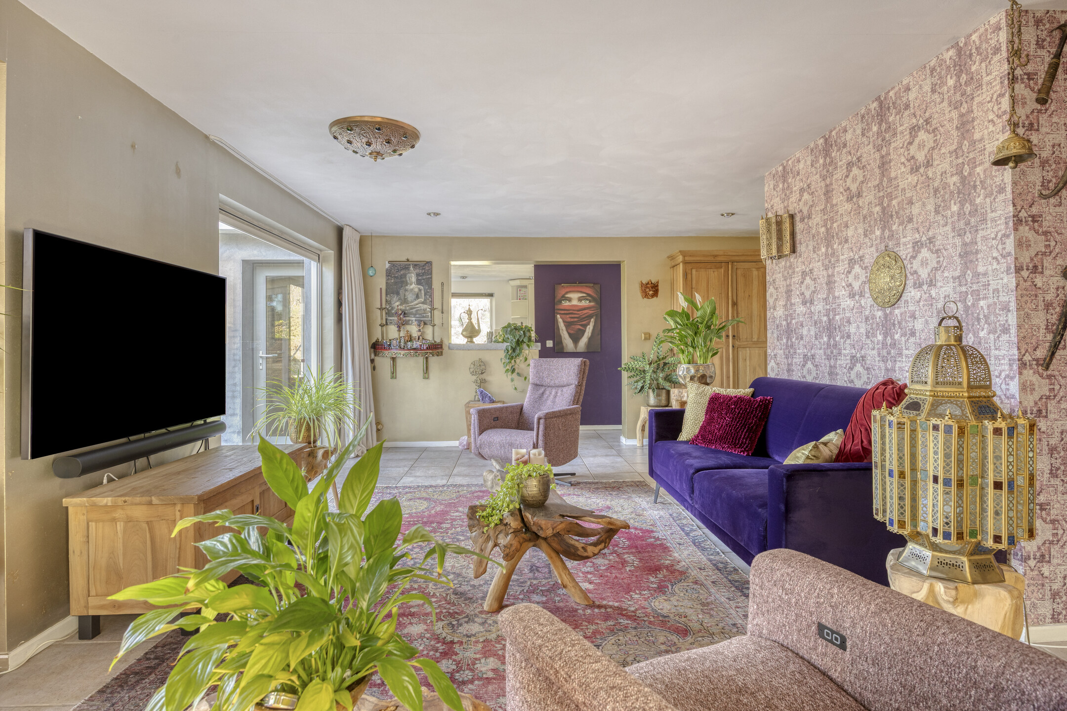 living room with air conditioning, staircase cupboard with hatch to the tiled cellar and open access to the conservatory with gas fireplace, skylight and glass façade with garden doors overlooking the garden and waterway;