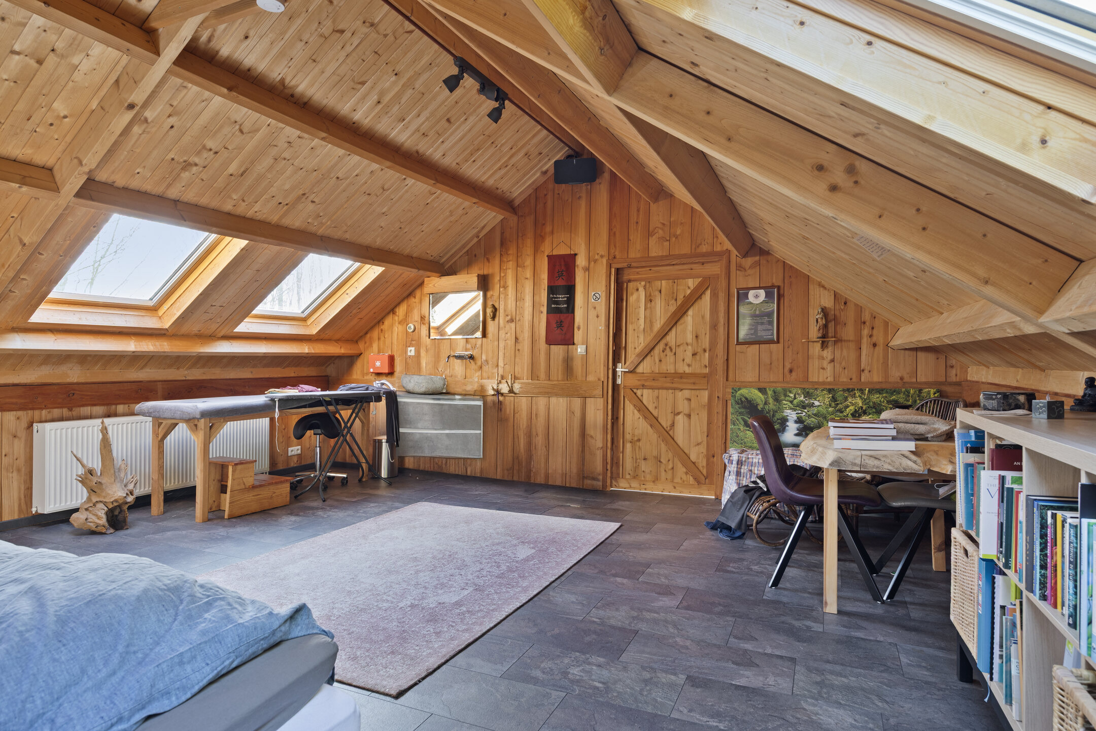 The outbuilding has recently been used for group sessions and has also been rented out via natuurhuisje.nl. The layout is practical and complete with on the ground floor a spacious living room/group area, a full kitchen and bathroom. On the first floor there is a landing with washing machine and dryer connections, its own central heating system and a second (bed)room equipped with air conditioning.