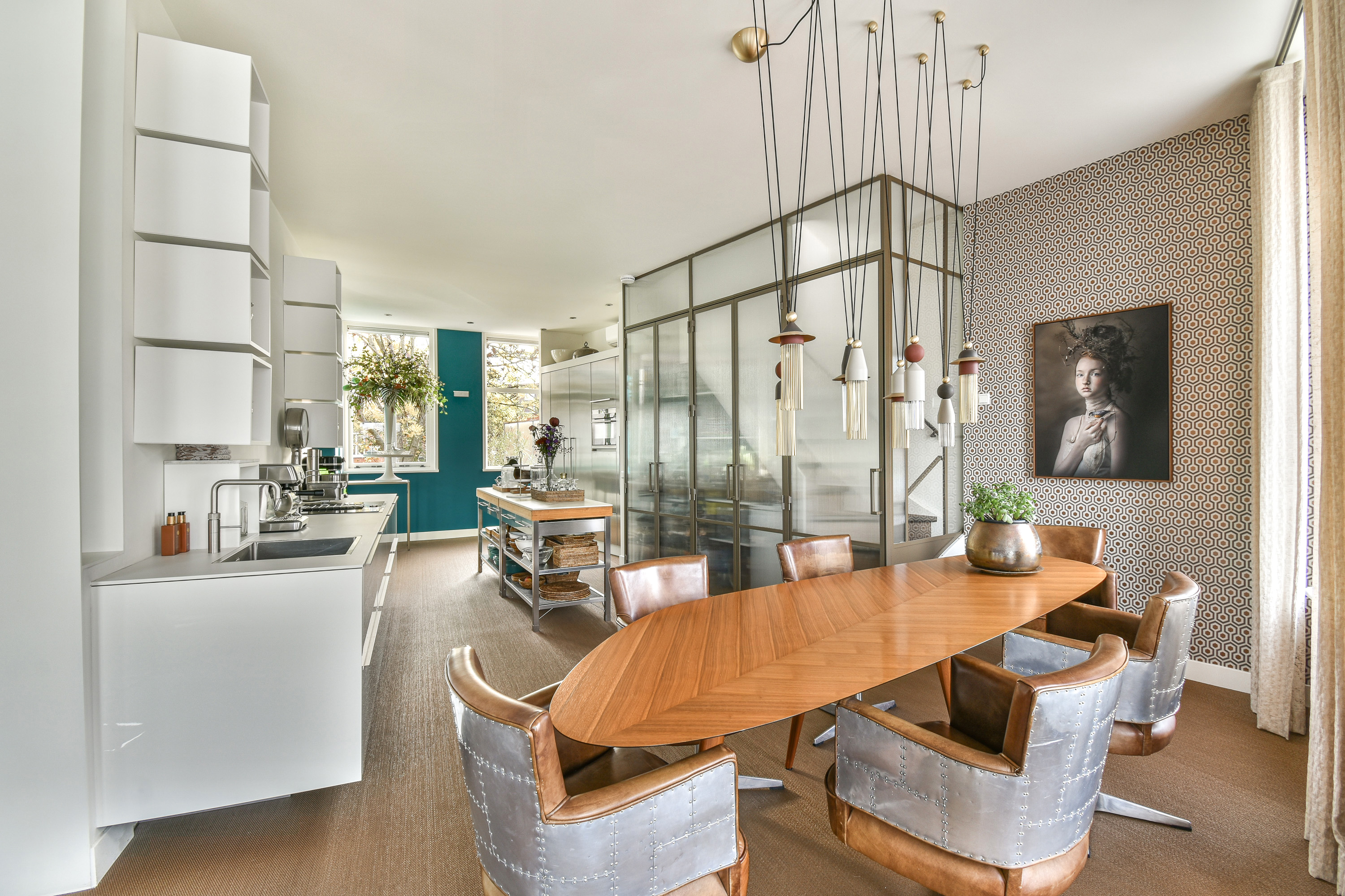 The kitchen, positioned on the terrace side, is appointed to a luxury standard and equipped with high-end built-in appliances, including a separate refrigerator and freezer, dishwasher, Quooker hot-water tap, induction cooktop with integrated extractor, and combination microwave oven. An air-conditioning unit ensures optimal climate comfort.