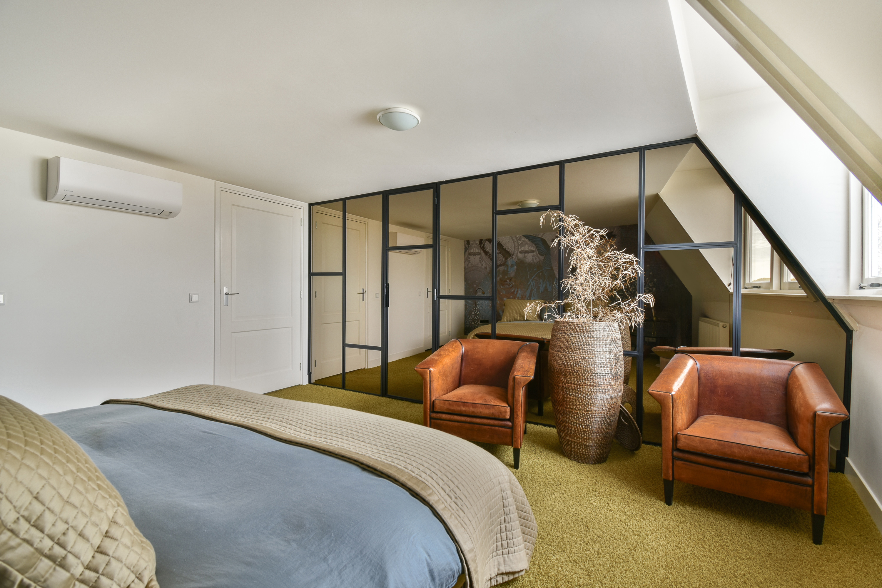 A spacious bedroom with captivating river views, featuring two walk-in wardrobes of approximately 4 m² and 6 m², and equipped with air conditioning.
