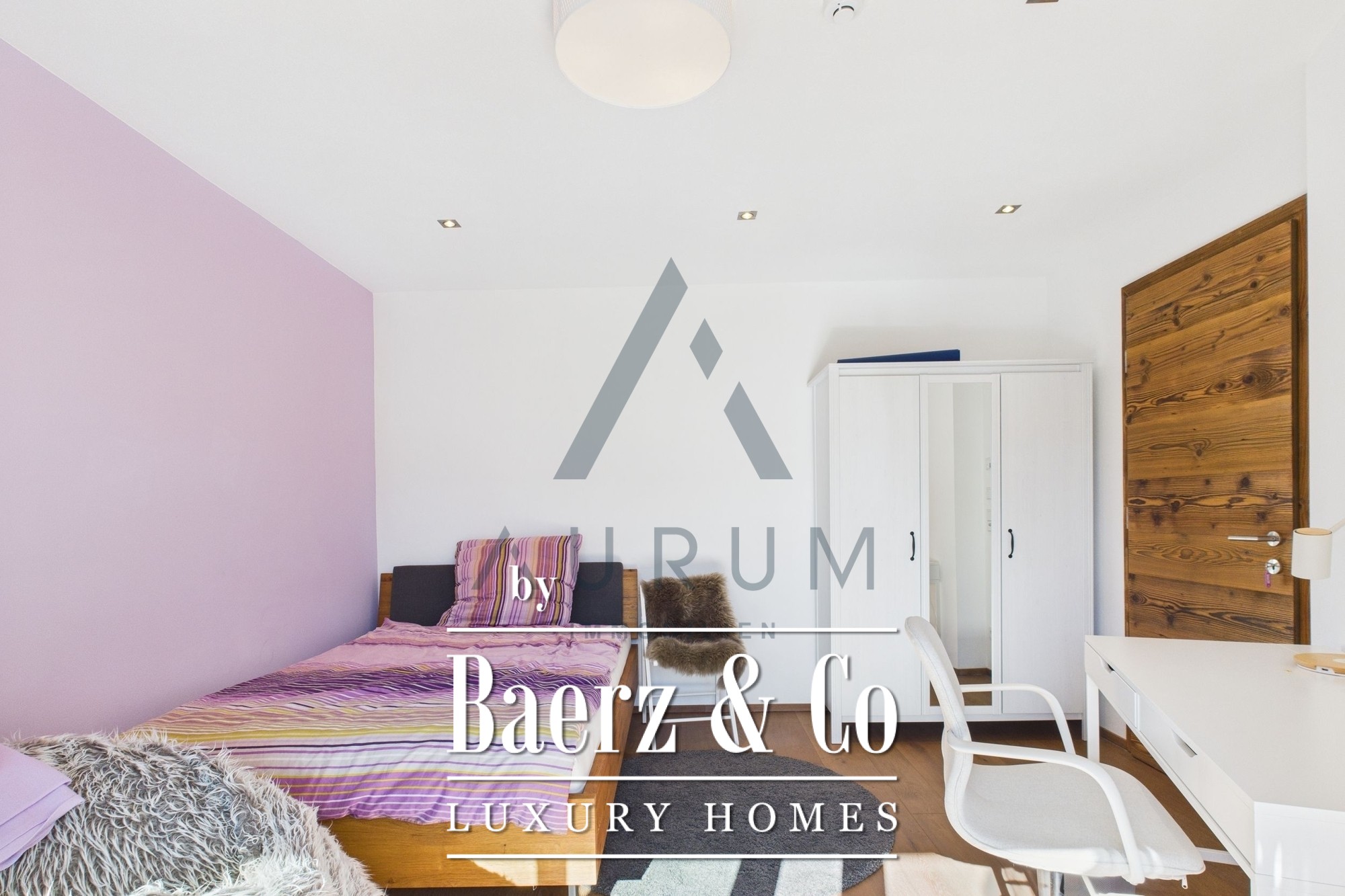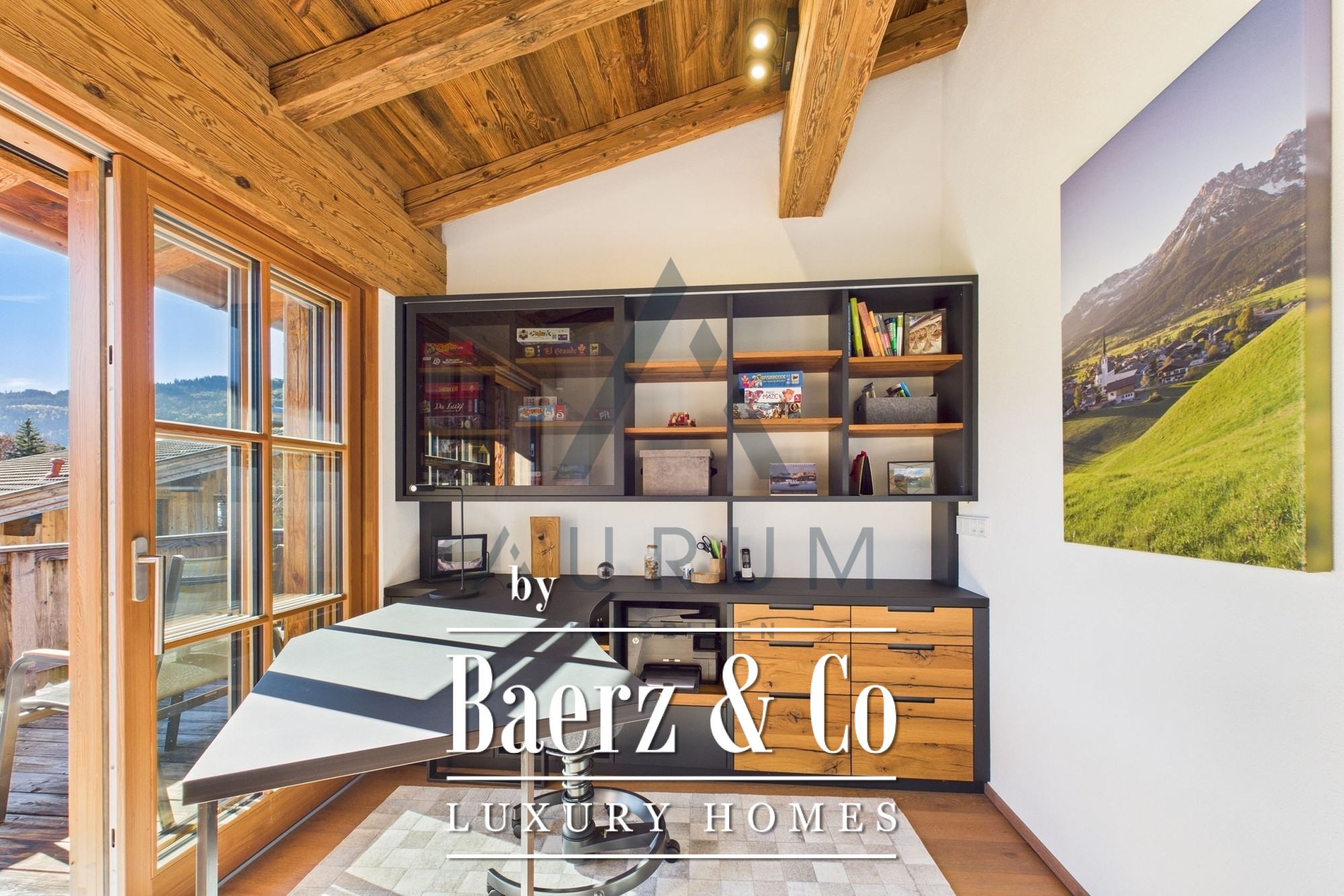 Within its 241 m² living area and 314 m² total usable space, four bedrooms and three bathrooms are complemented by two guest WCs, an office, and a wellness suite featuring a Klafs sauna with sanarium function. The open living, dining, and kitchen zone is underscored by exposed reclaimed wood roof trusses, an open fireplace, and seamless flow onto 172 m² of terraces and balconies. Finishes include oak flooring, electric blinds, and a fitted kitchen equipped with appliances from Gaggenau, Miele, and Bora.