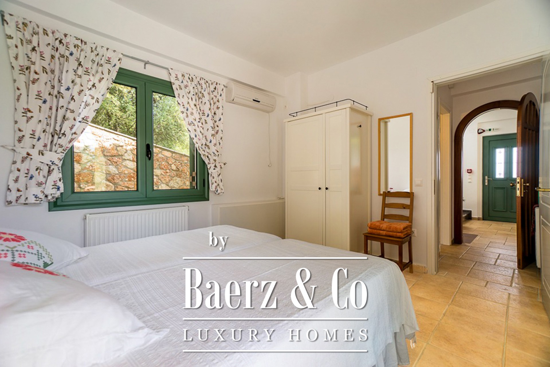 Distinctive features include underfloor heating in selected areas, air conditioning in all bedrooms and the guest apartment, a granite staircase, fireplace, and a fully equipped kitchen. Three private parking spaces and two shared spaces are provided within a legally defined co-ownership structure. The villa’s setting is peaceful yet accessible, with paved access and a landscape of mountain and nature views enhancing the sense of openness. Suitable for private residence or rental activity, Villa Ellomeno offers timeless quality and considered design on the Ionian coast.