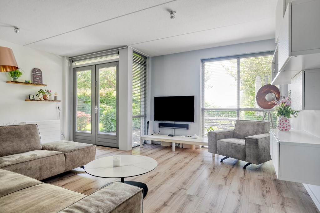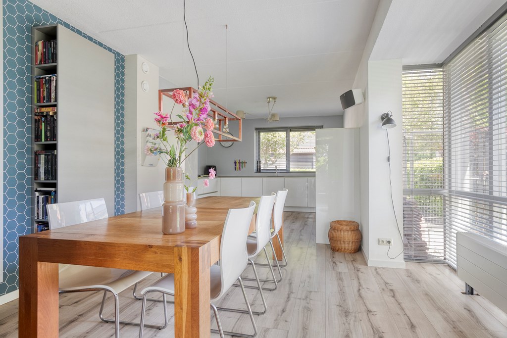 French doors from the living room open to the deep, green back garden that borders the floodplains—the true highlight of this property. The garden is beautifully laid out with a mix of paving and greenery and offers plenty of room for a lounge set or outdoor dining table. Its orientation allows you to make the most of the sun throughout the day. At the back of the garden is a charming covered terrace (with internet connection), perfect for sitting and/or working outdoors even on less sunny days. The garden offers excellent privacy and forms a true oasis of calm.