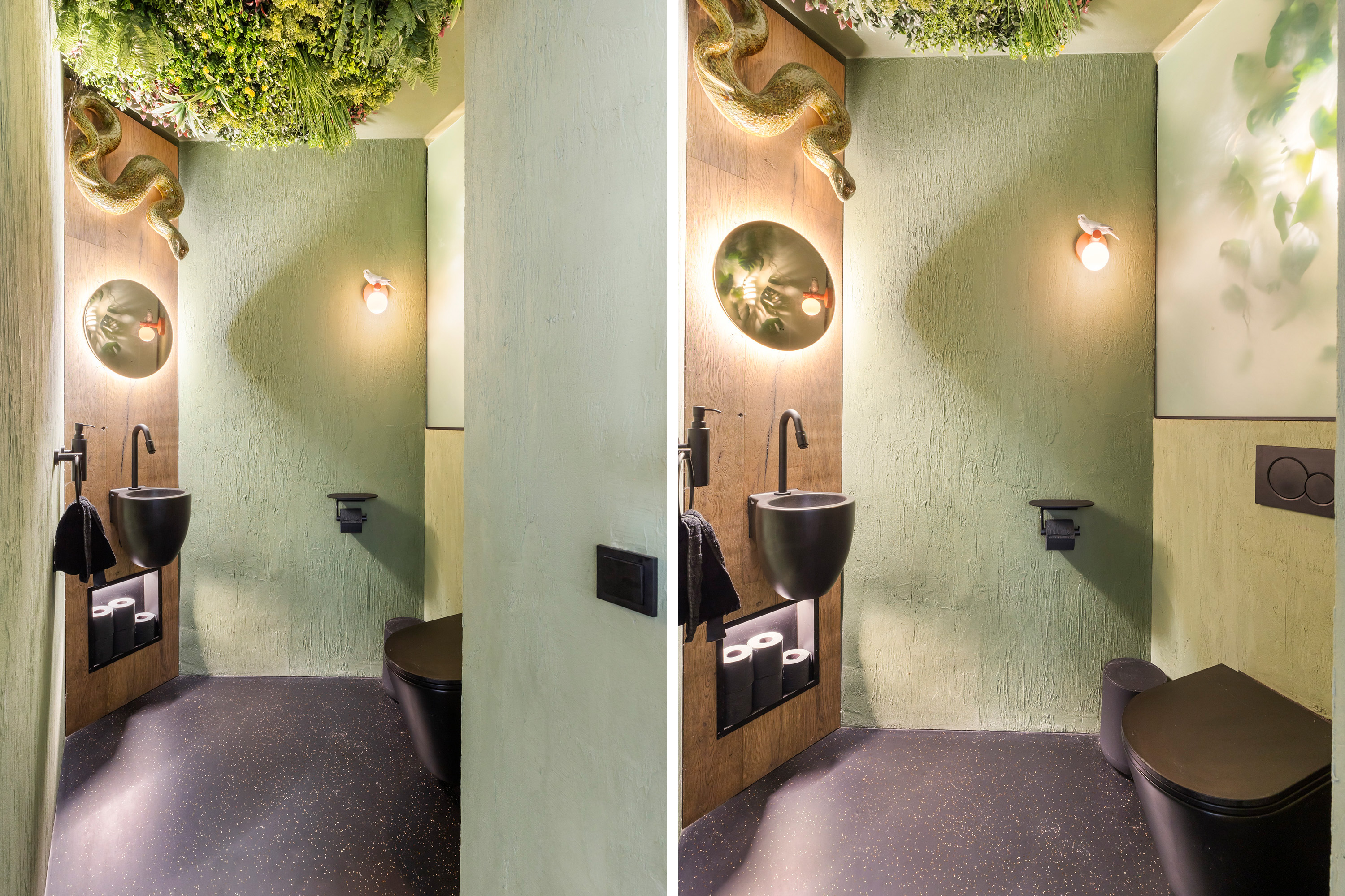The adjoining 445 m² commercial building offers countless possibilities: an atelier, gallery, showroom, office or workshop. Its soaring ridge height with black timber trusses, generous proportions and large windows create a striking atmosphere of craftsmanship and character. The building includes its own entrance, office, pantry and WC. The mezzanine floor offers further space for guest accommodation, an atelier or workspace.