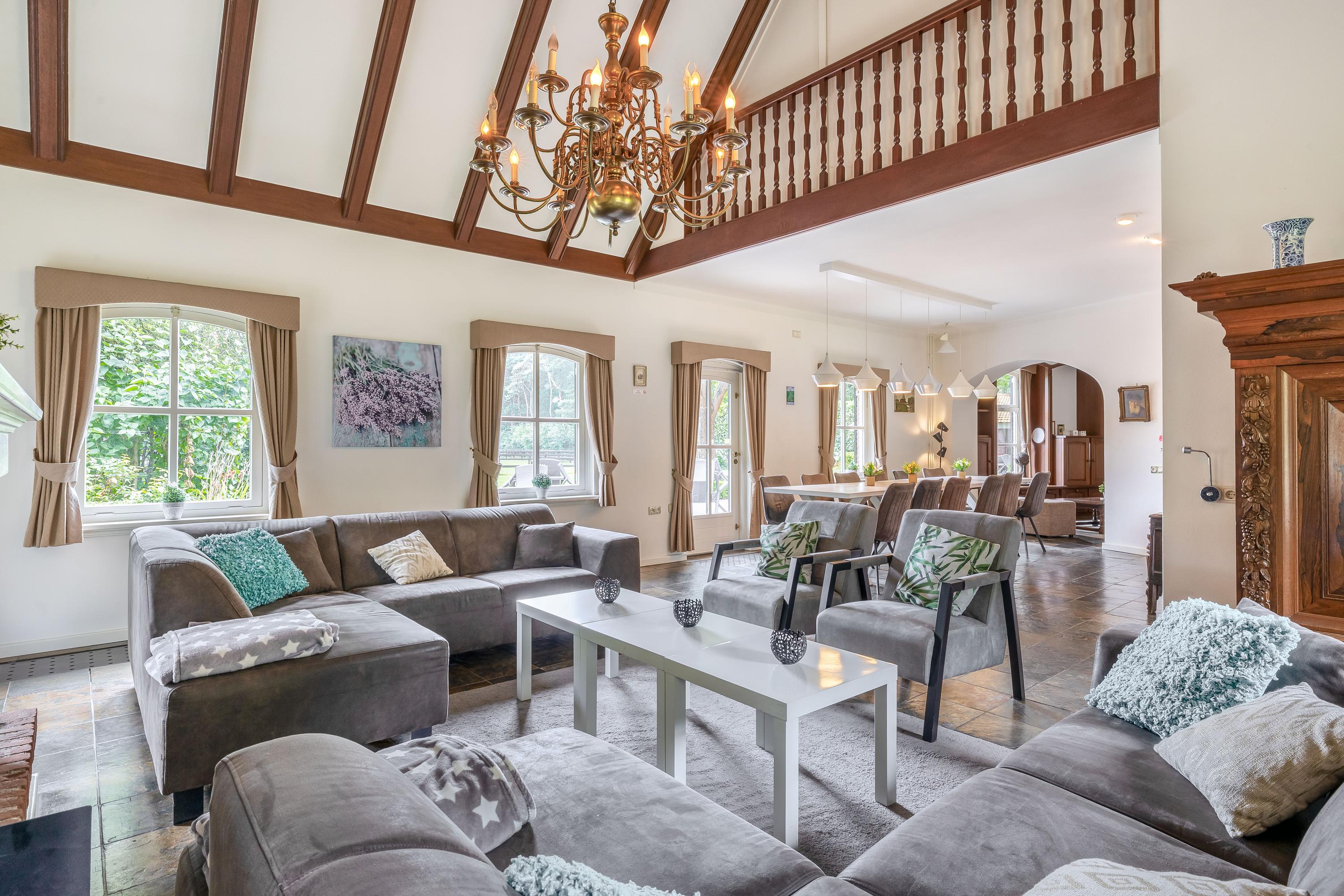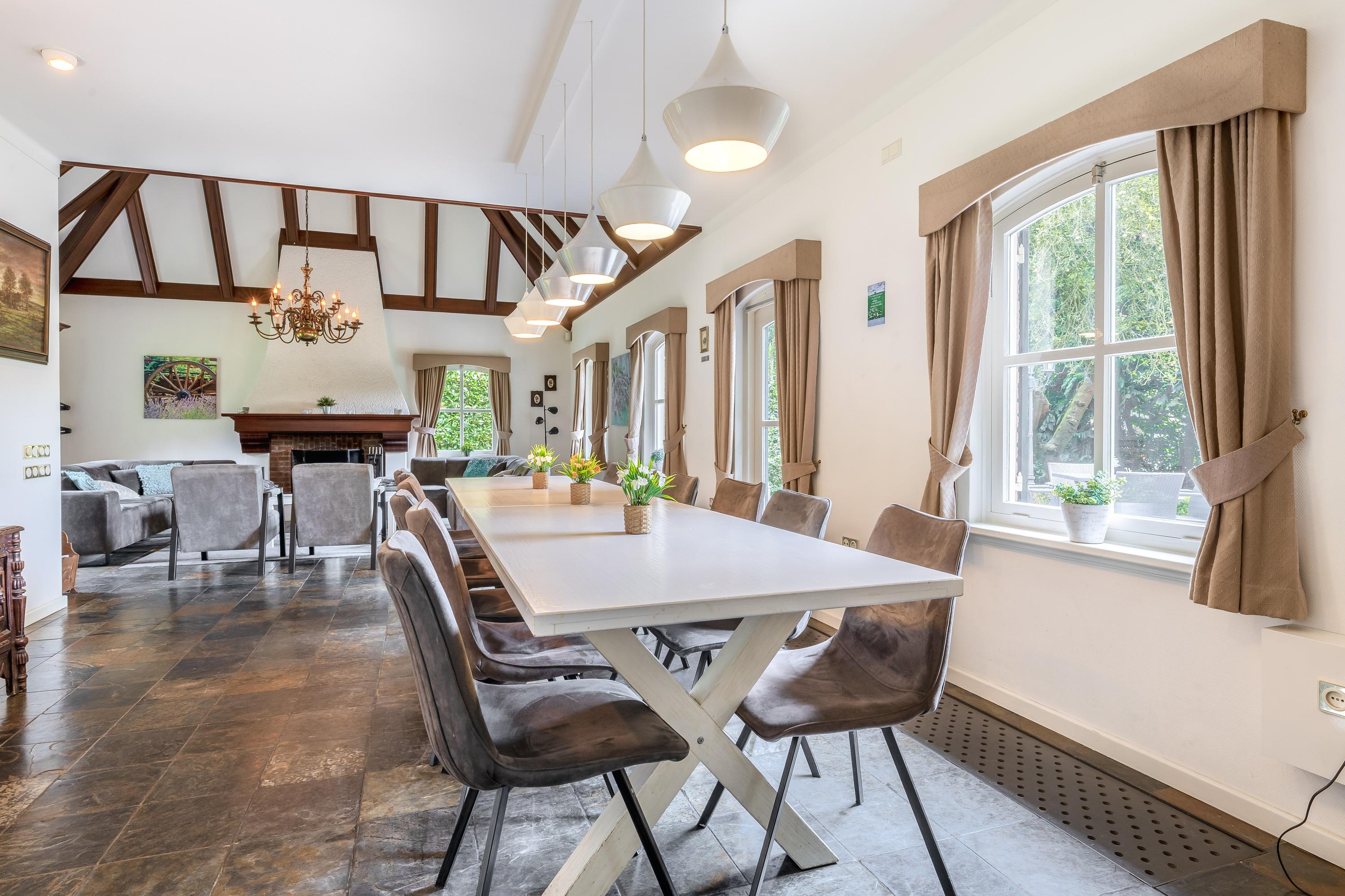The country house exudes atmosphere and comfort. On the ground floor, you will find an impressive entrance hall with a mezzanine, a spacious living room with a sitting area with a cosy fireplace, a dining area and a separate television room, a spacious kitchen, a utility room and a bedroom with an en-suite bathroom. Authentic details such as wooden beamed ceilings and natural stone floors enhance the rural character. On the first floor are four large bedrooms, one with an en-suite bathroom, a second bathroom and a separate toilet. All rooms have natural light, washbasins and two bedrooms have built-in wardrobes – ideal for guest accommodation or family living. In the basement you will find even more space: an extra bedroom, a recreation/party/hobby room with bar, bathroom, storage room, central heating system and separate entrance to the outside. This makes the basement ideal as guest accommodation or a practice space.