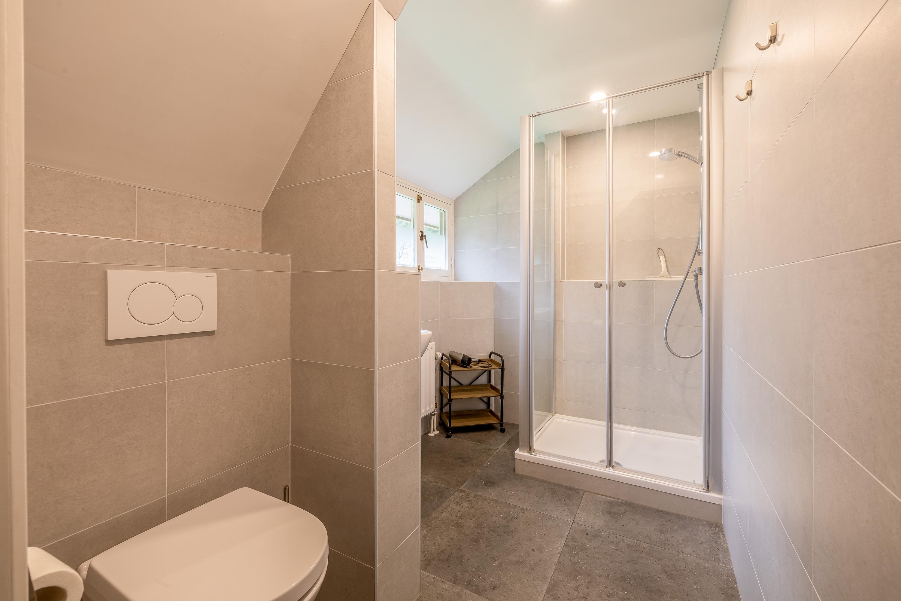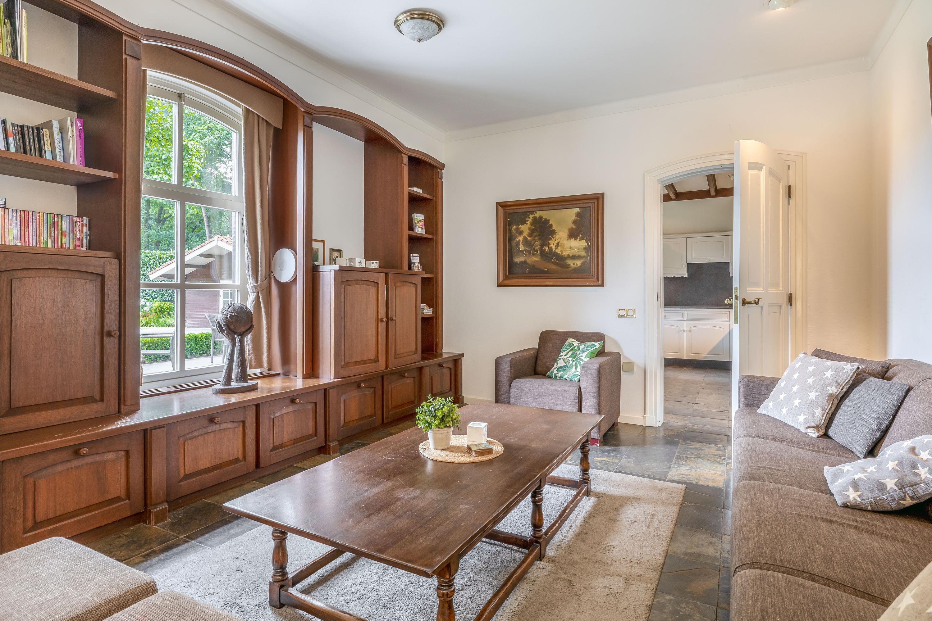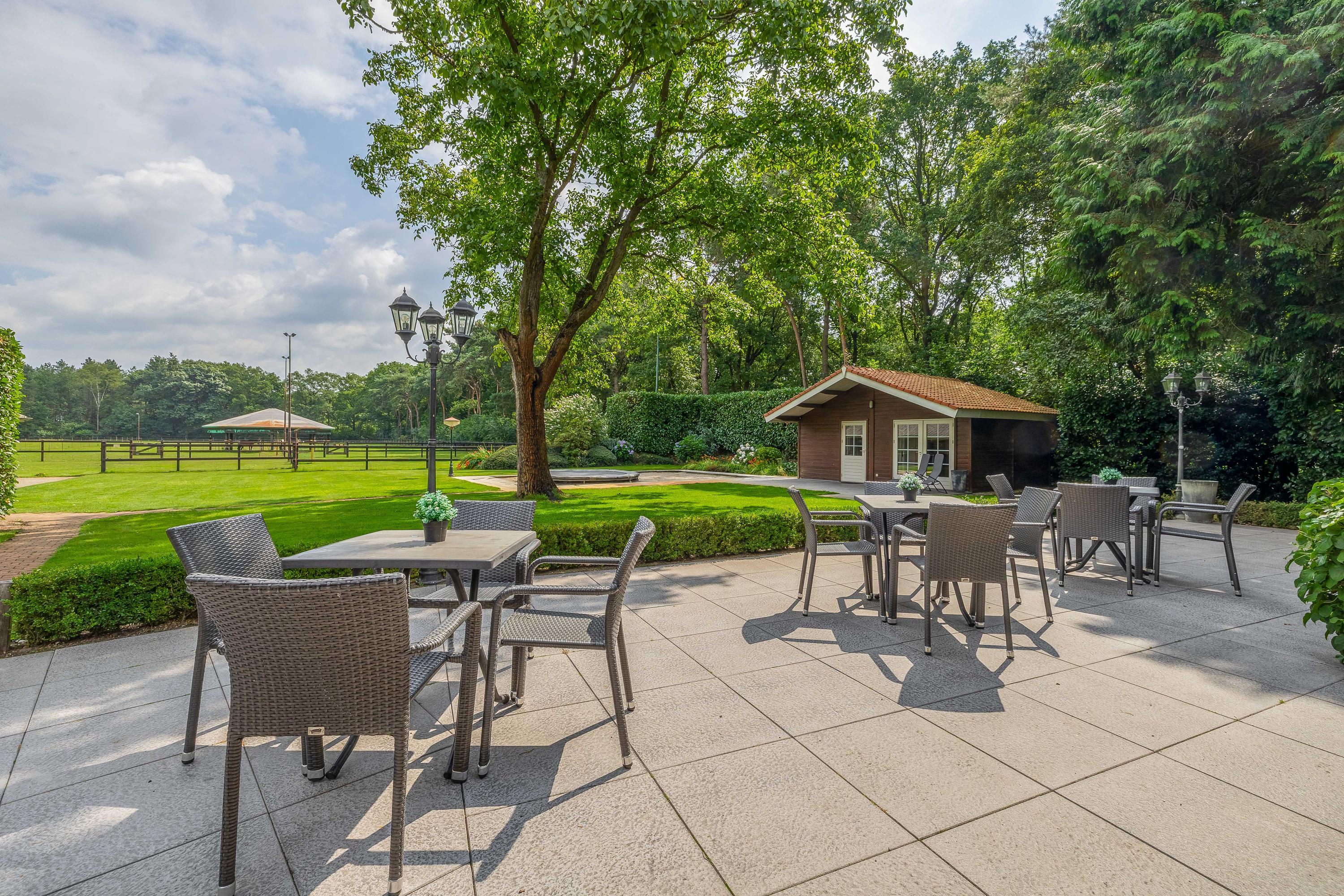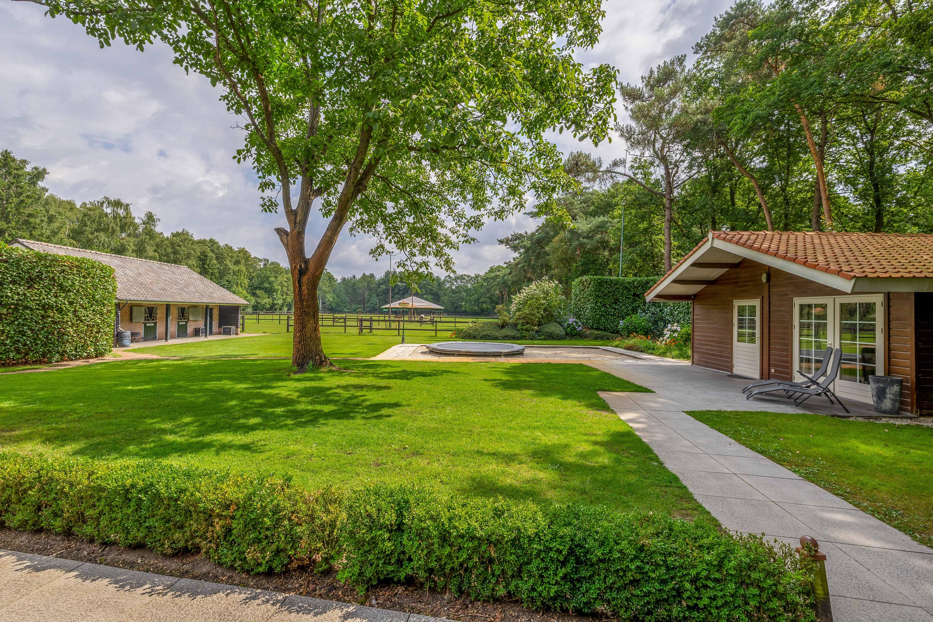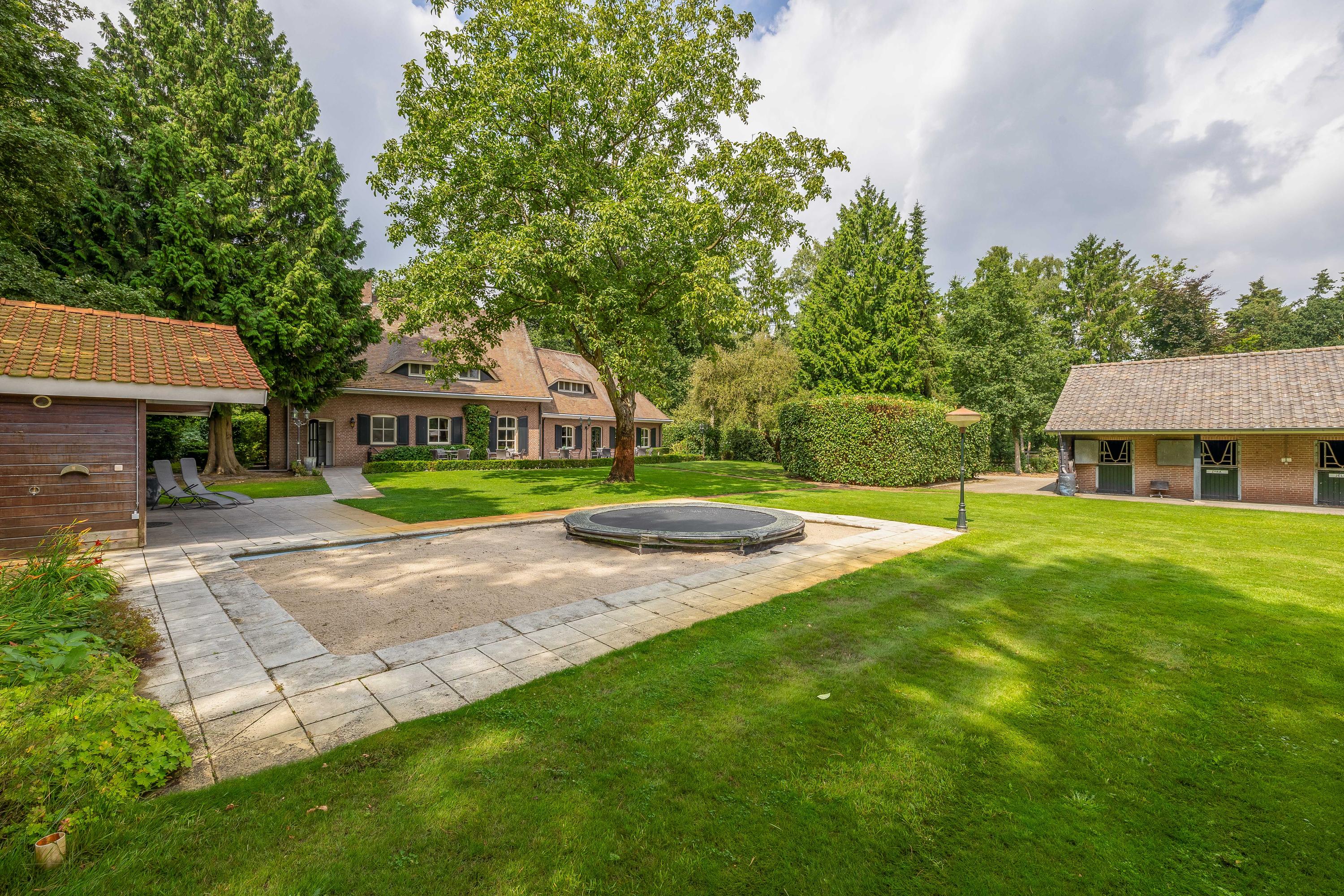 Surrounding the house is a beautifully landscaped garden with a large terrace, playground, mature trees and plants, and a beautiful view of the adjacent meadows. The garden shed has been converted into a wellness area with a sauna, relaxation room, bathroom and toilet – a perfect place to relax. The former swimming pool is currently used as a sandpit with a trampoline, but can easily be restored to its former glory. The garden blends seamlessly into the surrounding private woods, ideal for a walk or a ride on your own property.