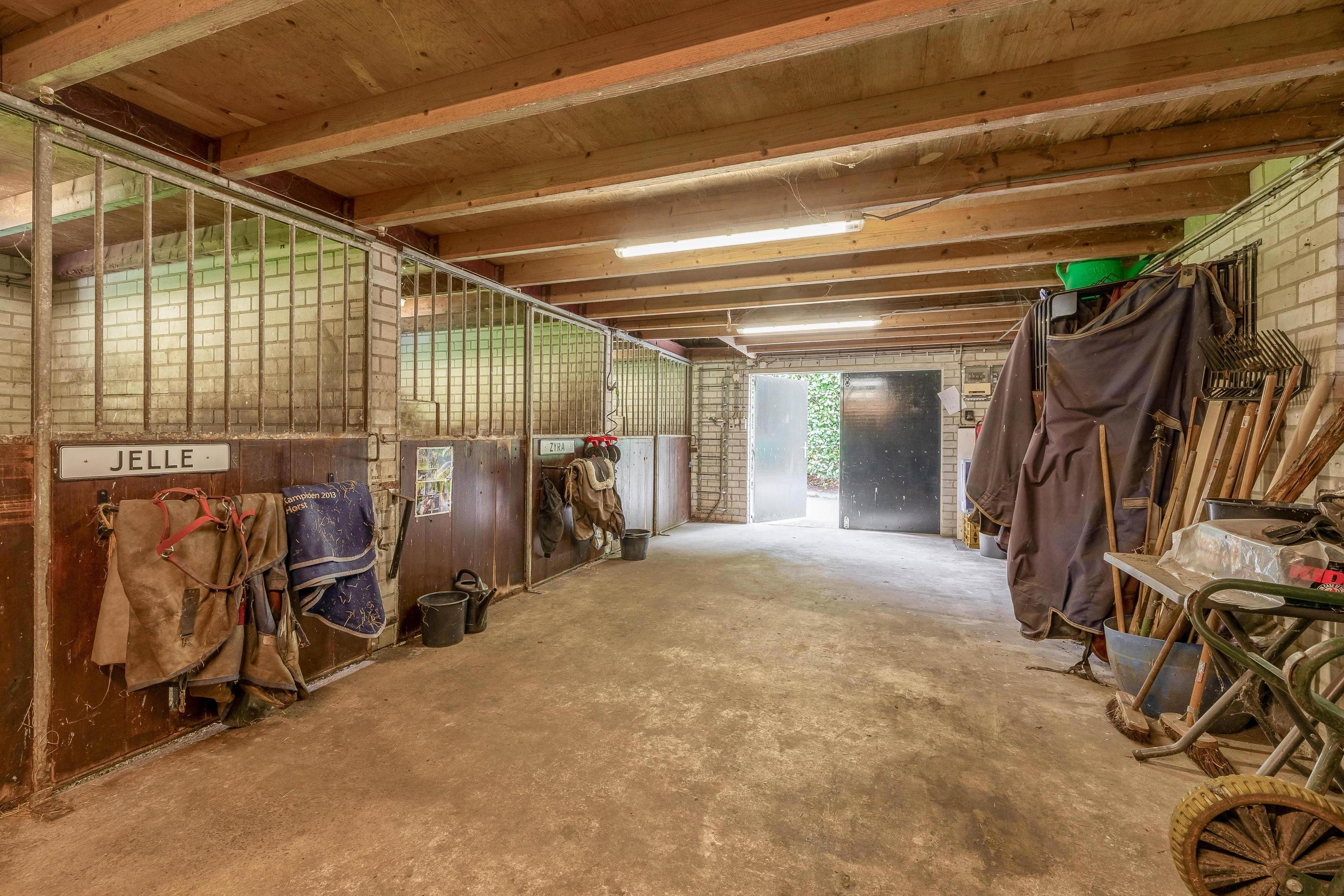The detached horse stable has five stalls with outdoor hatches and weave racks, a hayloft, pasture access and additional facilities such as a shelter and a drained outdoor arena (20 x 40 metres) with professional flooring. Everything has been taken care of down to the last detail, including lighting, sprinklers and fencing.