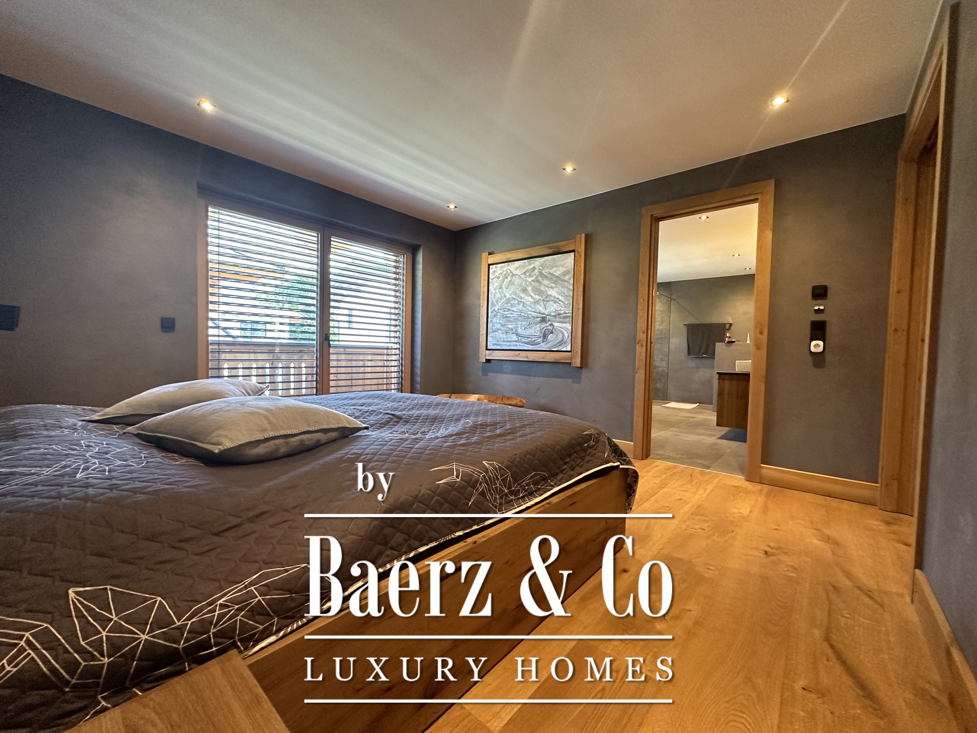 Entry is provided through the lower level, where a generous cloakroom, double garage and ample storage accommodate alpine living. The wellness suite with sauna, fitness area, shower and technical amenities further emphasizes the chalet’s commitment to comfort. A lift links all levels, ensuring seamless movement throughout the residence.