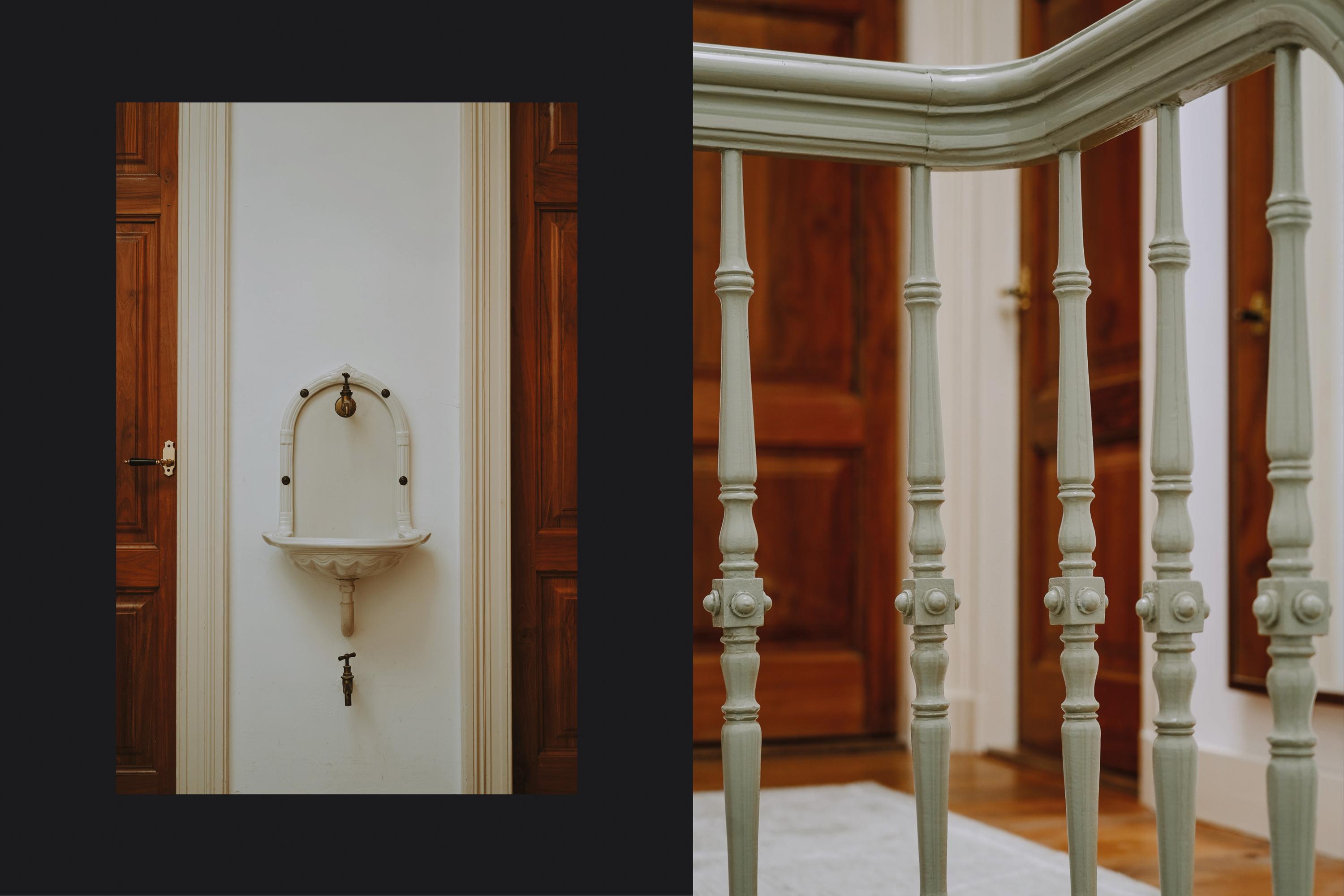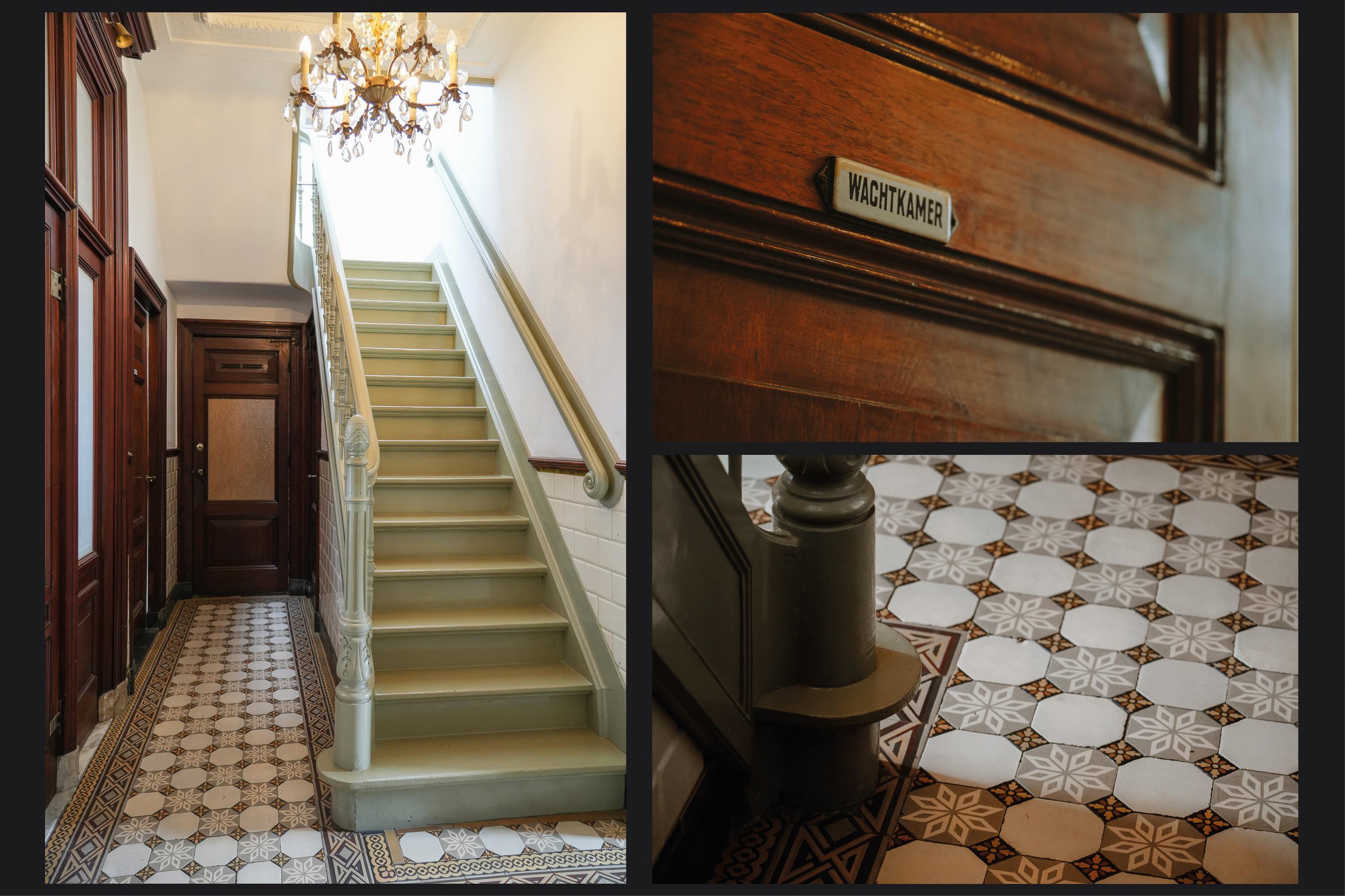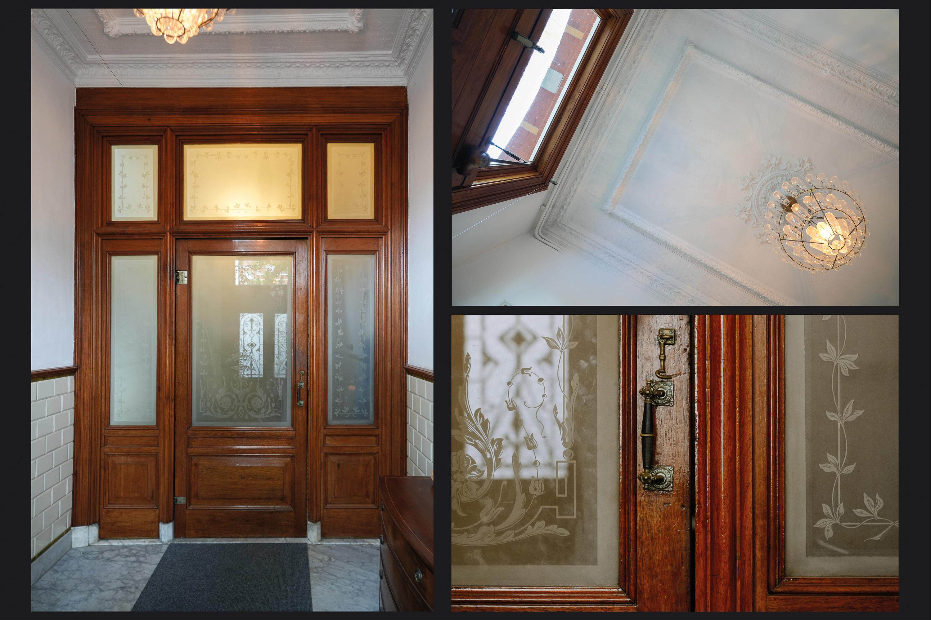 Behind the elegant façade, the original panelled front door opens into a vestibule of rare grandeur — with its high ornamental ceiling, finely detailed woodwork, and beautifully preserved etched glass. The marble floor and original wall tiles remain intact.