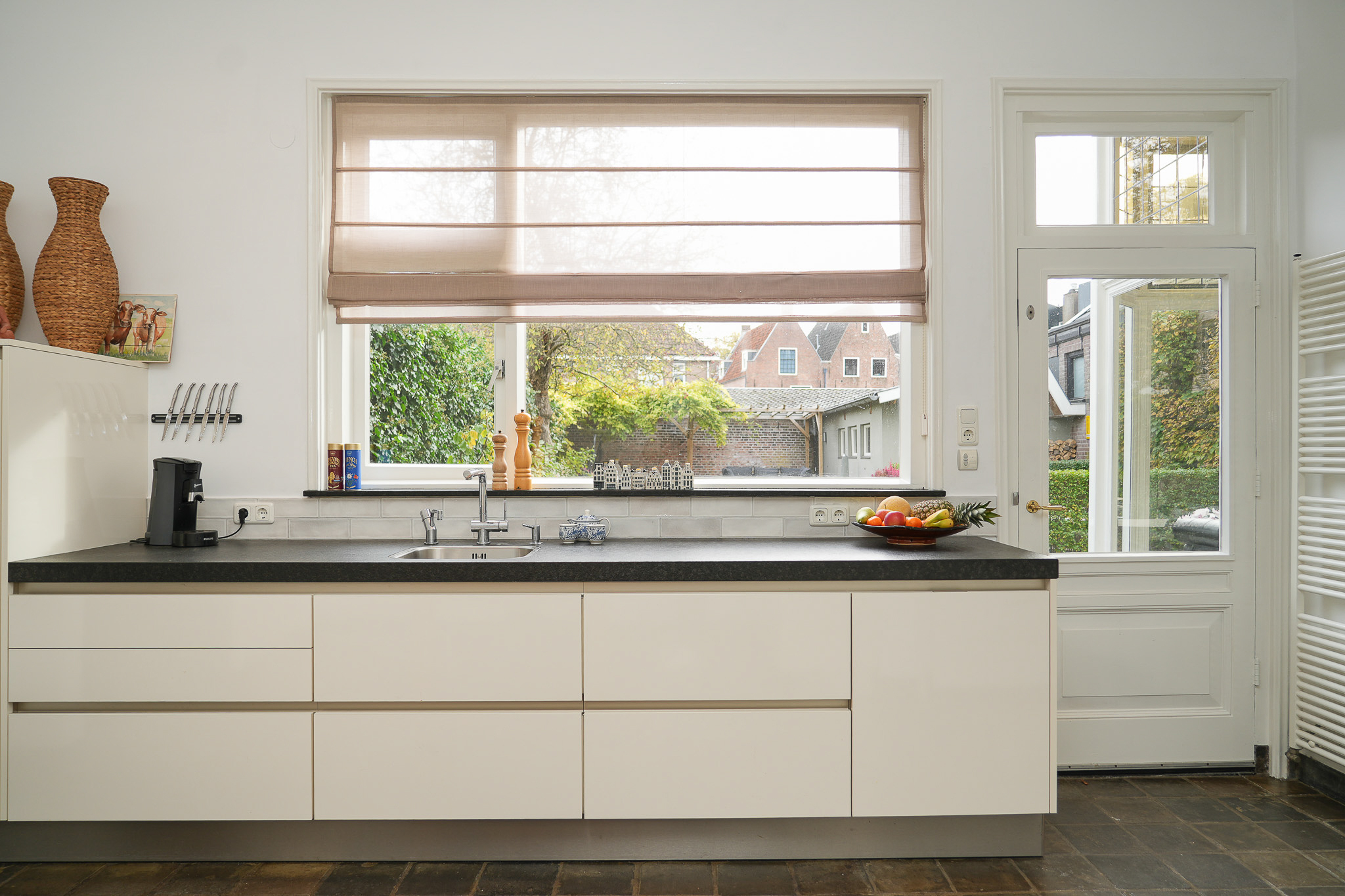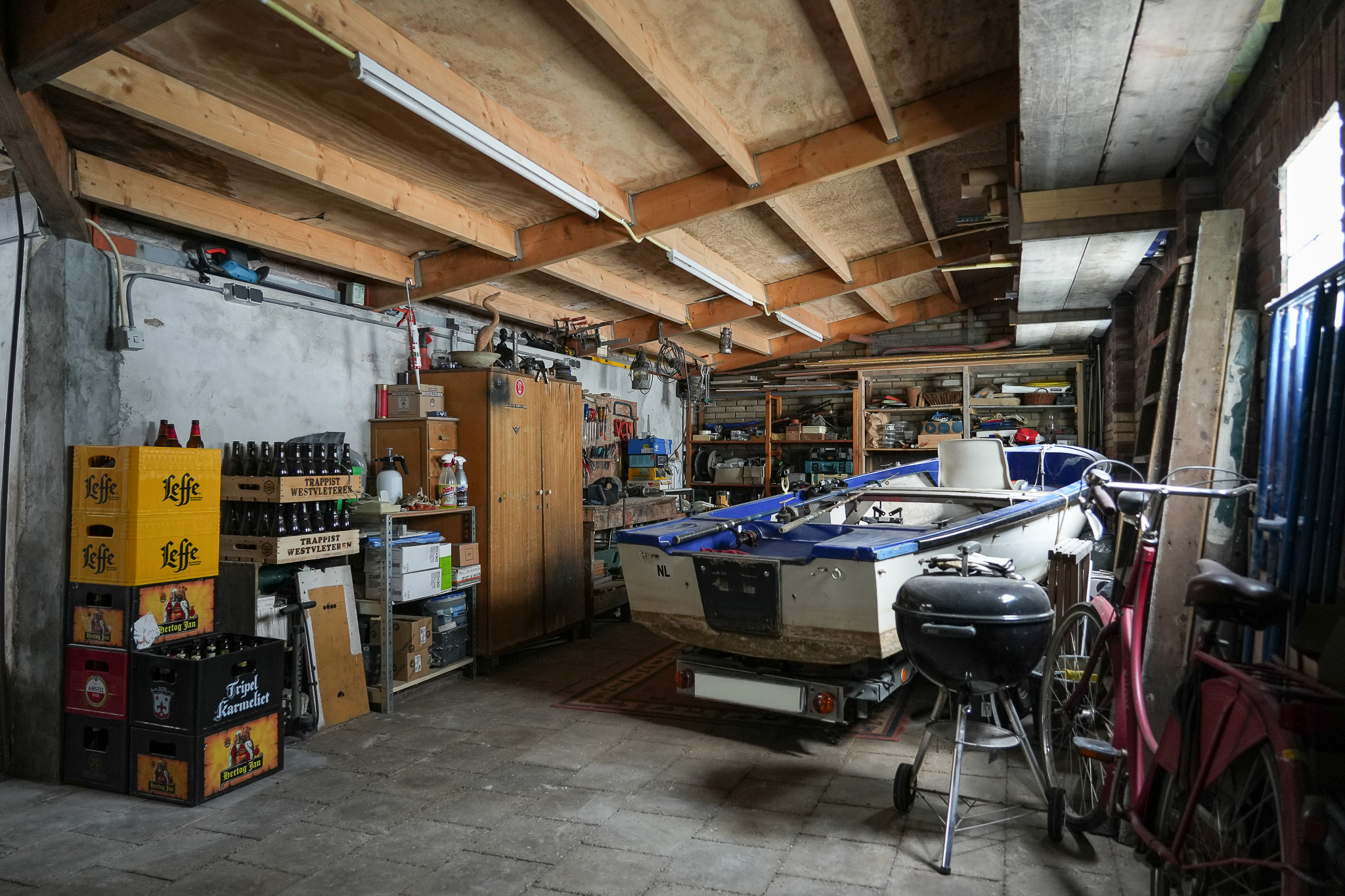 Behind the house lies a unique garden, 9.5 metres wide and 15 metres deep, facing east and south — offering both sunny and shaded spots throughout the day. In 2021, the owners were able to extend the plot, creating space for a large, tiled outbuilding (59 m²). This building is ideal for use as a garage for a classic car or boat, or as an artist’s studio. The double doors open onto the private parking area behind the house.