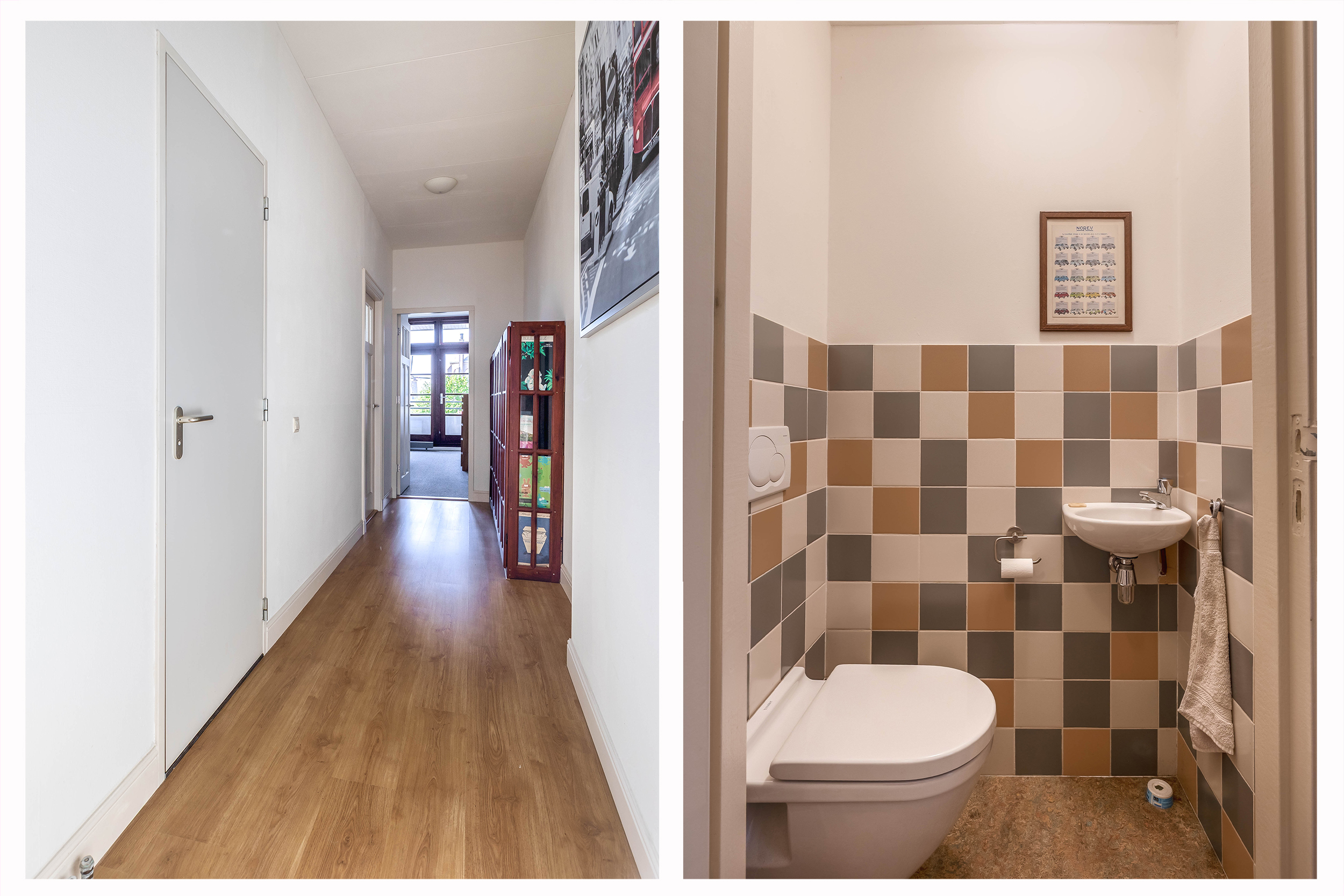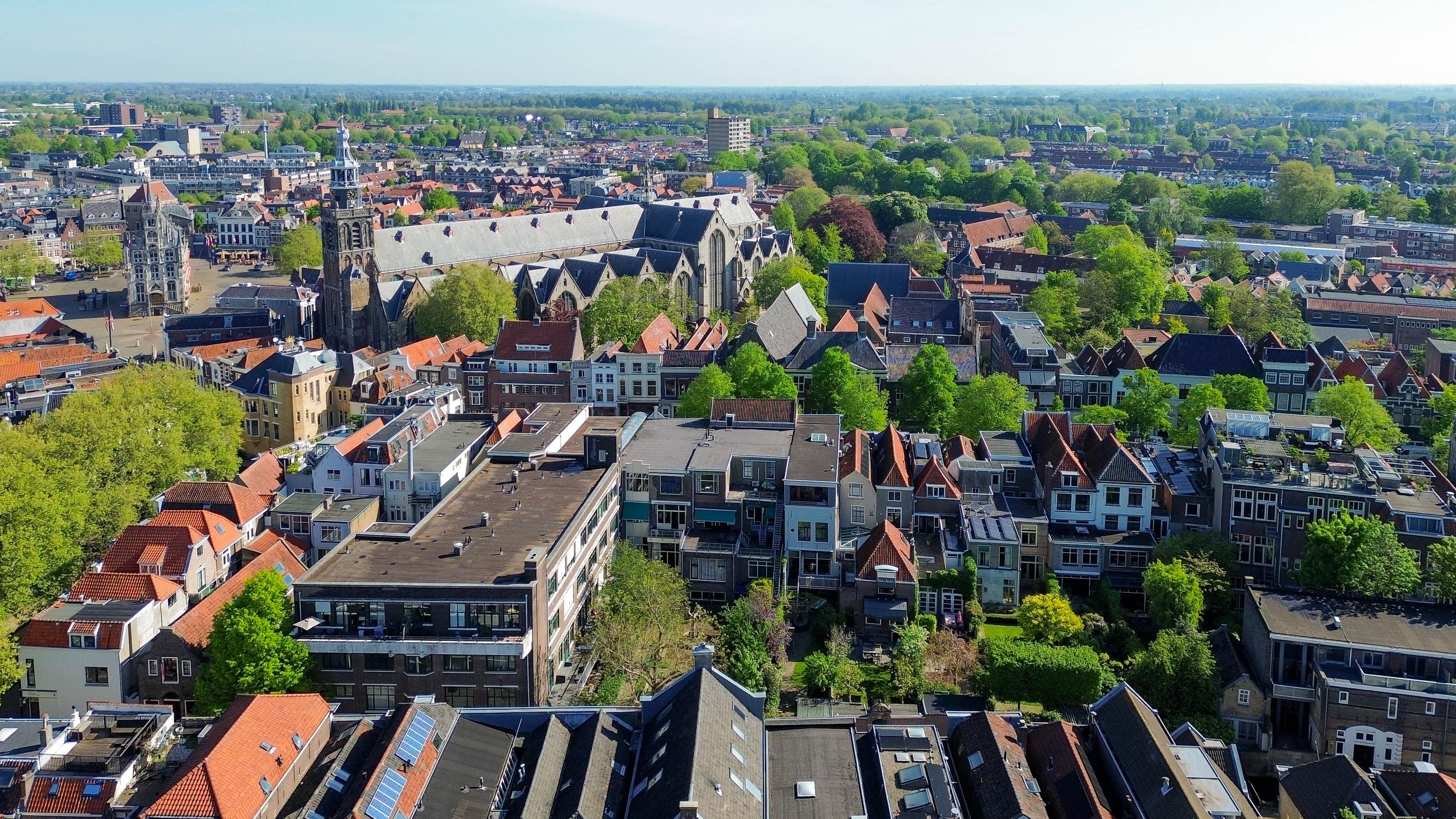 Rear bedroom with new rear façade and door to terrace with stunning view over the historic buildings of Gouda’s city center, bedroom with built-in wardrobe, air conditioning, boiler room, and front bedroom with view of the museum and St. John’s Church
