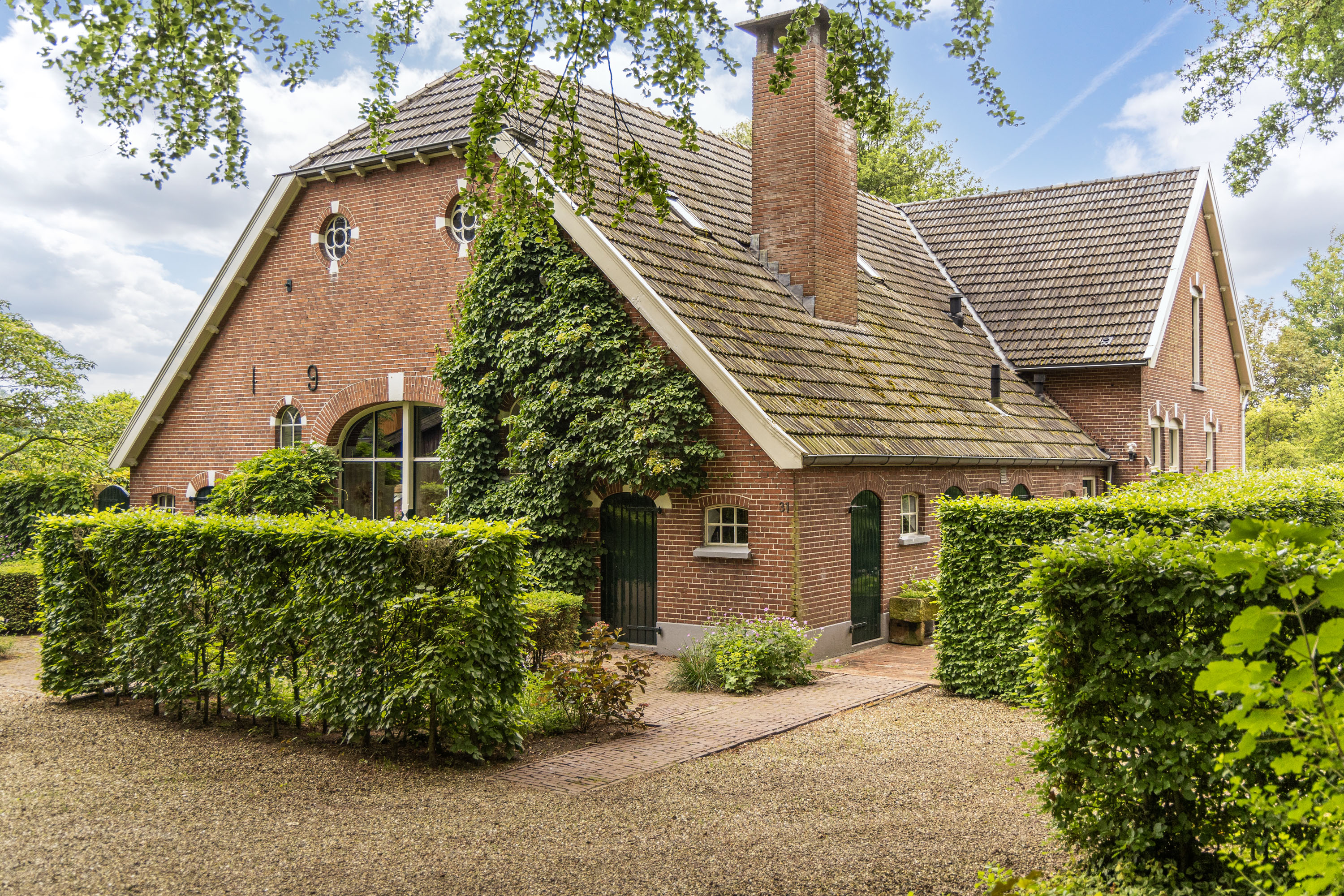 From the Hasseltweg, visitors are guided via the oak-lined driveway to this beautiful farmyard. There is ample space to park several cars. The house is surrounded by a green oasis of various hedges and partitions, all laid out based on a design by internationally renowned landscape architect Piet Oudolf. He transformed the wide, fan-shaped plot into a true paradise. There are multiple sitting areas, each separated with its own privacy and character. At any time of day, it is here for more than optimal enjoyment. The garden is intersected by a small ditch, creating a beautiful natural division: around the house is a landscaped area while the other side of the ditch is a nature meadow with various fruit trees (apple, pear, plum, and a lovely chestnut tree) and a pond where a family of deer raises their young in the tall grass every year. On a separate section of the property are 28 solar panels. The rear boundary is entirely natural with a few solitary trees or evergreen shrubs, allowing full enjoyment of the expansive views and a stunning sunset every evening.